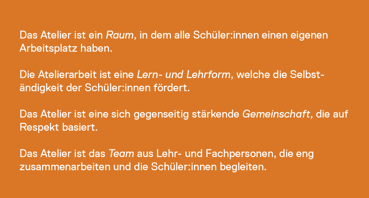 Wir haben Raum und Zeit umstrukturiert. Statt Klassenzimmern haben wir Lernateliers gebaut, in denen die Jugendlichen und ihre Lehrpersonen persönliche Arbeitsplätze haben. Acht bis zwölf Stunden in der Woche lernen sie hier selbständiges Arbeiten und werden dabei von Lehrpersonen begleitet.
