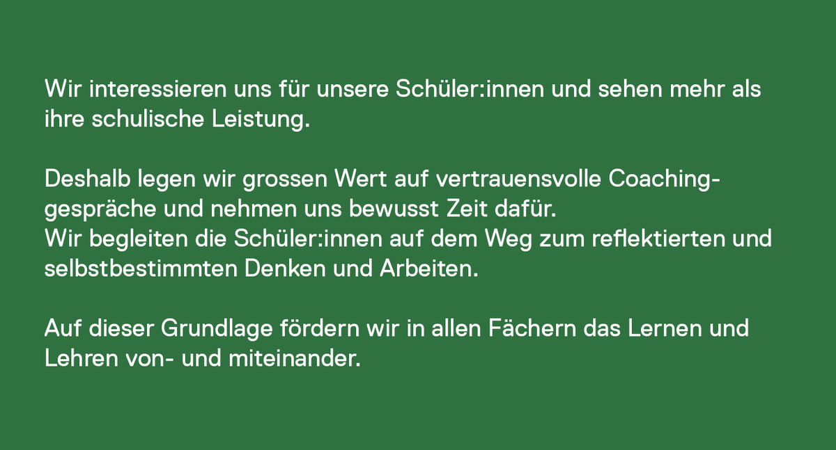 Um schulübergreifend ein hohes fachliches Wissen zu garantieren, das auf dem aktuellsten Stand ist, gibt es ferner für jedes Unterrichtsfach eine Fachschaft. Jede Lehrperson ist in einer dieser Fachschaften engagiert. Damit alle von ihrem Know-how profitieren können, wird Unterrichtsmaterial an unserer Schule standardisiert aufgearbeitet und zentral abgelegt.