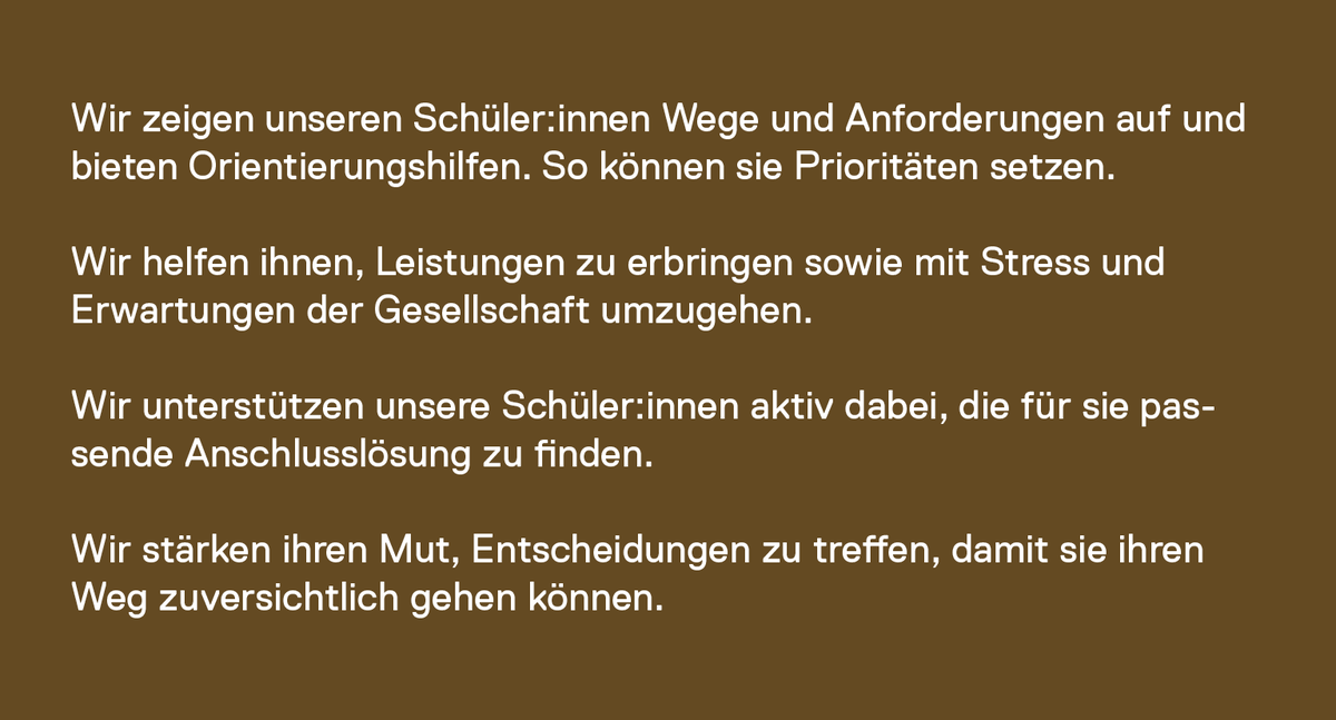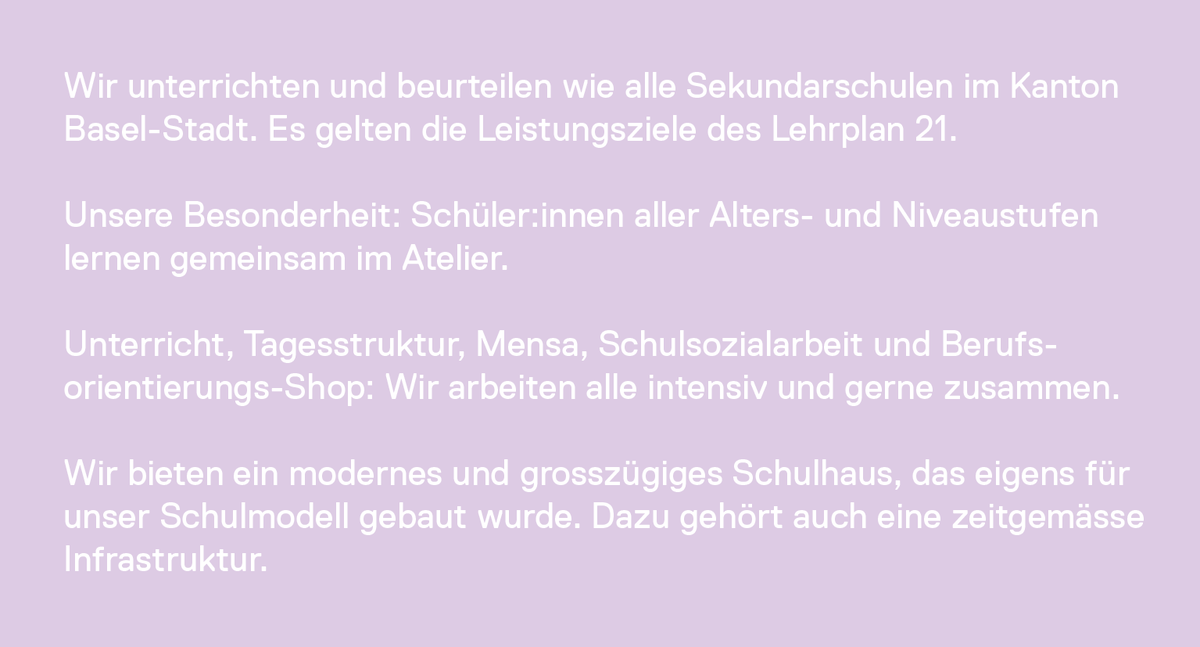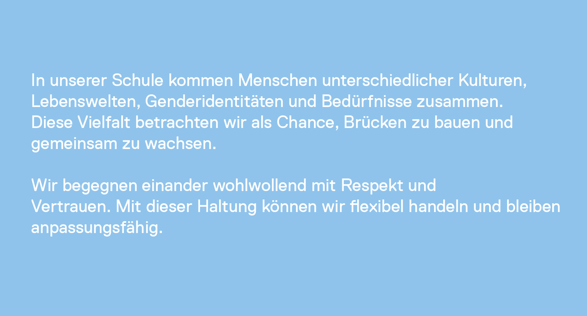 Jede/-r Jugendliche hat ihre/seine eigenen Stärken und Herausforderungen und zwar unabhängig von Niveauzuteilung, Alter und Geschlecht. Daher findet bei uns Unterricht immer entweder alters- oder niveaudurchmischt statt. Unsere Schule hat das Ziel, jeder/jedem dieser Jugendlichen möglichst gerecht zu werden. Wir wollen ihre Stärken stärken und sie beim Arbeiten an ihren Schwächen unterstützen. Nach drei Jahren sollen sie in der Lage sein, mit einem umfassend gefüllten Rucksack in die nachobligatorische Schulzeit übertreten zu können.