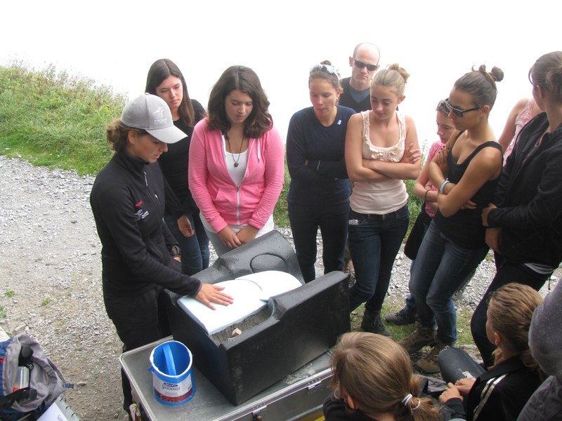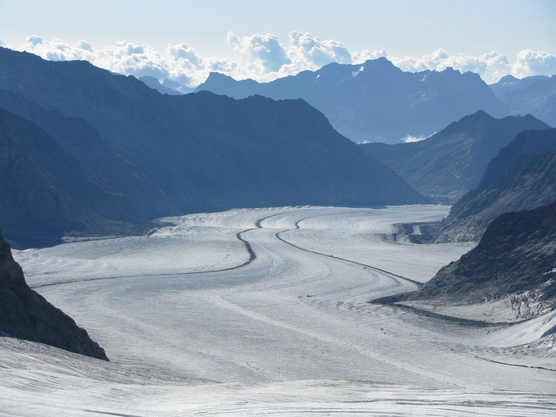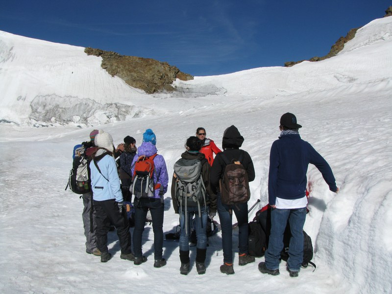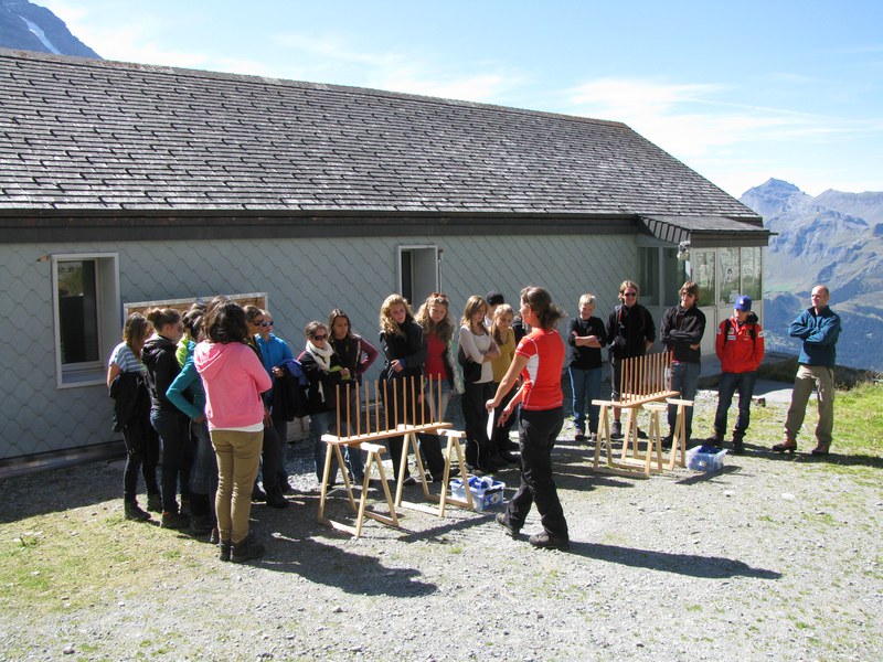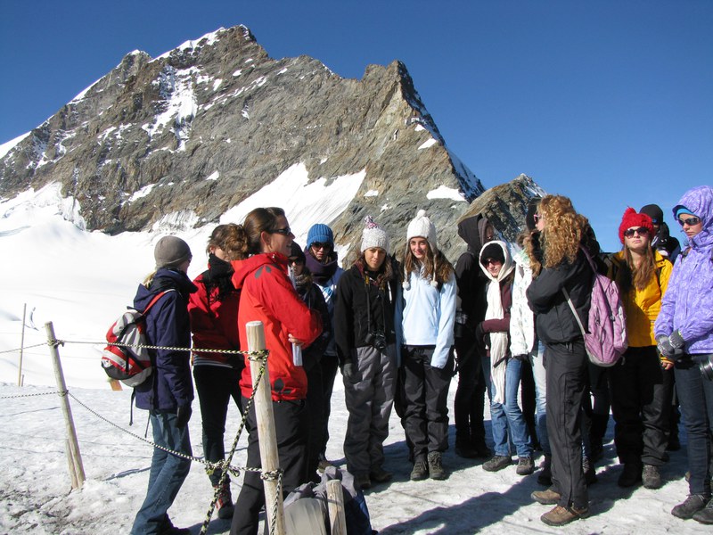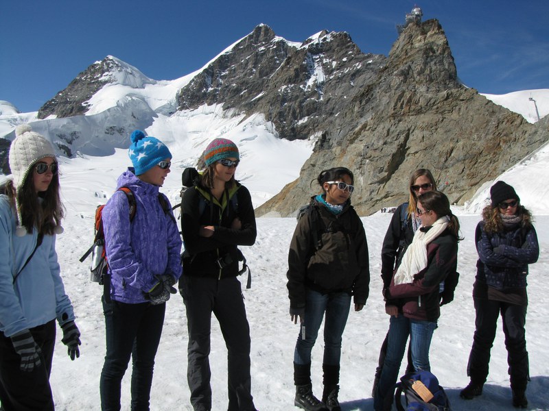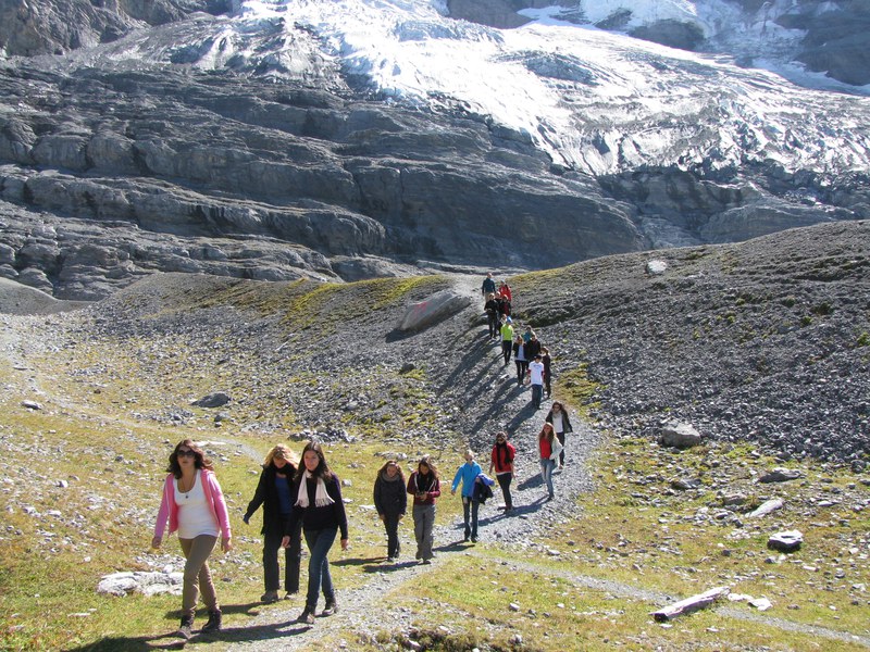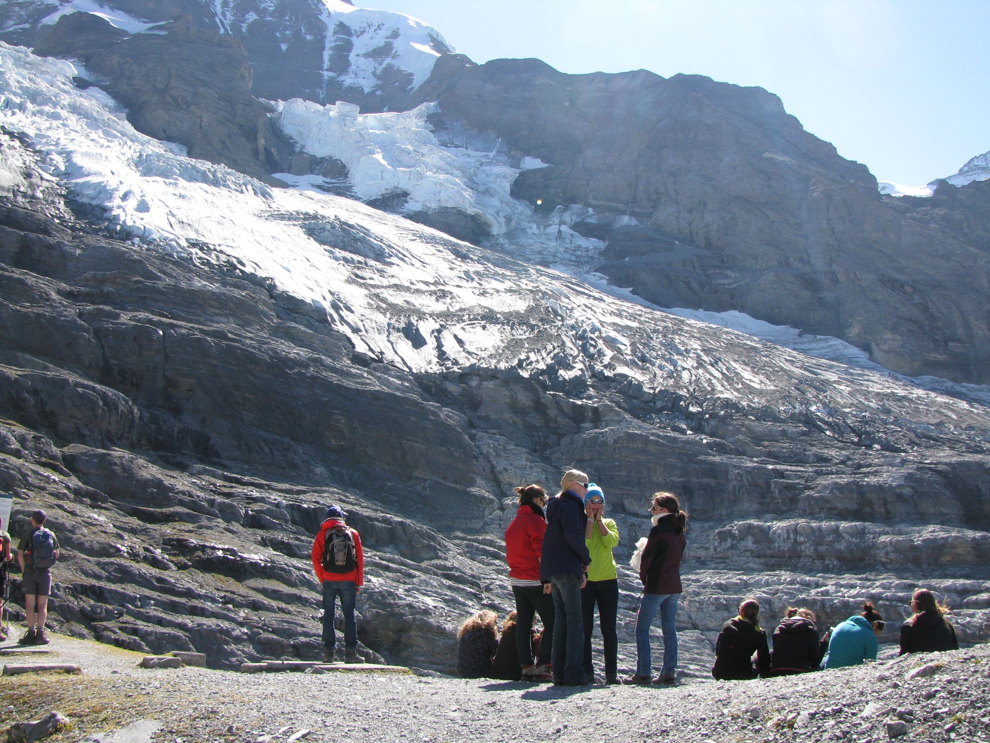Auf der Sphinx-Plattform genossen wir die wunderbare Aussicht und lachten über die vielen Asiaten, die alles fotografieren wollten. Aber die Aussicht von der Plattform war wirklich sehr beeindruckend. Im „Zügli“ zurück zur Station Eigergletscher machten wir Lunchpause. Beim Eigergletscher begann unser Postenlauf mit drei verschiedenen Posten. Von der Seitenmoräne des Eigergletschers hatten wir eine fantastische Sicht auf Eiger, Mönch und Jungfrau und natürlich auf den Eigergletscher. Auf dem „ehemaligen“ Gletscher waren verschiedenfarbige Ballons verteilt, die den Rückzug des Gletschers in Fünfjahres-Abständen kennzeichneten. Es war erschreckend zu sehen, wie schnell sich der Eigergletscher in den letzten 30 Jahren zurückgezogen hat, insbesondere der Rückzug der letzten fünf Jahre war enorm. Bei einem Quiz konnten wir schliesslich unser Wissen testen, welches wir uns in diesen zwei Tagen angeeignet hatten. Danach spazierten wir gemütlich über die Seitenmoräne ins Tal zurück und weiter zur Kleinen Scheidegg. Am Bahnhof nahmen wir unser Gepäck wieder in Empfang und stiegen mit voll mit spannenden Eindrücken in den Zug nach Basel.