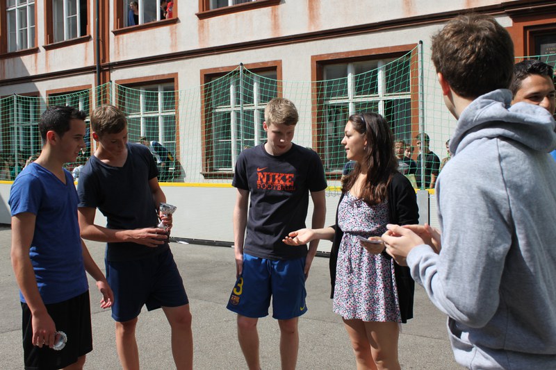 Zu den zwei konkurrierenden Teams einer Partie gehörte jeweils noch ein Courtbeo-bachter, welcher das Platzgeschehen im Auge behielt und die Teilnehmenden jeweils zur Ordnung rief, wenn beim Einen oder Anderen die Nerven versagten. Diese Lehrperson war allerdings meist bei weitem nicht die einzige Anwesende auf dem Pausenhof, viele Lehrkräfte zog das spannende Fussballspektakel von der Kaffeestube auf den Hof. Beim Finalspiel, dass ein wenig über das Ende der Zähnipause herausging, tolerierten die Lehrer und Lehrerinnen alle Verspätungen, da sie selbst auch vom fesselnden Match England gegen Frankreich auf dem Pausenhof festgehalten wurden. Schlussendlich siegte Frankreich 6:5 gegen England und durfte den Pokal der diesjährigen EM am GM mit nach Hause nehmen.
