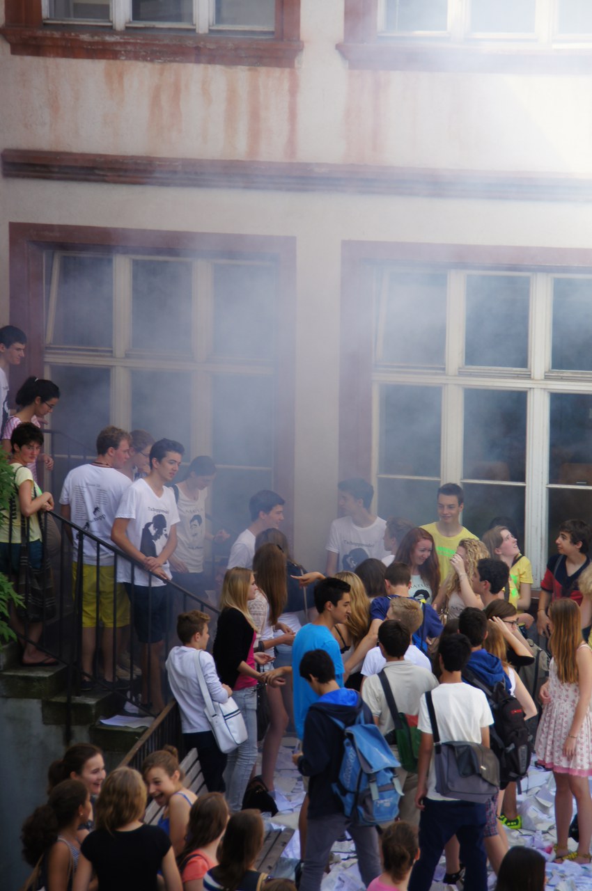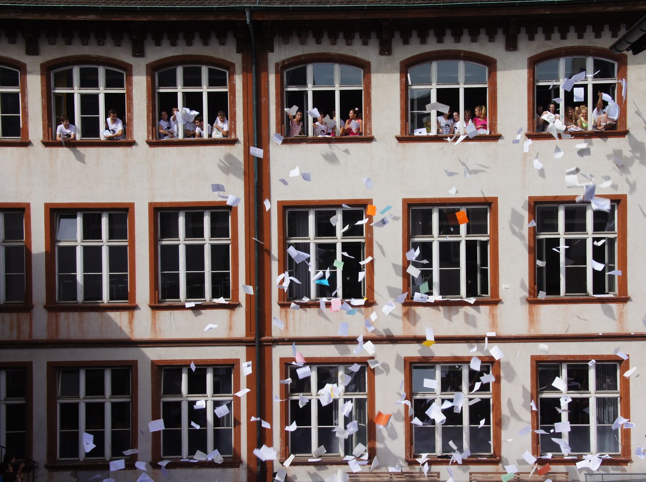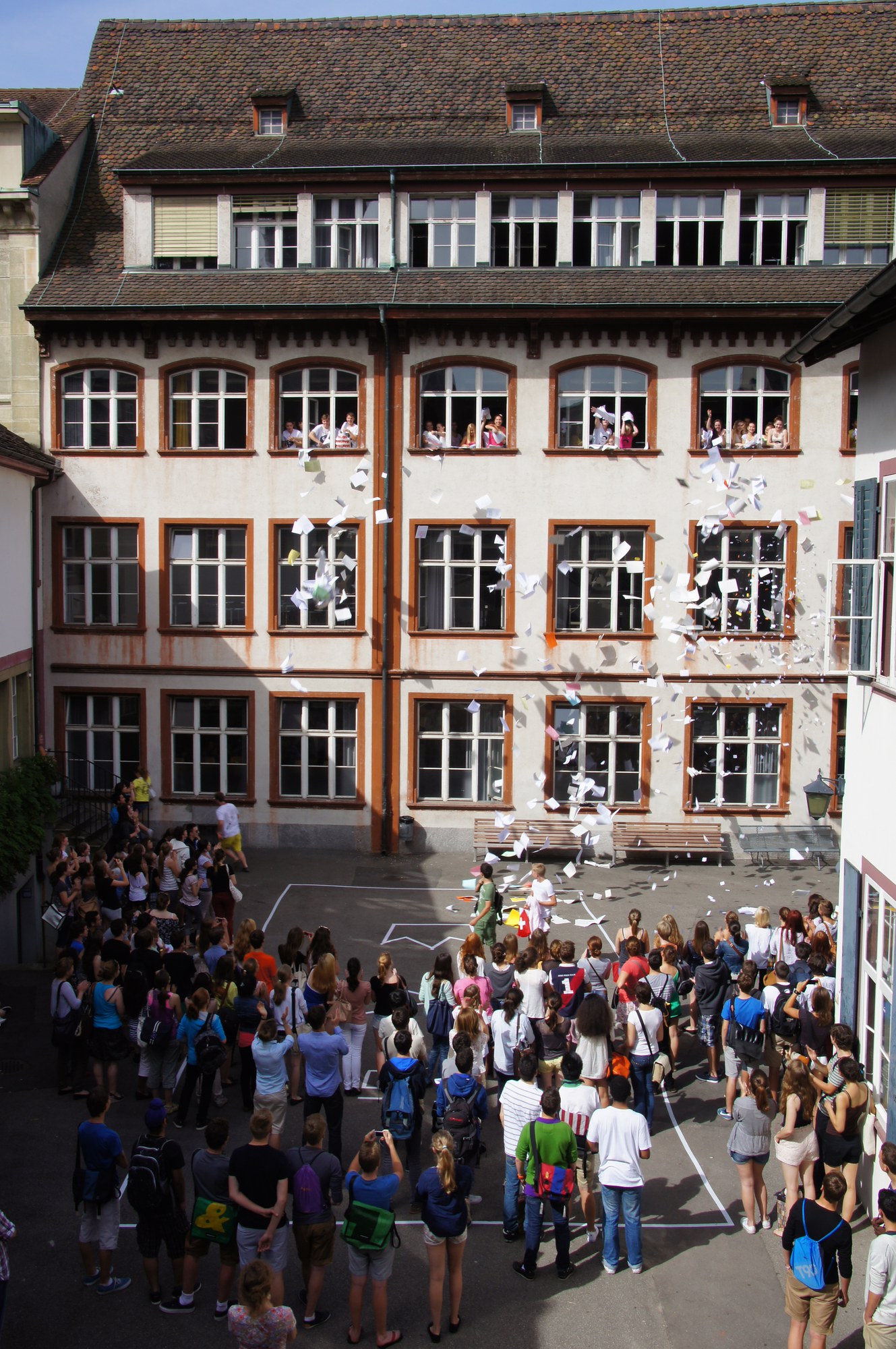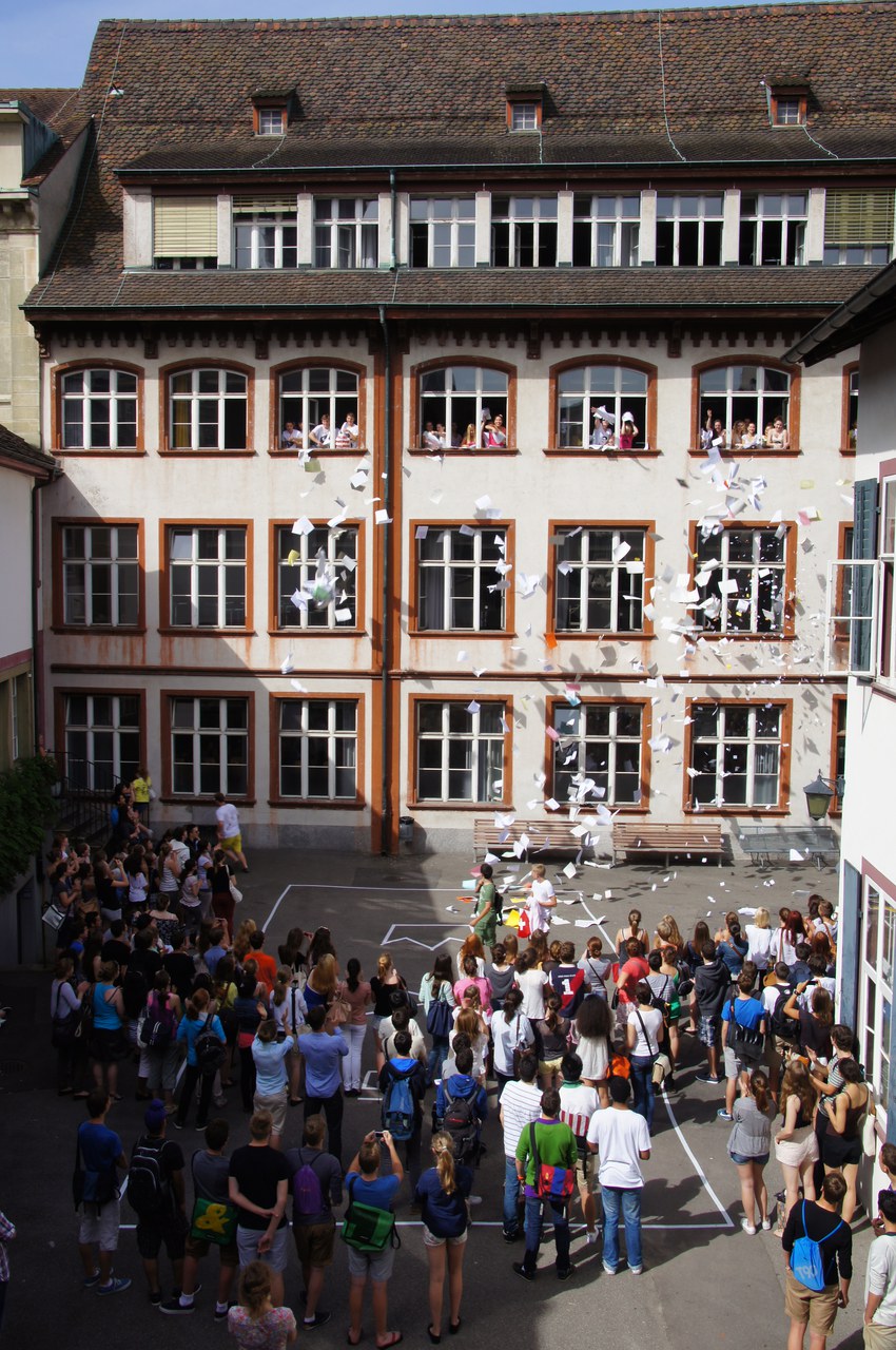 Im Anschluss fand der traditionelle Blätterregen statt. Die Maturandinnen und Maturanden haben, begleitet von Musik aus den Boxen, vom zweiten Stock des „Unteren Gymnasiums“ ihre gesammelten Blätter in einem wunderschönen farbigen Blätterregen in den Hof segeln lassen. Sowohl die Schülerinnen und Schüler der 1. – 4. Gymnasialklassen als auch Lehrpersonen, Schulleitung, Eltern sowie kleine Primarschüler haben sich des farbigen Regens erfreut.