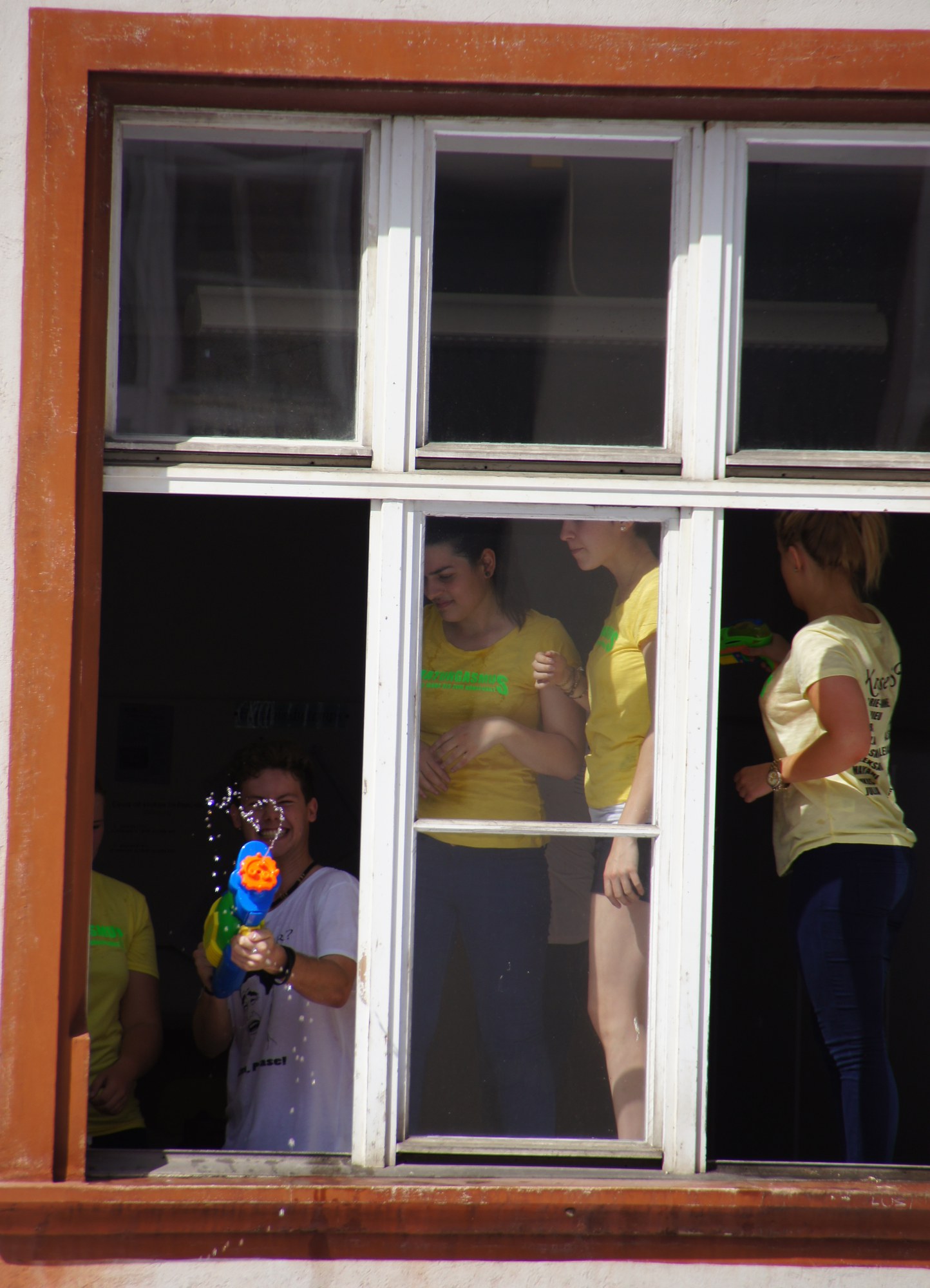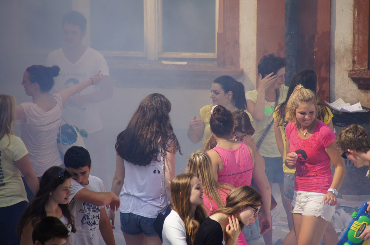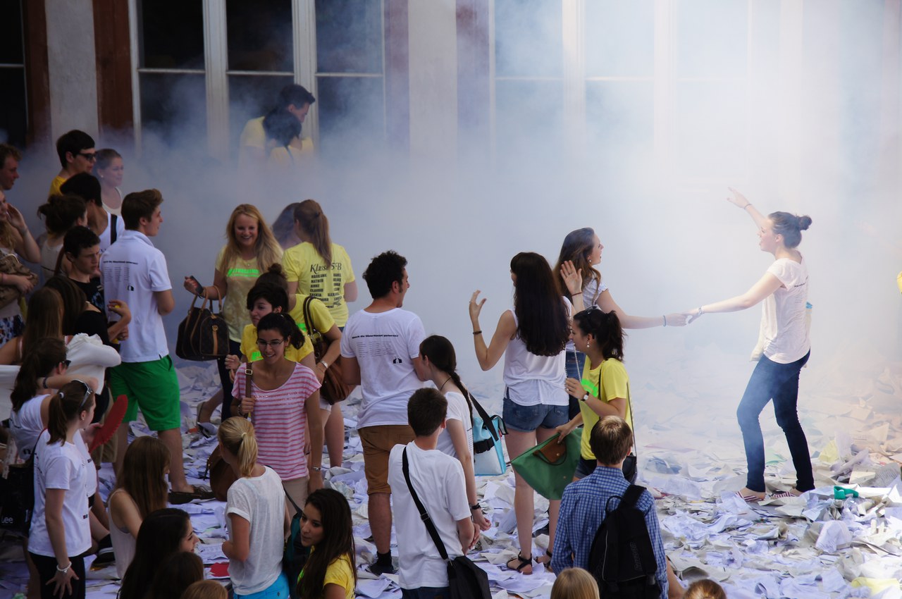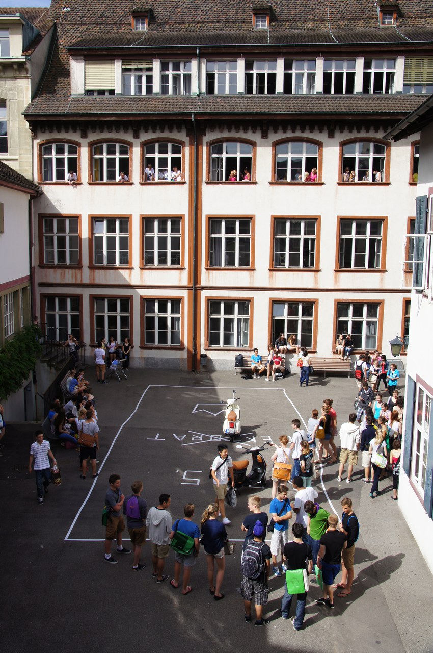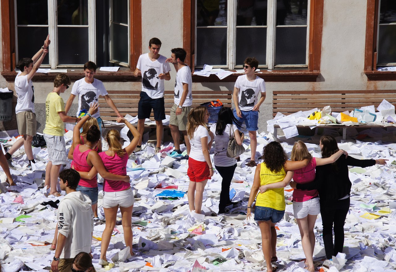 Im Anschluss fand der traditionelle Blätterregen statt. Die Maturandinnen und Maturanden haben, begleitet von Musik aus den Boxen, vom zweiten Stock des „Unteren Gymnasiums“ ihre gesammelten Blätter in einem wunderschönen farbigen Blätterregen in den Hof segeln lassen. Sowohl die Schülerinnen und Schüler der 1. – 4. Gymnasialklassen als auch Lehrpersonen, Schulleitung, Eltern sowie kleine Primarschüler haben sich des farbigen Regens erfreut.