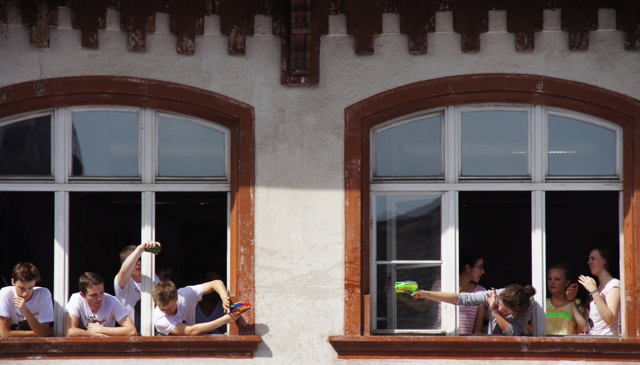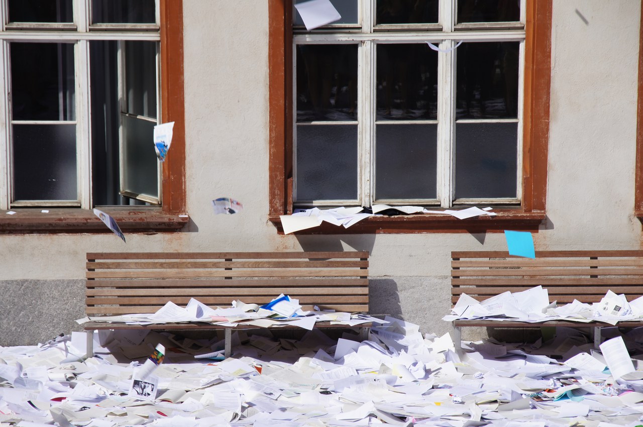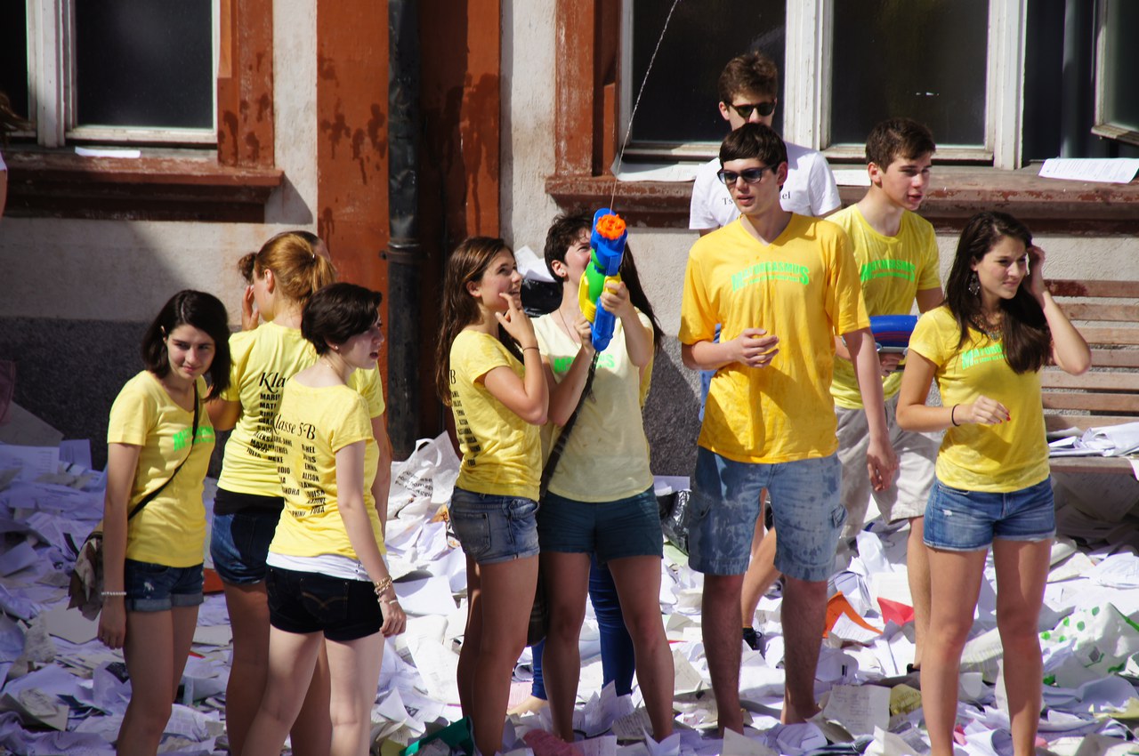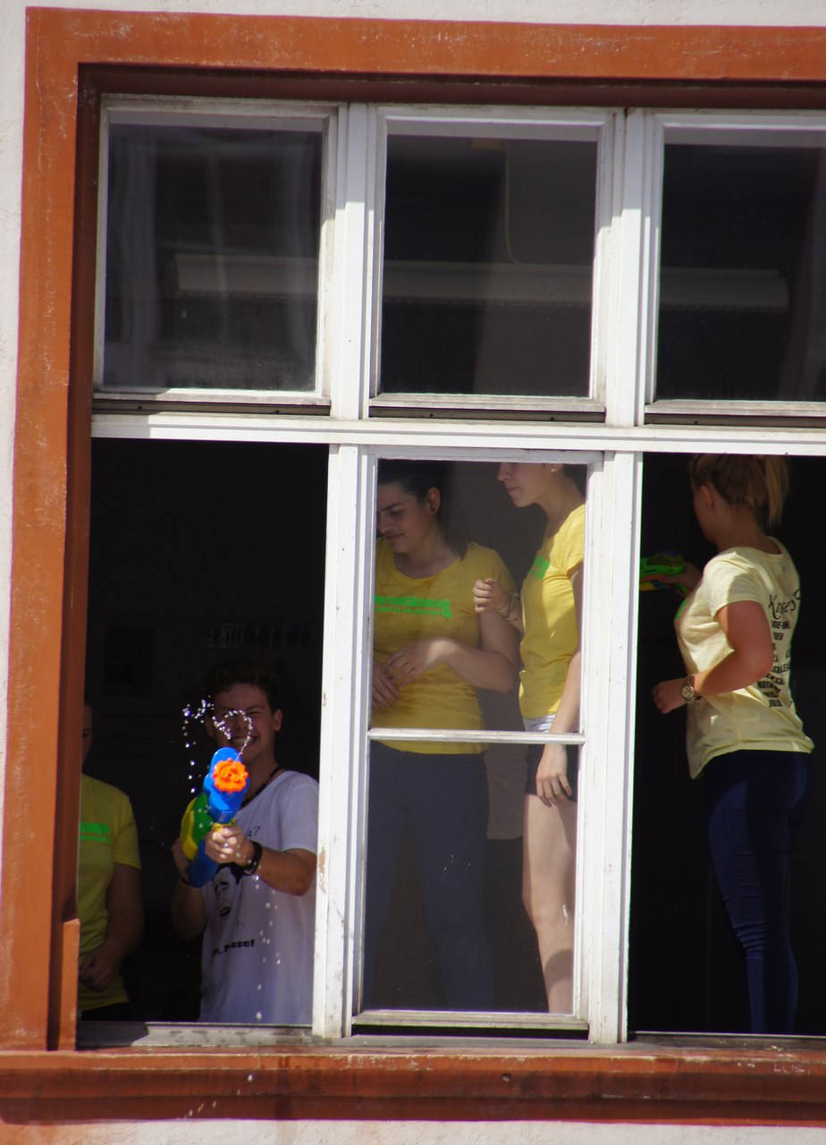 Im Anschluss fand der traditionelle Blätterregen statt. Die Maturandinnen und Maturanden haben, begleitet von Musik aus den Boxen, vom zweiten Stock des „Unteren Gymnasiums“ ihre gesammelten Blätter in einem wunderschönen farbigen Blätterregen in den Hof segeln lassen. Sowohl die Schülerinnen und Schüler der 1. – 4. Gymnasialklassen als auch Lehrpersonen, Schulleitung, Eltern sowie kleine Primarschüler haben sich des farbigen Regens erfreut.