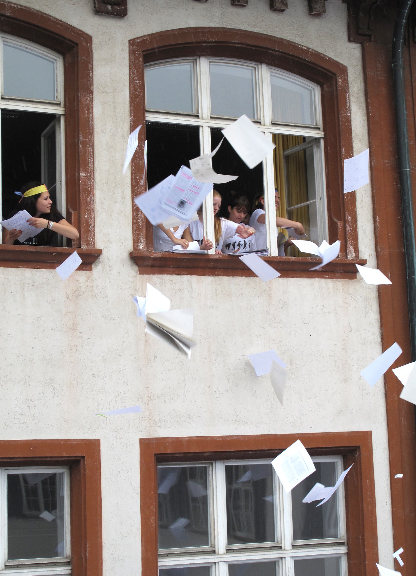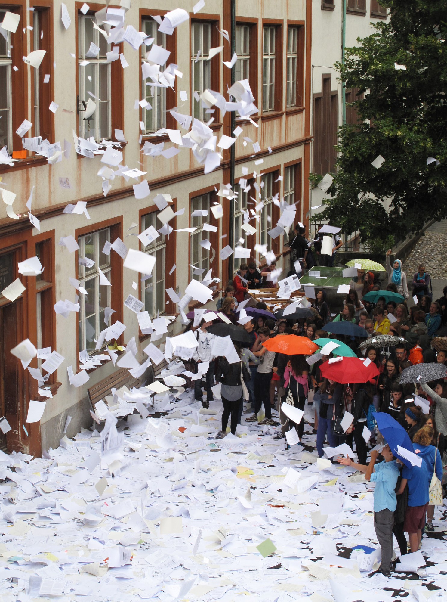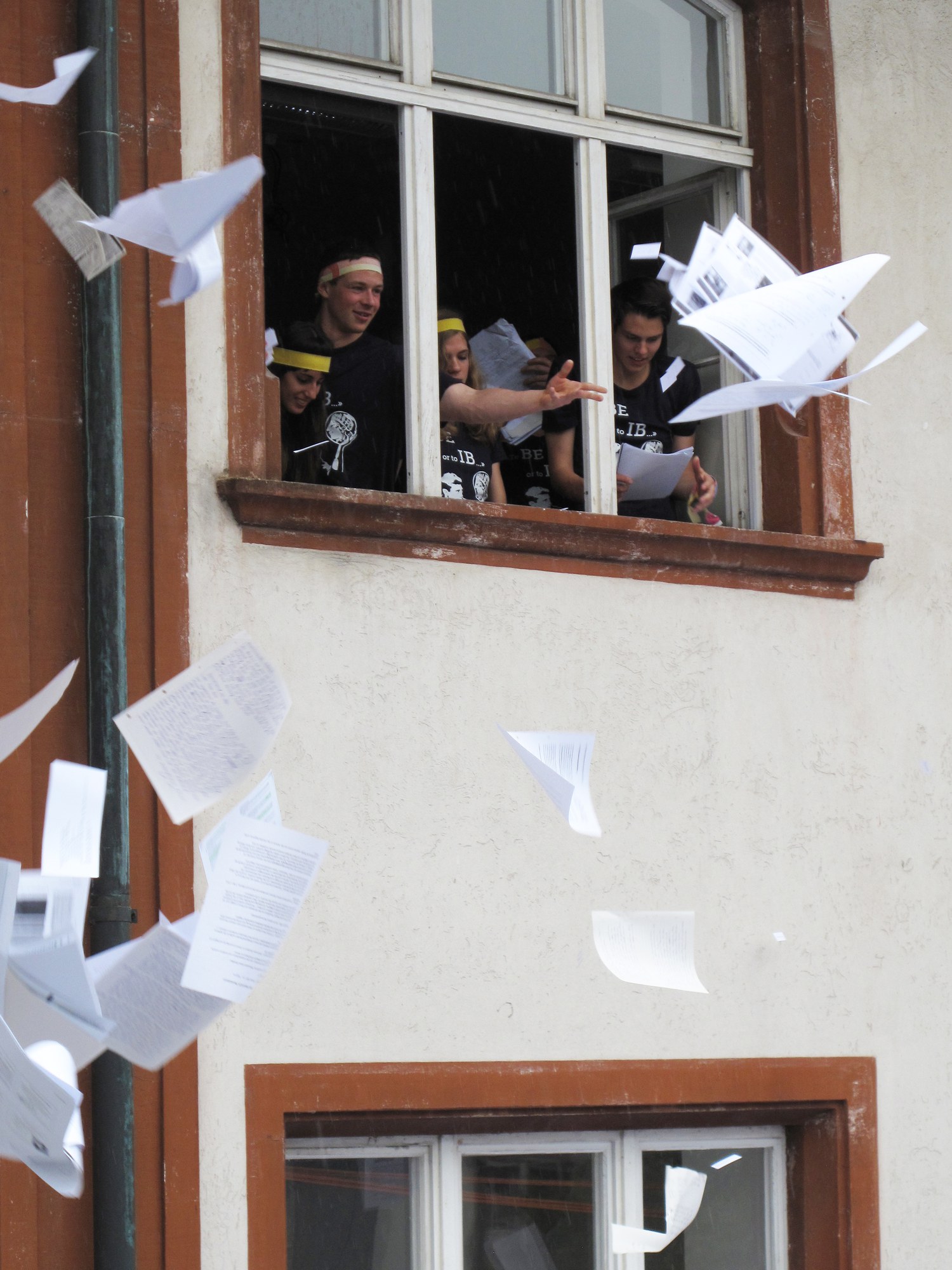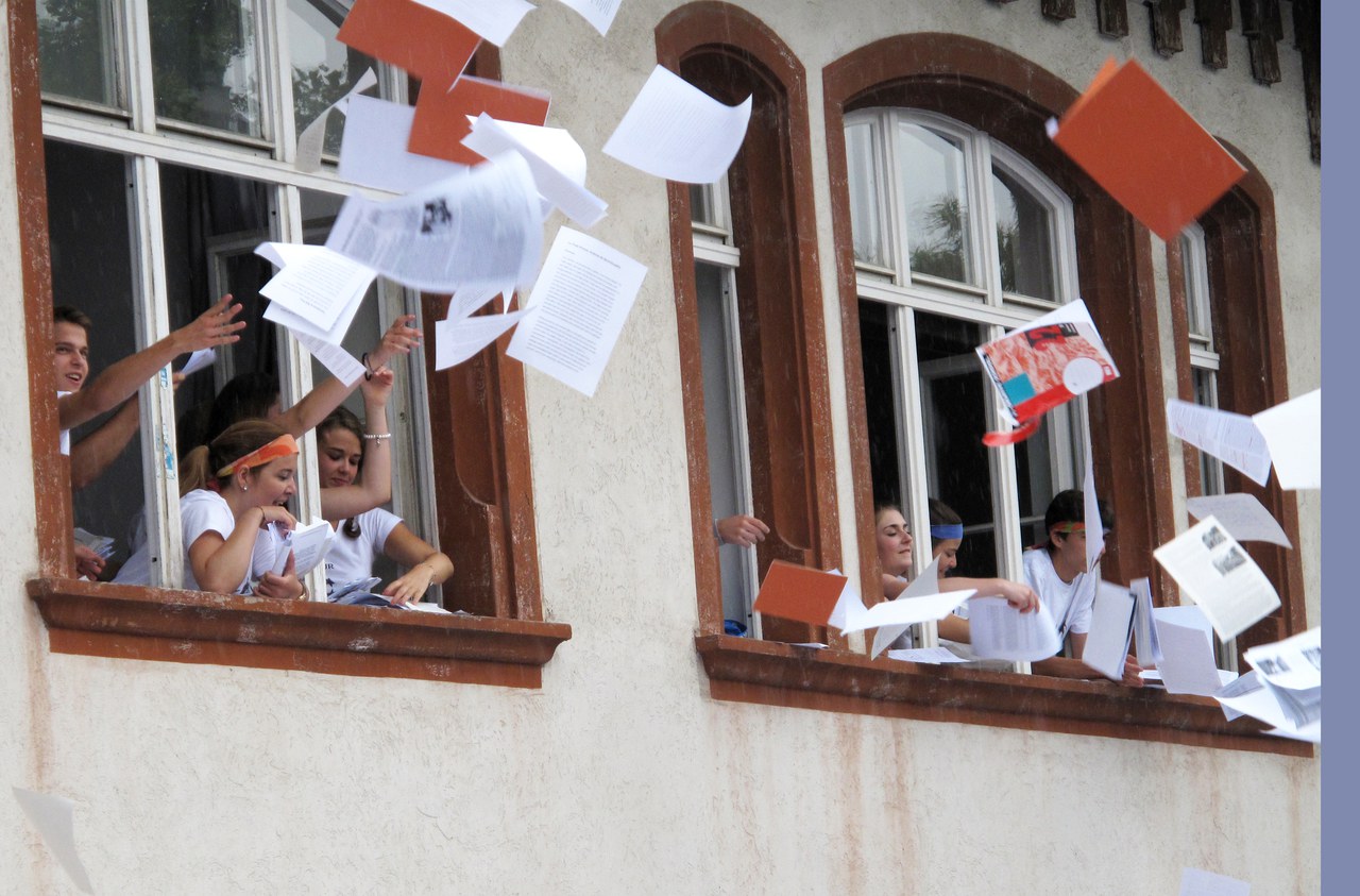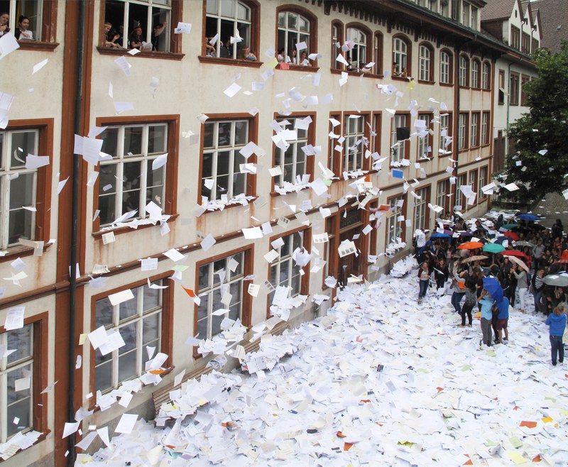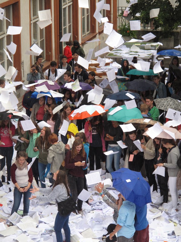 Auch dieses Jahr haben unsere Maturandinnen und Maturanden den Abschluss ihrer Prüfungen mit einem „Blätterregen“ gefeiert.