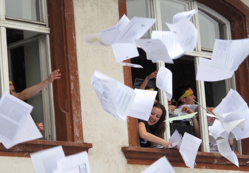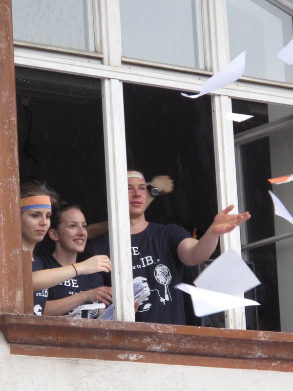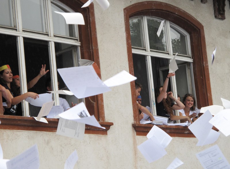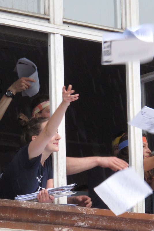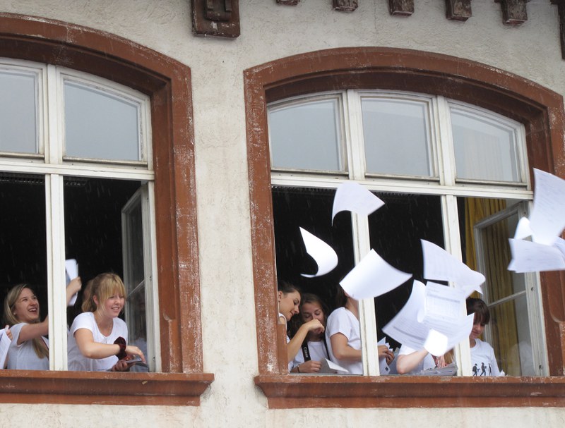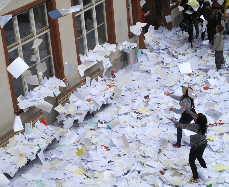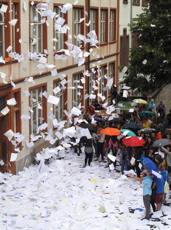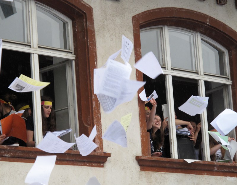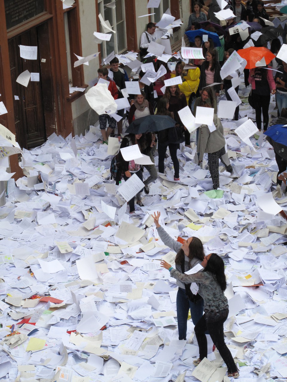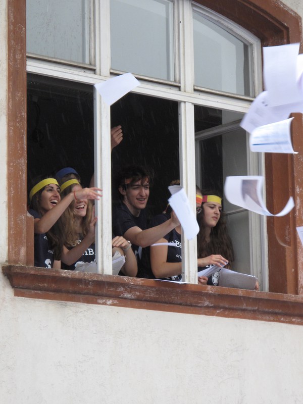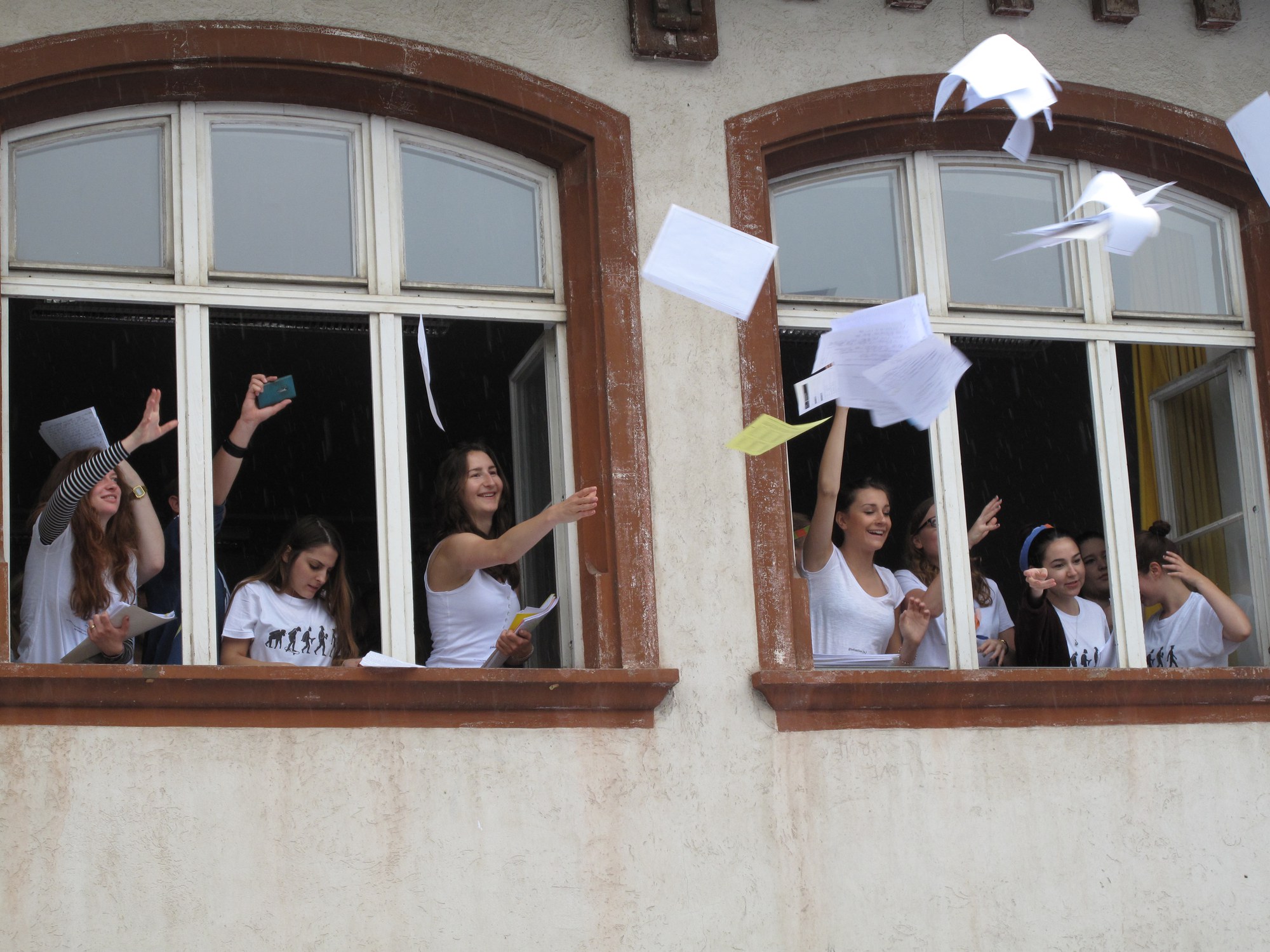 Auch dieses Jahr haben unsere Maturandinnen und Maturanden den Abschluss ihrer Prüfungen mit einem „Blätterregen“ gefeiert.