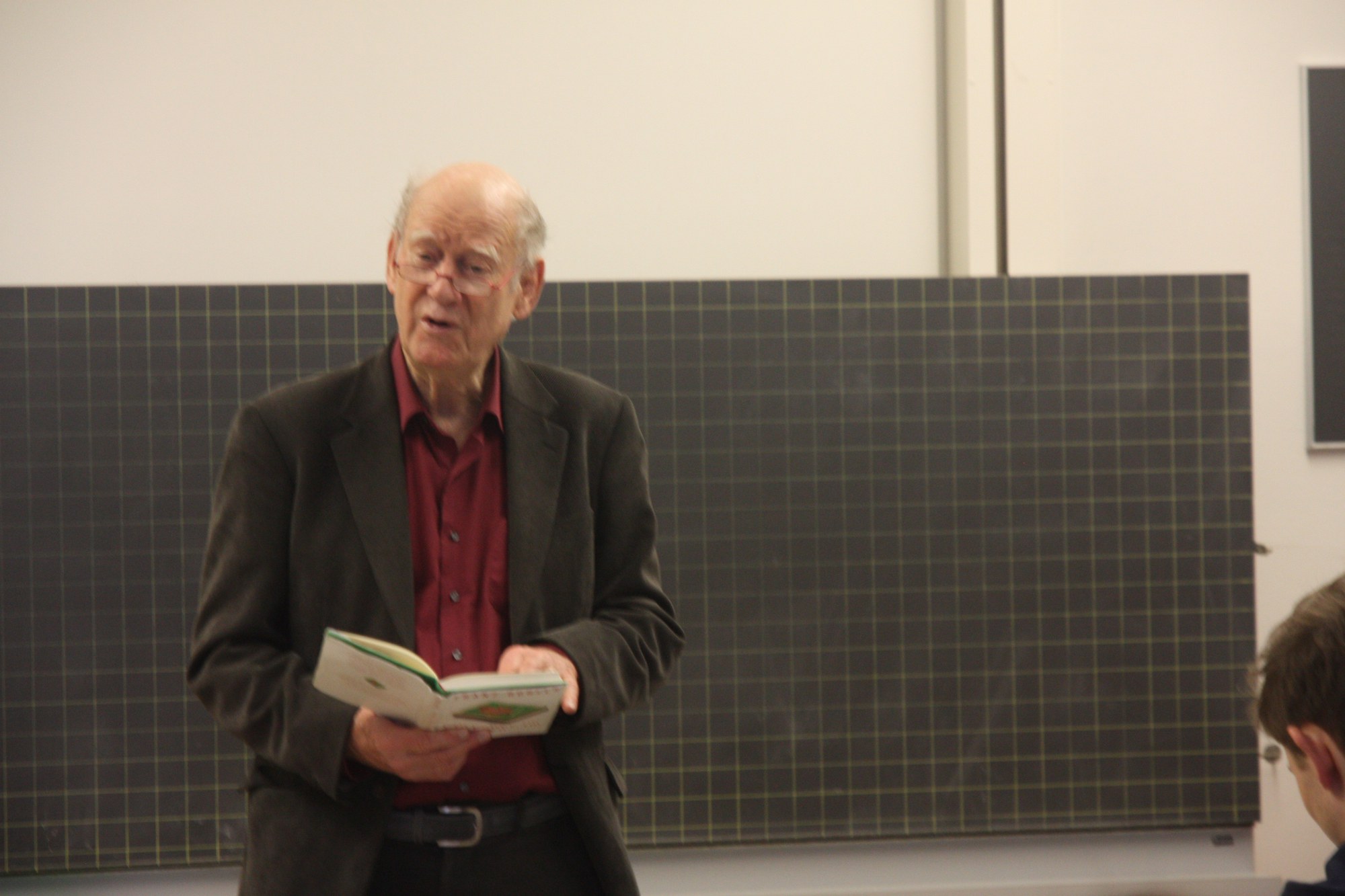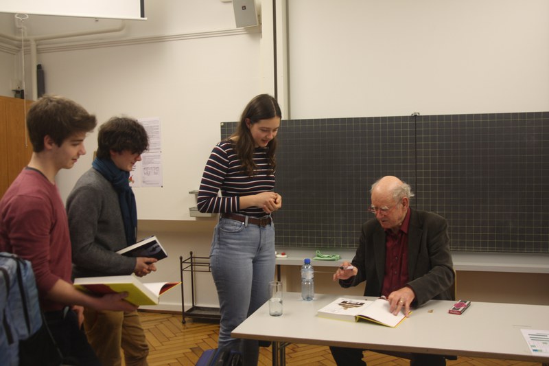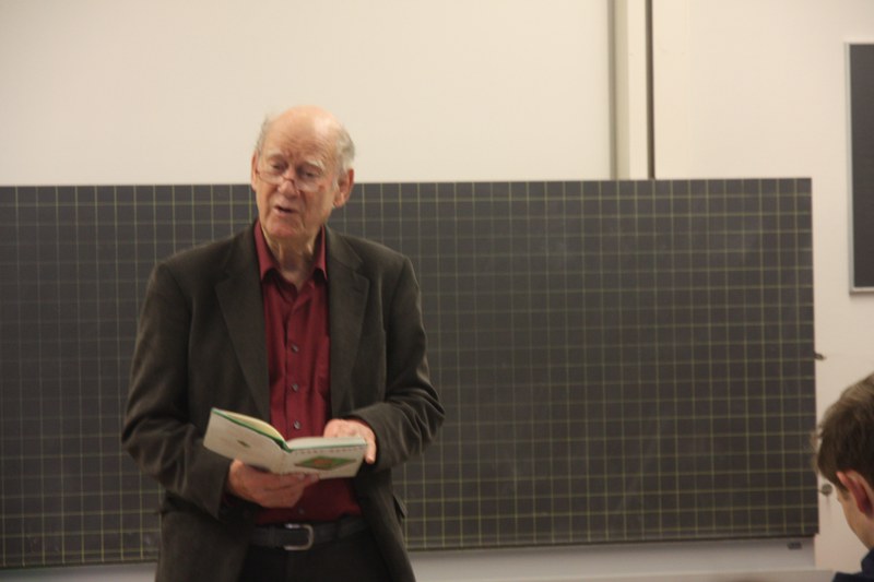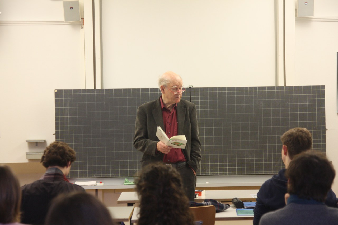 Am 26. Januar 2018 kam der Schweizer Autor und Kabarettist Franz Hohler in die Deutschstunde der Klasse 5B. Im Rahmen eines Vortrags zum Thema zeitgenössische Schweizer Literatur kamen zwei Schülerinnen auf die Idee, mit dem Schriftsteller Kontakt aufzunehmen und ihn anzufragen, ob ein Besuch bei uns im GM für ihn in Frage käme. Denn wer könnte besser über zeitgenössische Autoren und ihre Werke sprechen als jemand, der selbst zeitgenössischer Autor ist?