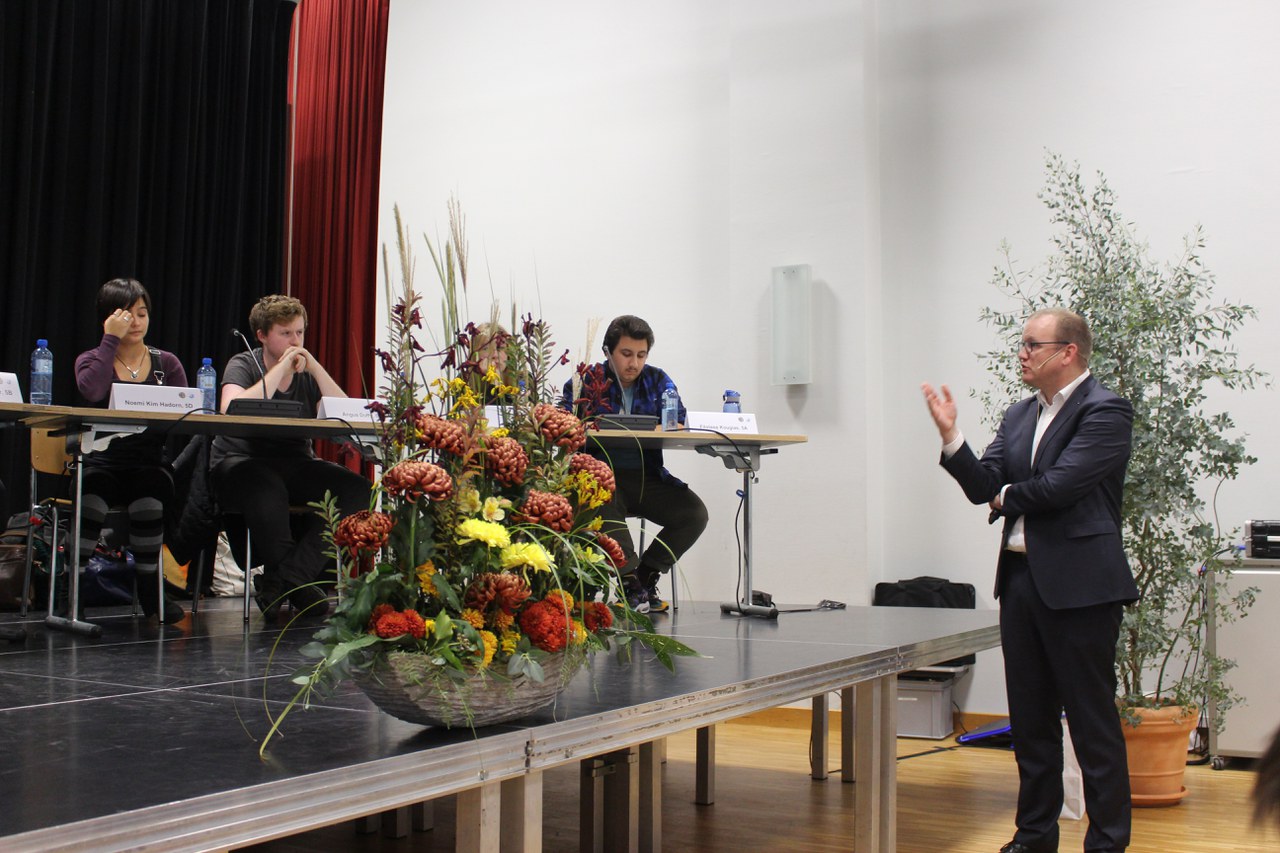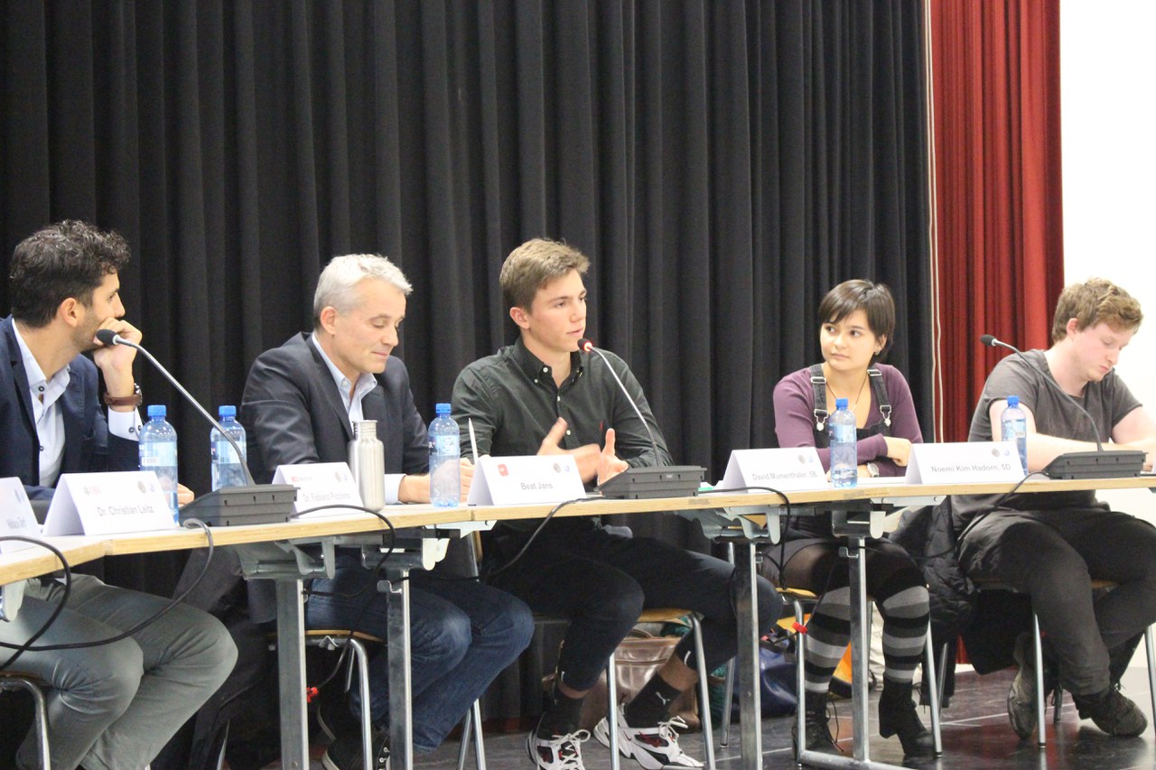 Nach der Begrüssung und einer kurzen Vorstellung der Gäste durch den Rektor erklärten die Experten in kurzer, prägnanter Form, welche aus ihrer jeweiligen Warte die wichtigsten Herausforderungen in dieser komplexen Thematik darstellen. Die Schülerinnen und Schüler auf dem Podium platzierten ihre Kritik zunächst vor allem an den Bankensektor, welcher ihrer Meinung nach trotz seiner grossen Einflussmöglichkeiten immer noch zu stark nach ökonomischen Kriterien folge anstatt die Geldflüsse klimafreundlich zu kanalisieren.