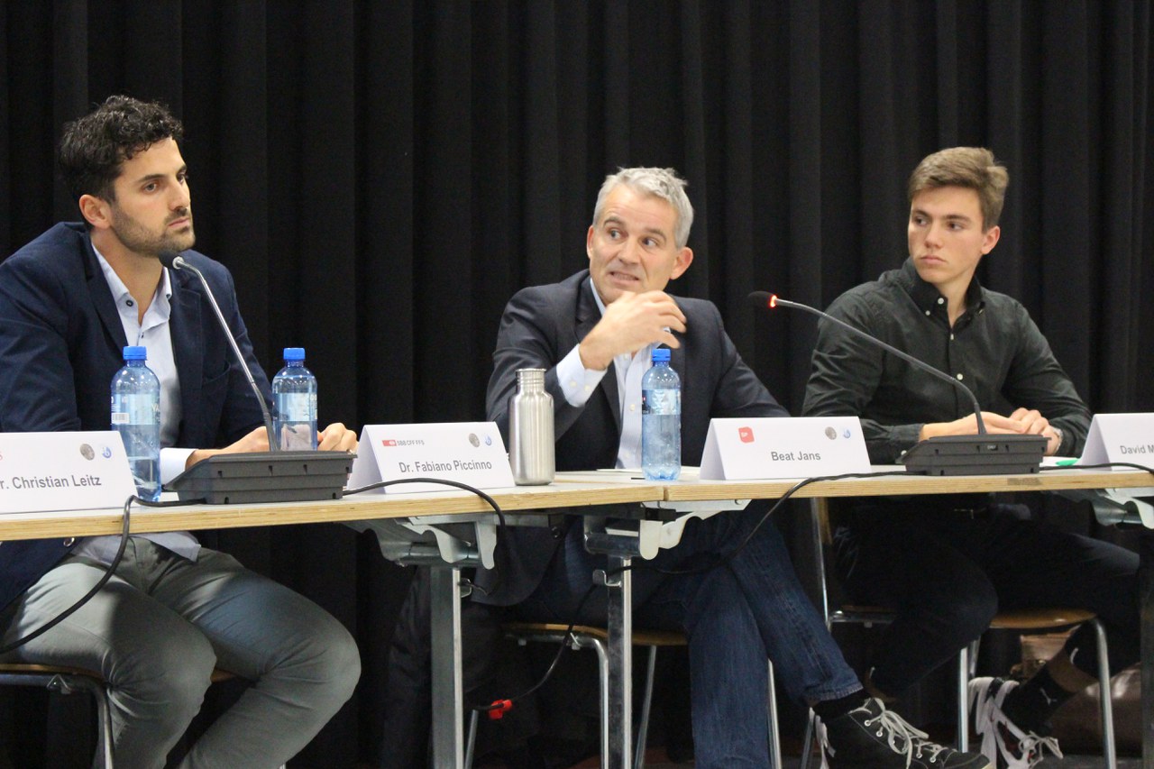 Herr Dr. Erich Fischer vom Departement für Umweltwissenschaften der ETH Zürich postulierte als erste Massnahme eine flächendeckende Lenkungsabgabe auf CO2, die aber massvoll sein müsse, um einen Tanktourismus zu verhindern. Neben der Steuer auf Benzin müsse flankierend auch sofort eine Infrastruktur für elektrische Mobilität geschaffen werden. Dr. Fabiano Piccinno, Projektleiter für Nachhaltigkeit und Verantwortlicher der Klimastrategie der SBB erklärte, dass seitens öffentlicher Mobilitätsanbieter stark an modularen Lösungen von Tür zu Tür-Angeboten gearbeitet wird, um die Attraktivität zu steigern. Grundsätzlich stellt jedoch eine Erhöhung der Kapazitäten des öffentlichen Transports auf so engem Raum eine grosse Herausforderung dar.