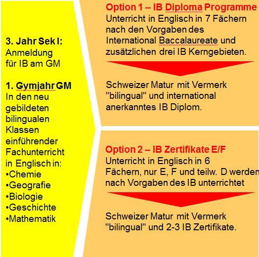Ausgehend von dieser bilingualen Tradition und Erfahrung werden Schülerinnen und Schüler, die sich für das DP interessieren, während des 9. Schuljahres über die Möglichkeiten des Ausbildungsganges informiert und anschliessend zu Beginn der gymnasialen Laufbahn in die entsprechenden Klassen eingeteilt (siehe auch Abb. 1). Bei zu vielen Anmeldungen entscheidet das Rektorat über die Aufnahme in das IB-Programm. Das IB Diploma Programme ist ein freiwilliges Zusatzangebot des GM, auf welches kein rechtlicher Anspruch besteht.