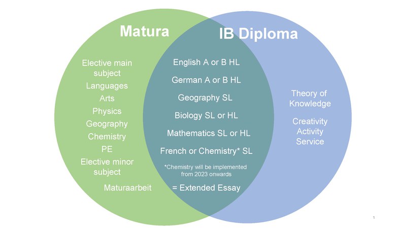- Durch die vielen Gemeinsamkeiten zwischen dem Diplomprogramm des IB und der Schweizer Matur liegt der Mehraufwand für die Schülerinnen und Schüler klar im verantwortbaren Rahmen. Die nebenstehende Abbildung zeigt die Gemeinsamkeiten der beiden Curricula in Form einer Schnittmenge von zwei Kreisen: