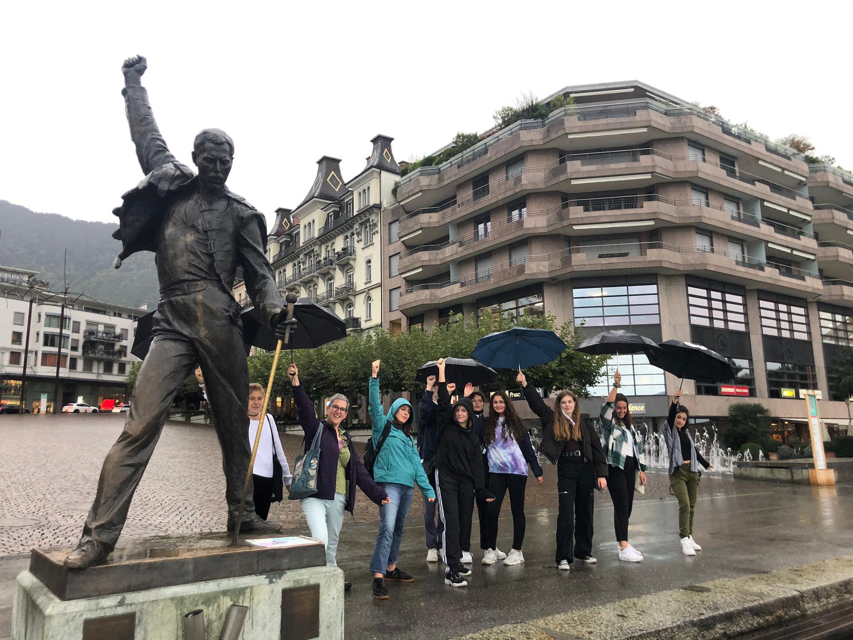 After visiting the Charlie Chaplin World in Vevey we took the bus to Montreux. Unfortunately, it started to rain, but the view of the lake of Geneva was still beautiful. As we arrived, we went to the Casino Barrière de Montreux because in the building there are not only gambling machines but also the legendary Mountain Studios where Queen recorded, amongst others, its last album “Made in Heaven”. Stars like David Bowie or the Rolling Stones have used the studio as well. In the studio there is an exhibition about the rock band Queen. But first, the presentation about Freddie Mercury, the lead singer of Queen, was held in front of the casino. Queen was or is a very popular British rock band. Famous songs of theirs include “We Will Rock You”, “Bohemian Rhapsody” or “We are the Champions”. Freddie Mercury, as the front man, had a difficult life and he suffered from AIDS. This was also the cause of his early death. In the exhibition, we looked at Mercury’s extravagant costumes, albums and musical instruments. Furthermore, we could enter the actual studio with a music switchboard and experiment with some songs ourselves by changing the sound and beat.