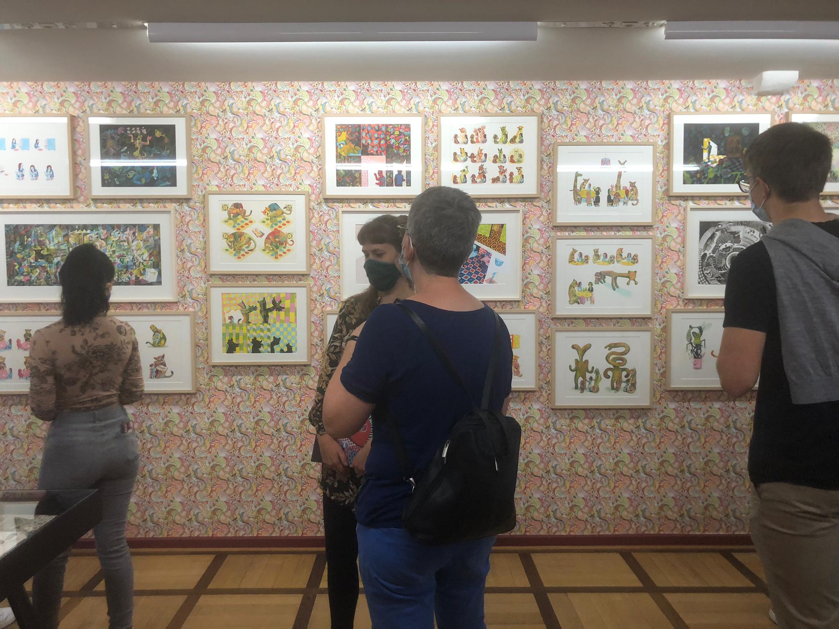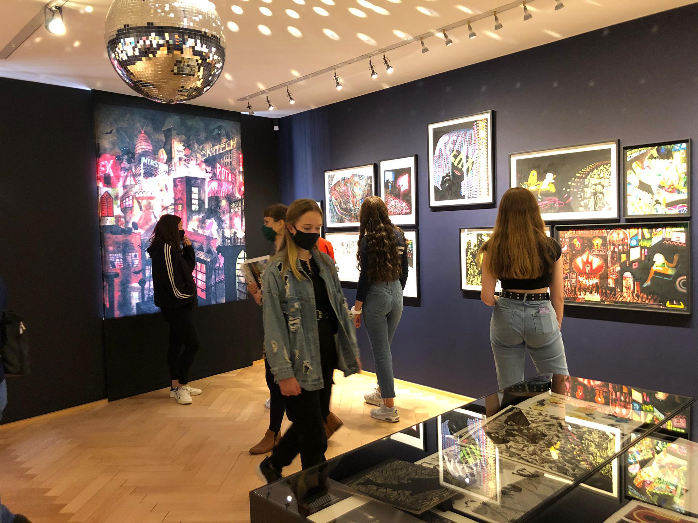 On Tuesday, 22.09.2020, we all went to the Cartoon Museum to take a tour and do a workshop. There was an exhibition about the works of Brecht Evens, a 32-year-old comic artist from Belgium, who published his first comic “The Wrong Place” (2009) that gained him a lot of respect and awards. The exhibition, which is currently on display in the Cartoon Museum, is called “Night Animals” and can be visited until 31.01.2021. When we arrived, we were greeted by a museum employee and she gave us a tour of the museum and the exhibition. On every floor, a different aspect of Evens’ work was displayed and it was all very colorful and beautiful to look at. On the ground floor, some pieces of his works were on display and you could see that Evens likes to portray nightlife and parties. On the first floor, it was the work of his book “The Making Of''. It was rather light in color. On the second floor, we could have a little insight into his recent book, “Panther”, a story about a little girl and her imaginary friend, the panther that appears out of her sock drawer. The colors were all bright, but muted, and mainly featured red, blue and green and yellow, depending on where the girl was. On the third floor, his book “The City of Belgium” was shown. It is a story about the nightlife of a selected few characters. That one was one of our personal favorites, as it was colorful and dark and captured the essence of a chaotic evening where one does not know what is going to happen next. Overall the experience was very interesting, and we can highly recommend it.