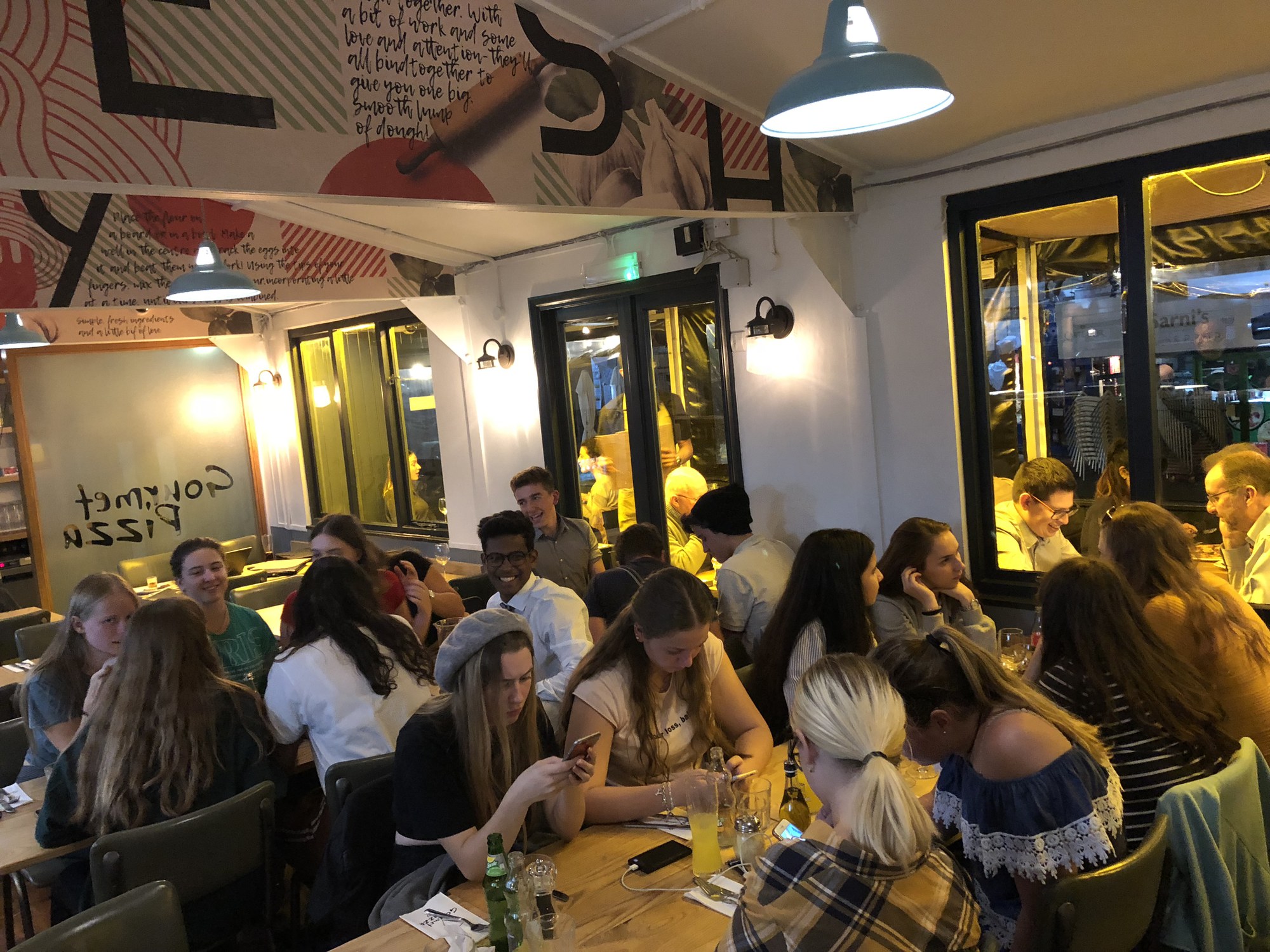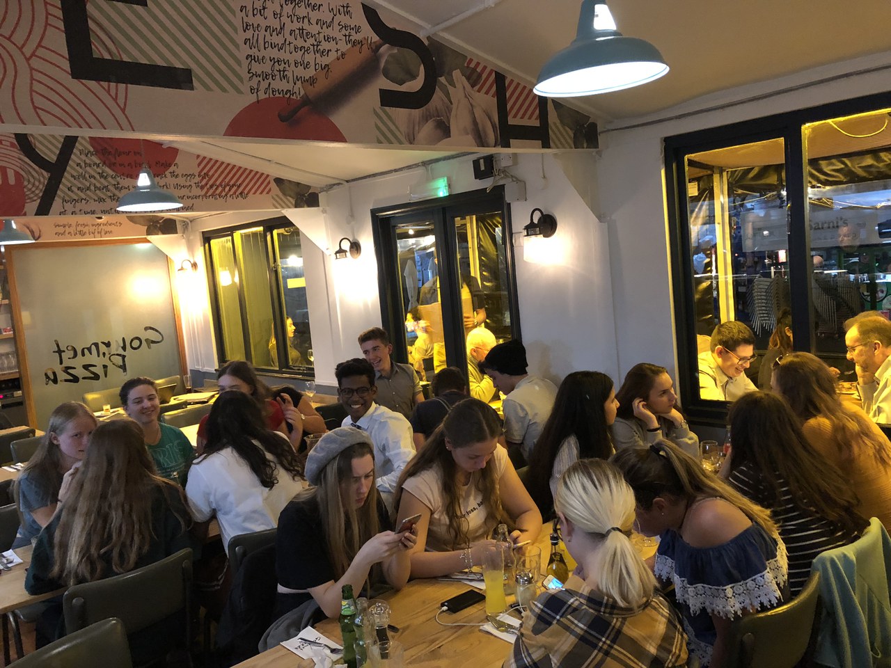 Although our coach was (miraculously) on time in the morning, dramatic bouts of travel sickness and the most extreme traffic so far brought us London with characteristic delay. Luckily, our hostel was very nicely located near the beautiful St. Paul’s Cathedral and so we only had to run across Millenium Bridge to reach Shakespeare`s Globe theatre and museum. After our Shakespearean tour, we decided to walk along the Thames to get to the multicultural East End of London and then had the chance to sample food from different cultures on the famous Brick Lane food mile. Salma`s presentation in Princelet Street introduced us to the poet Benjamin Zephaniah and his experiences of coming from an immigrant family in 60s Britain. For our free evening, Aimee (supported by some very generous helpers) had organised a special treat for class 4DE, namely a visit to the London Eye. Our first day in London therefore drew to a close with an amazing view over London with the backdrop of a brilliant sunset. It was topped off by a meal at a lovely Italian restaurant with delicious pizza (again thanks to those same generous sponsors).