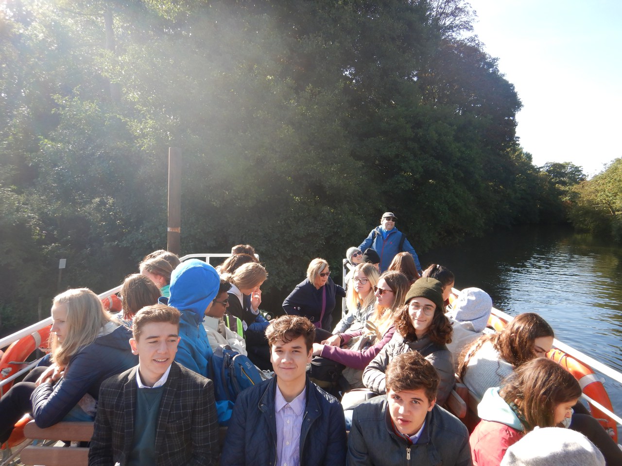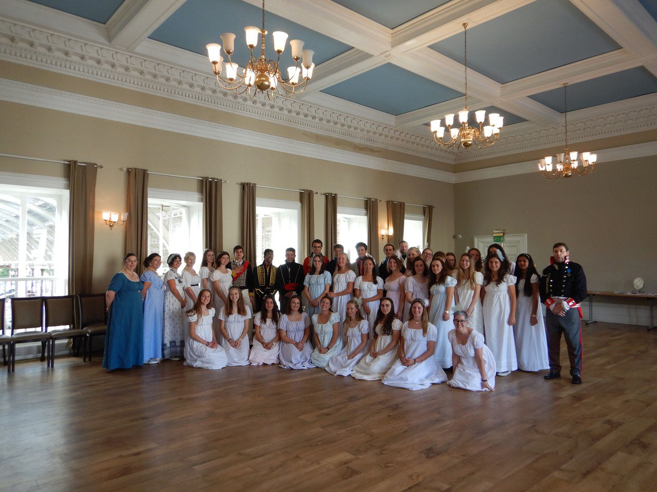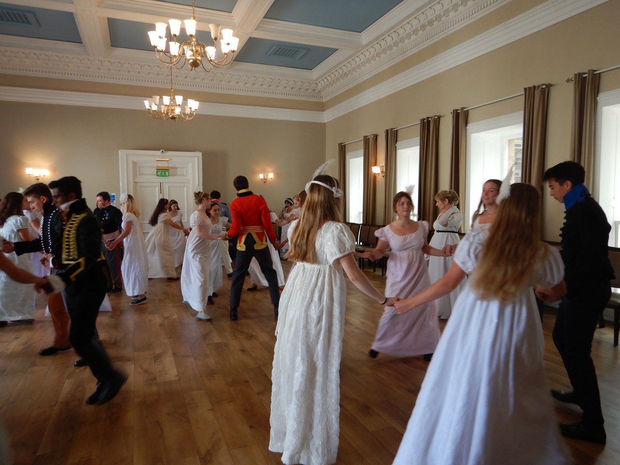 On Monday, our final day in Bath, it was time to set our sights further. Starting off from the landing stage by Pulteney Bridge, our open-top boat tuckered along the River Avon, passing under bridges and through locks with a view of the beautiful English country side along with a large variety of birds in the nature reserve. After lunch, we made our way to the Bath function rooms for our Georgian dance class. The Jane Austen Dance Troupe helped the girls with their gowns and the boys with their soldiers uniforms. Then Dominique, Lenia and Jenny provided the cultural context for the dance with their presentation about Mary Wollstonecraft, one of the first feminists and a prominent controversial figure at the time. Bath`s famous social balls of course reflected strict social etiquette and some complex quadrille footwork, but the dancing – as we soon found out – was also an occasion for serious fun.