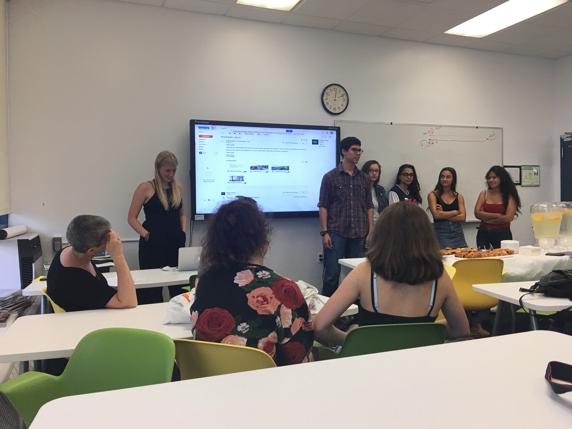 Day three was our big day: We were going to present Swiss-German and its variations to a German class at the United Nations International School. Exiting the heat-wave September weather and entering the cool breeze within the school, we were warmly greeted by the director of the school, as well as some of the teachers, one of which was going to assist in our nerve-wracking presentation. Soon after we were given a tour of the school which, situated along the river, disposed of a magnificent view of the city from afar. We then settled in a classroom and gave our dreaded presentation, which ended up of course being less stressful and more fun: We met students of the German class who, during their turn, gave us a very helpful presentation of their favourite places in New York. Then, it was time for Mrs. Pieck’s presentation: we went to the corner between West 72d Street and Rutgers, where she presented to us Isaac Bashevis Singer and his importance within the Jewish community in New York. If there is one thing we weren’t expecting to learn from a presentation about a Nobel Prize-winning writer, it was Yiddish pick-up lines! After that, we visited the Museum of Jewish Heritage, which, in connection with Mrs. Pieck’s presentation, gave us a deeper look into the Jewish culture and how it was perceived, as well as its deep roots in New York. Most of the day done, we had some free time: Ergo shopping, relaxing in one of New York’s numerous parks, Times Square, or all three!