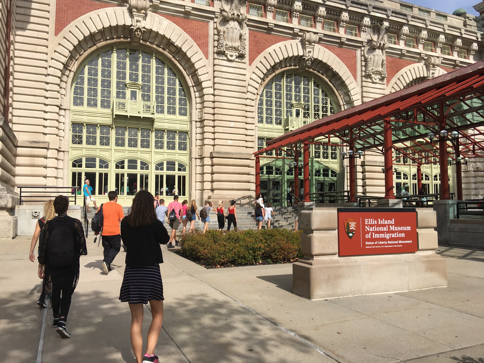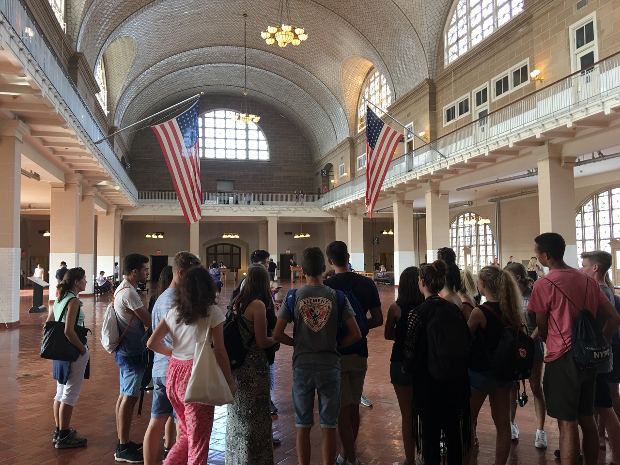 For the entirety of day four, we went full tourist: we embarked on the “Miss New York” with a few dozens of other like-minded tourists, direction: The Statue of Liberty. Amongst our photo-hungry peers, we snapped dozens and dozens of photos of the distant skyline until it was no taller than a pencil. When we arrived on the island, we hovered off the boat, pushed along by the sea of excited foreigners, onto the symbolic land. There we managed somewhat successfully to quickly part the red sea of visitors so that we could see the statue from the front: we had a loaded day in front of us and could not waste too much time. Cameras clutched like life jackets on a sinking boat, clicks were heard right and left as we stood directly in front of the towering Lady Liberty. But not for too long, as we had to sit someplace calmer for Cameron’s presentation, explaining to us the relative dimensions of the statue, as well as its immense historical importance. Having finished that, we ran to the foot of the statue, at which angle its size was even more impressive. We hurried up the hundreds of stairs of the statue until we were right underneath its toes. Having had just enough time to gaze upon the view for a few short minutes, we hurried back down by foot again, and back to “Miss New York”, for our next stop was Ellis Island.