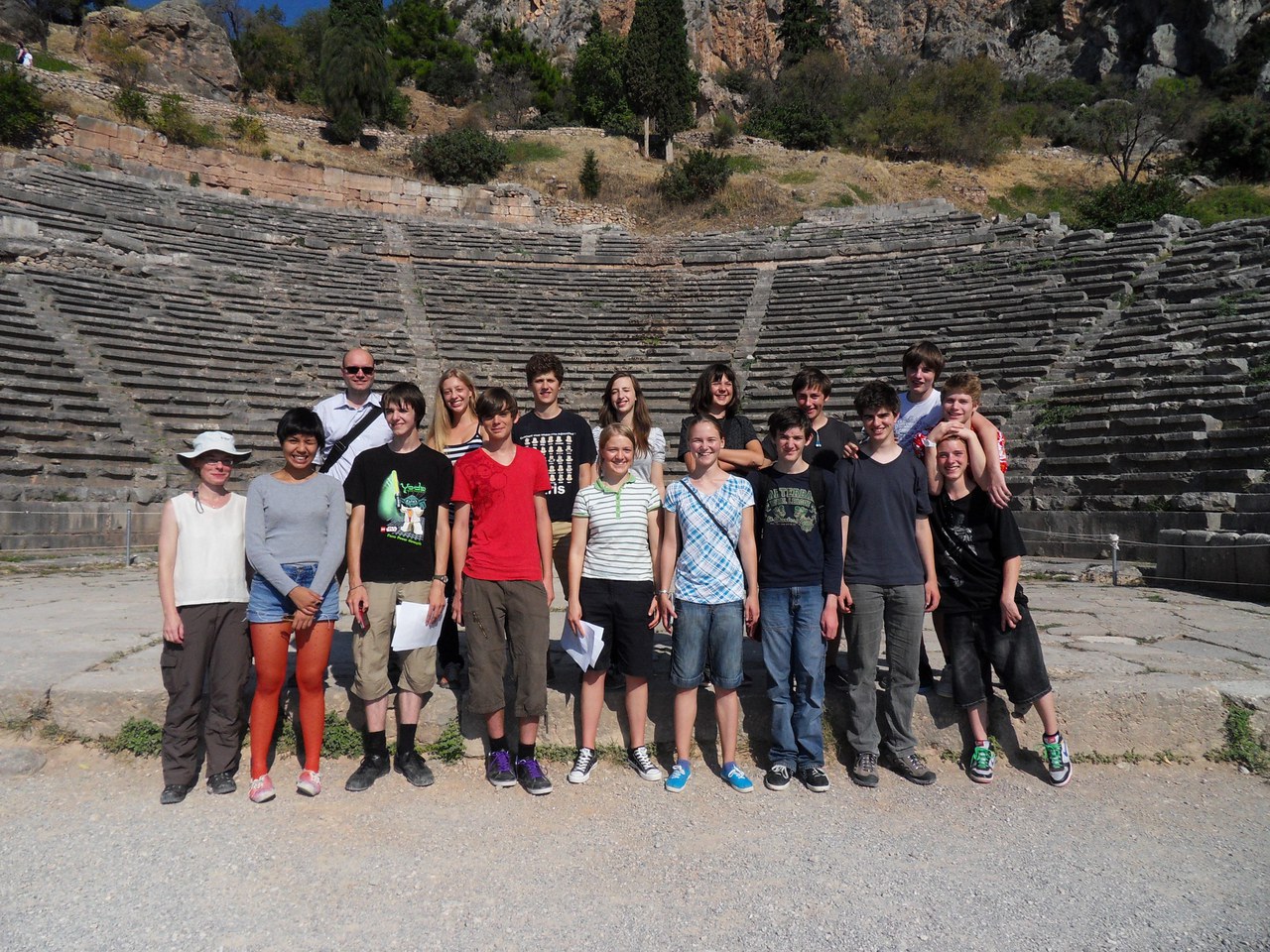 Gleich am ersten Tag ging es weiter nach Delphi. Die Zeit im Bus vertrieben sich die Schülerinnen und Schüler damit, dass sie aus einem Sprachführer ein paar wichtige, aber auch etliche ausgefallene neugriechische Wörter und Wendungen heraussuchten – etwa βραχυκύκλωμα (‘Kurzschluss’), was Christos mit einem amüsierten "κατάστροφη, κατάστροφη!" kommentierte.