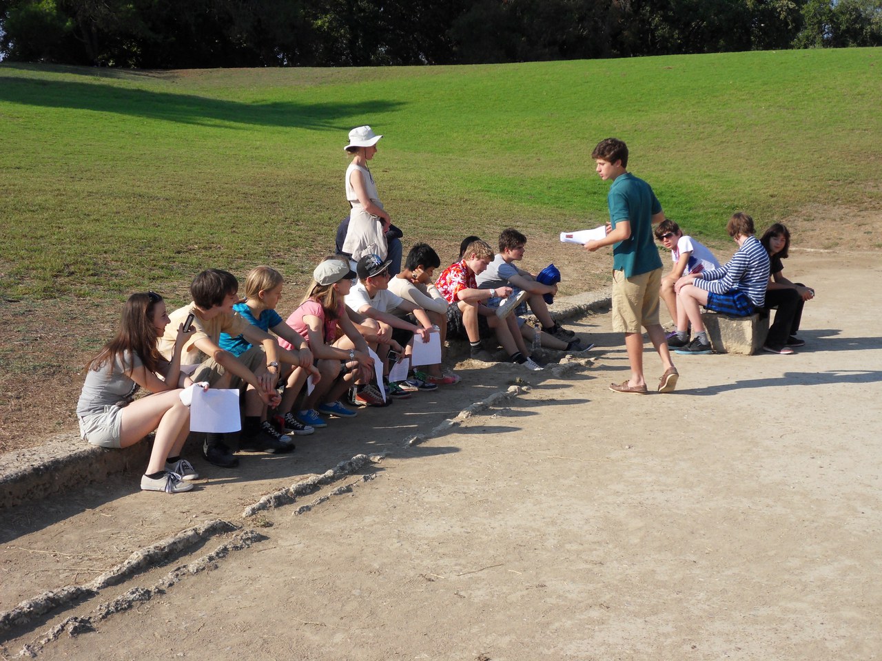 Als erste von den vielen Touristen besuchten wir am anderen Morgen das Grabungsgelände Olympias, das in der Antike seine hohe Bedeutung als panhellenisches Heiligtum mit Hera- und Zeus-Tempel (darin die als Weltwunder bekannt gewordene Zeus-Statue) und als Stätte der Olympischen Spiele hatte. Es ist kaum erklärbar, wie sich am Fuss des Kronos-Hügels, im heiligen Hain der ‚Altis’, in frühen Jahrhunderten – oder sogar -tausenden – eine Einrichtung begründete, die heute weltweit, nach wie vor im Vierjahres-Rhythmus, ein unvergleichliches Interesse weckt. Linus hat über einzelne Ruinen und deren Funktion referiert und im Stadion, wo auf den gut 192 Metern auch ein Wettrennen Schüler – Lehrer stattgefunden hat, von Begebenheiten aus dem antiken Wettkampf-Alltag erzählt. Ein Museumsbesuch und das Mittagessen in einem Estiatorio rundeten den Besuch Olympias ab.