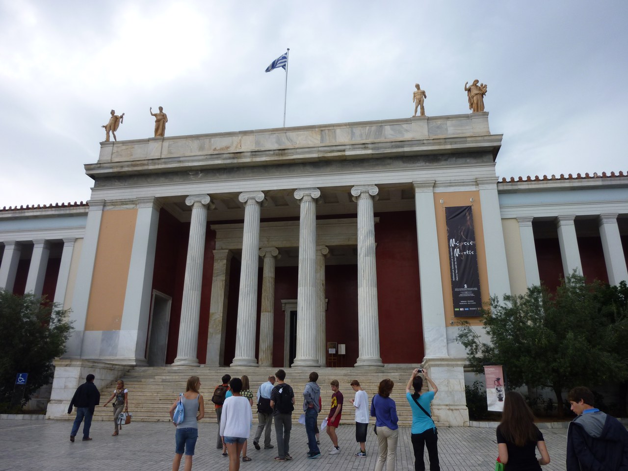 Zu jeder Studienreise gehört auch ein Besuch des berühmten Archäologischen Nationalmuseums. Vom Hotel zogen wir zu Fuss los und machten vor der heutigen Universität einen ersten Halt, um uns den Vortrag Delphines zu ‚Architektur und Stadtplanung Athens im 19. Jahrhundert bis heute’ anzuhören. Kaum zu glauben, wie die Bevölkerung Athens durch die Freiheitskriege zu Beginn des 19. Jahrhunderts auf 4000 Einwohner schrumpfte, der Ort dann aber im Zuge der Wiedereinsetzung als Hauptstadt Griechenlands durch König Otto I. von Bayern bis 1928 sprunghaft auf 600'000 und bis heute auf 2'800'000 Einwohner anwuchs. Delphine hat die architektonische Stadtentwicklung in den historischen Zusammenhang gestellt und einen Vergleich mit anderen Grossstädten Europas angestellt, so dass ein lebensnahes Bild entstand und wir die teilweise in einer auffälligen Architektur erbauten modernen Gebäude einzuordnen wussten.