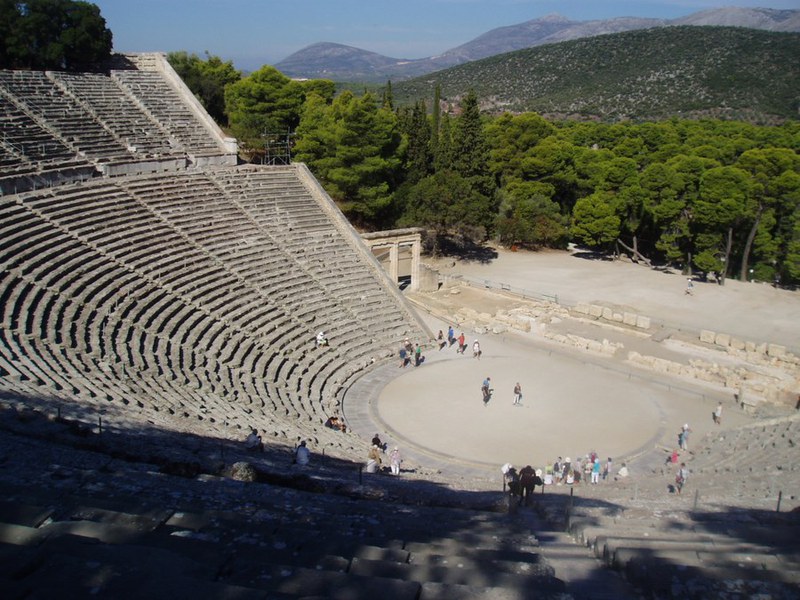 In der Antike war Epidauros weniger wegen seines Theaters als wegen des Asklepios-Kults berühmt; kranke Menschen kamen von weither, um bei dem Heilgott und seinen Priestern Hilfe zu finden. Wir liefen durch die Ausgrabungen und sahen unter anderem die Reste des sog. ‘Abatons’: einer Halle, in der die Kranken eine Nacht im Heilschlaf verbrachten; dabei soll ihnen der Gott persönlich im Traum erschienen sein, um ihnen Anweisungen zu geben. Wie diese Traum-Epiphanien hervorgerufen wurden, weiss man nicht genau. Vermutlich war Hypnose im Spiel, und auch die Anwendung von Drogen ist nicht auszuschliessen.