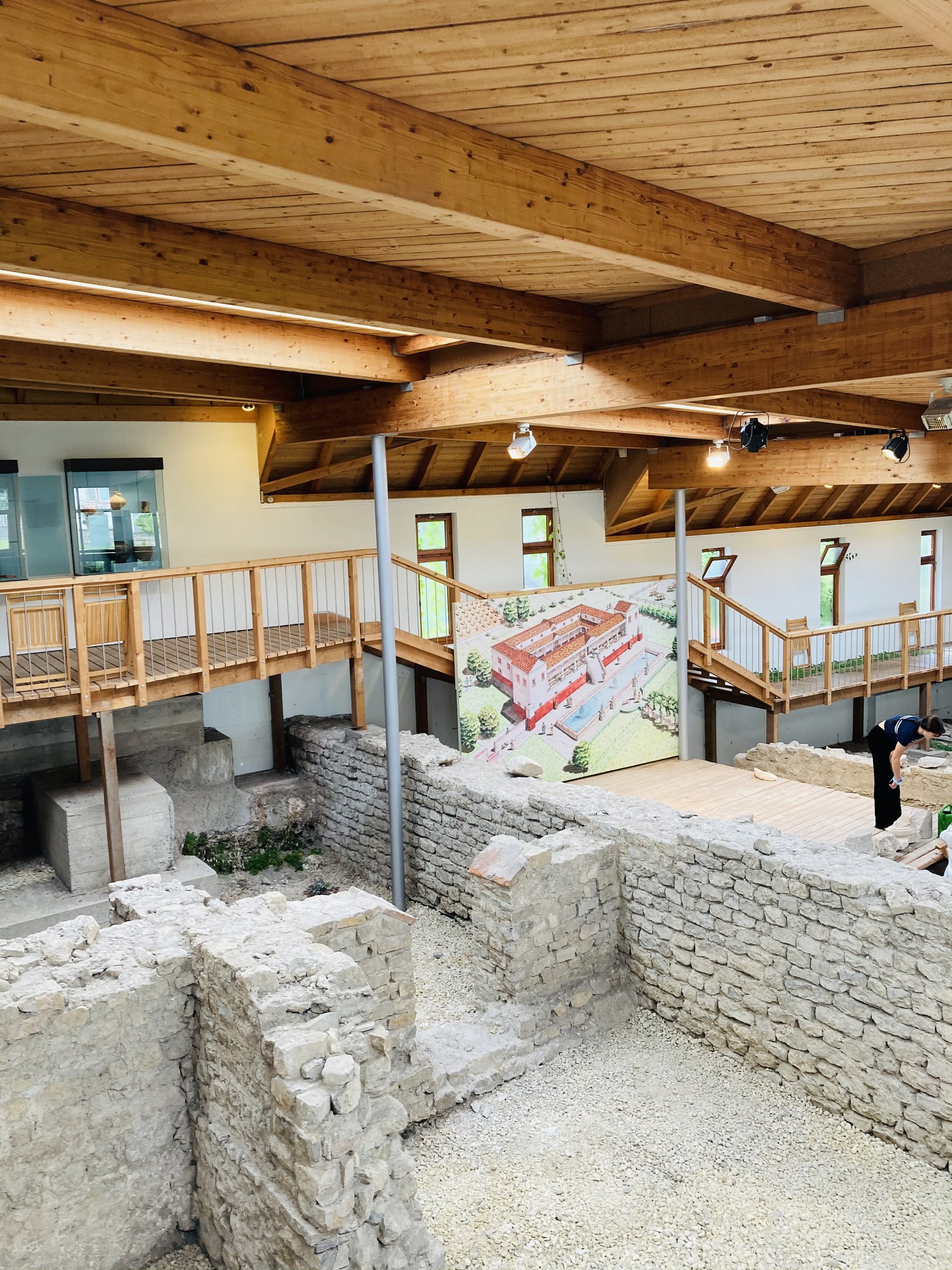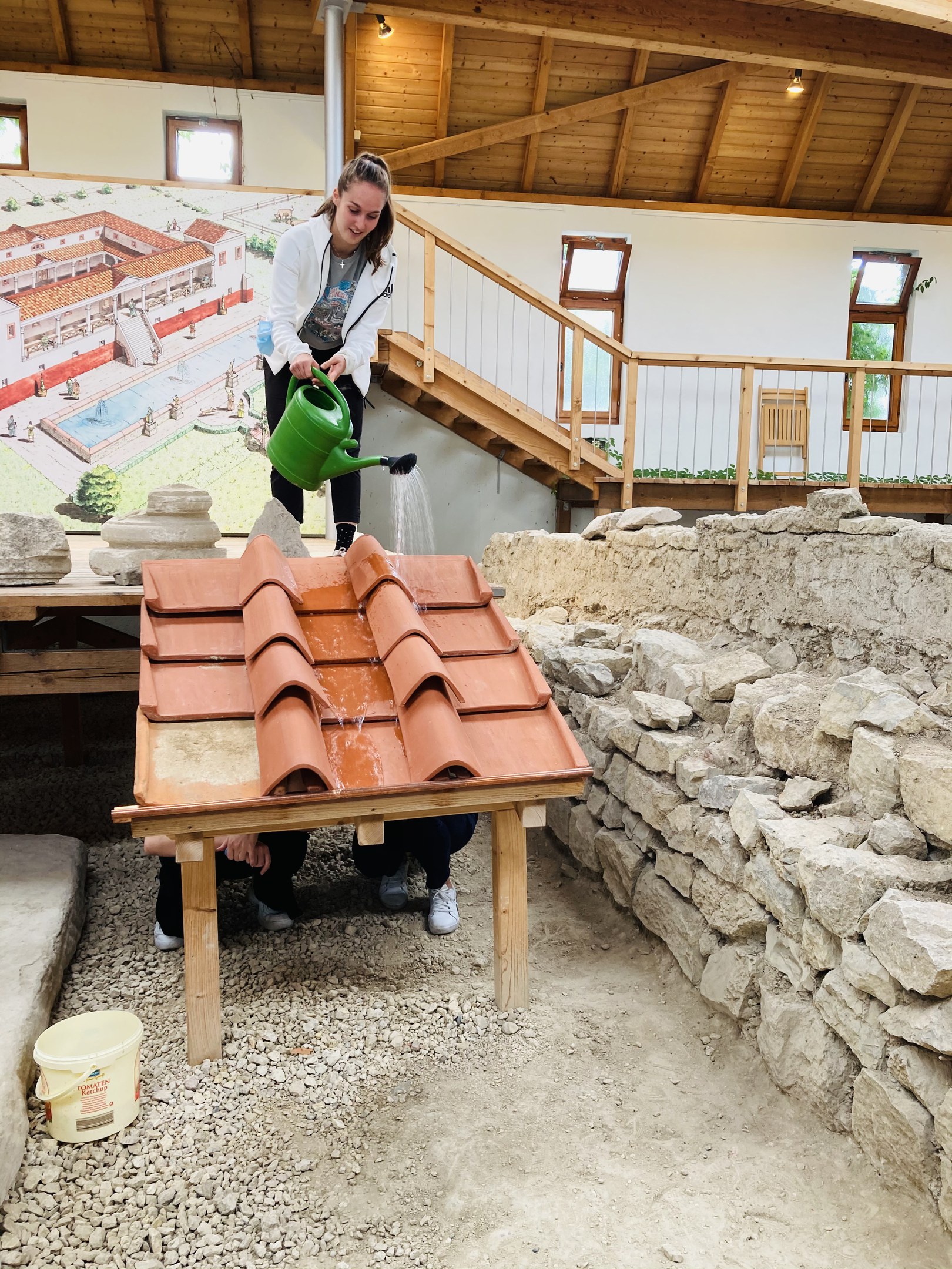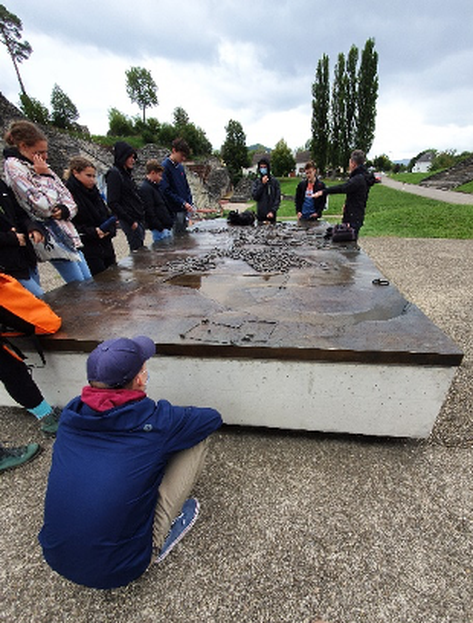 Wir starteten den Tag mit einem Besuch in der Römervilla in Grenzach. Während einer Führung betrachteten wir die Überreste der Villa und erfuhren viel Spannendes über die Geschichte der ganzen Region – angefangen von dem ersten Pissoir am Gymnasium am Münsterplatz, dem Lapis Cloacarius, über Münzen aus der Kaiserzeit bis hin zum richtigen Bedecken eines Daches mit Ziegeln wie man sie auch damals nutzte – mit anschliessendem Test.