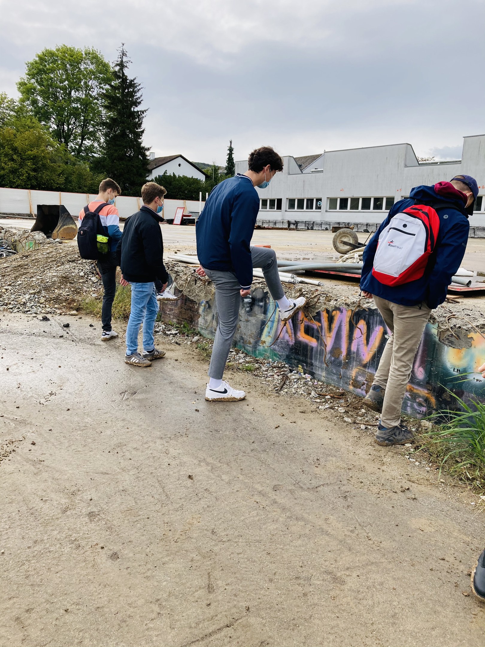 Unser Magister Herr Marcel Knaus hatte nicht zu viel versprochen, als er uns die Wanderschuhe für den heutigen Tag empfahl. Die Ausgrabungsstätte glich einer Baustelle, der Untergrund einer Schlammsuppe. Unbeirrt fanden wir uns in einem Halbkreis um Frau Bargetzi und Herrn Graber wieder, der uns über den Hintergrund der Ausgrabung berichtete: Nachdem vor zwei Jahren während Bauarbeiten an angrenzenden Häusern sehr alte Funde aufgetaucht waren, hatte sich die Bodenforschung eingeschaltet, als auch an der Inzlingerstrasse 51–53 gebaut werden sollte: Eine bis dato unbekannte Siedlung wurde hier vermutet. Um zu verhindern, dass deren Überreste bei den Bauarbeiten verloren gehen, können die Archäologen nun den Boden vorab bearbeiten. Diese Art der Ausgrabung nennt man Rettungsgrabung. Es sei die häufigste Art der Ausgrabung, erklärte uns Herr Graber. Besonders interessant: Eigentlich wäre es den Archäologen lieber, wenn sie die Ausgrabungen erst in Jahrzehnten machen müssten. Denn obwohl man heute schon viel weiter sei als noch vor vielen Jahren, erhoffe man sich durch die sich entwickelnde Technik der Forschungsmethoden in Zukunft noch einiges mehr an Informationen, ergänzt Frau Bargetzi.