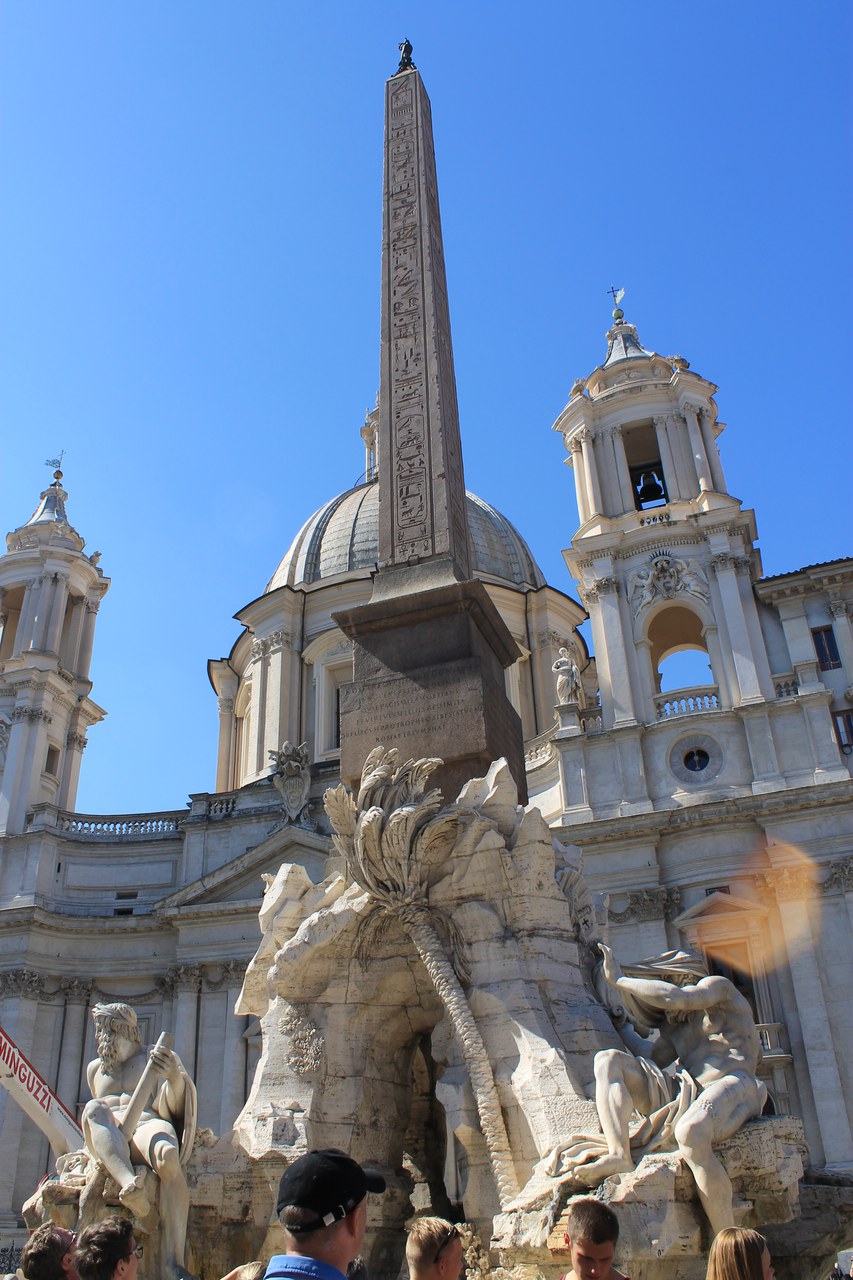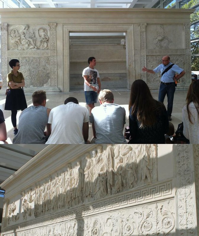 Am Dienstag ging es dann auf das frühere Marsfeld. Den Anfang machte ein Besuch im 2006 neu eröffneten Museo dell' Ara Pacis in einem Glasbau des Architektenbüros Richard Meier & Partners. In dieser lichtdurchfluteten Umgebung erklärte uns Antonio die wichtigsten Bestandteile des Altars, sowie dessen Lage auf dem früheren Marsfeld. Dazu gehörten diverse Allegorien auf die Grösse des Friedens-bringenden Kaisers August und dessen Regierungszeit. Als Beispiel wurde das Zusammenspiel der Ara Pacis mit dem Horologium des Augustus, einer riesigen Sonnenuhr, genannt. Am Tag des 23. Septembers (Augustus’ Geburtstag) wanderte der Schatten vom Morgen bis zum Abend die etwa 150 Meter lange Linie entlang, die genau durch den Altar des augusteischen Friedens führte und damit die hintergründige Botschaft vermittelte, der Kaiser sei zum Frieden geboren. Nach diesem informativen Einstieg ging es weiter zum Augustusmausoleum. Bei diesem heute relativ unscheinbaren und wenig gepflegten, weil stark überwucherten Bau erklärten uns Fiona und Martina diverse Details zu Augustus’ Leben, der Grabkultur im antiken Rom sowie interessante Details zu den verschiedenen Bauarten von Mausoleen und Grabstätten allgemein. Schlussendlich gelangten wir zum Pantheon, einem grossartigen Rundbau zur Anbetung der römischen Götter. Anna und Uma erklärten uns vor Ort, dass die Arbeiten zu diesem imposanten Gebäude im Jahre 27 v.Chr. in Angriff genommen und unter Kaiser Hadrian ums Jahr 120 n.Chr. fertiggestellt wurden. Als Prunkstück besitzt das Pantheon eine Kuppel mit einem Durchmesser von 43.3 Metern, in dessen Scheitelpunkt sich ein kreisförmiges Loch mit einem Durchmesser von neun Metern befindet. Diese „Opaion“ genannte Öffnung ist, nebst dem Eingang, die einzige Lichtquelle für das Innere des Pantheons. Beeindruckt von dieser um noch 30cm grösseren Kuppel im Vergleich zum Petersdom ging es zur letzten Tagesstation, der Piazza Navona, welche im Referat von Jasmin und Lukas eingangs als einer der schönsten Plätze der Welt bezeichnet wurde. Nicht einfach sich vorzustellen, dass an dieser Stelle im antiken Rom das Stadion des Domitian gestanden hatte, in welchem pompöse Spiele nach griechischem Vorbild und auch Wagenrennen stattgefunden haben sollen. Ausgehend davon führten uns die beiden Referenten durch die Jahrhunderte, in welchem die Piazza Navona eine Umgestaltung erfahren hatte und in dessen Zentrum nun die Fontana dei Quattro Fiumi (Vier-Ströme-Brunnen) des berühmten Römer Stadtarchitekten Bernini steht. Über den Verkörperungen der damals grössten bekannten Flüsse Donau, Rio del Plata, Nil und Ganges erhebt sich aus dem scheinbaren nichts ein tonnenschwerer Obelisk als Symbol der päpstlichen Herrschaft. Nach diesen vielfältigen Eindrücken hatten sich die Schülerinnen und Schüler den folgenden freien Restnachmittag redlich verdient.