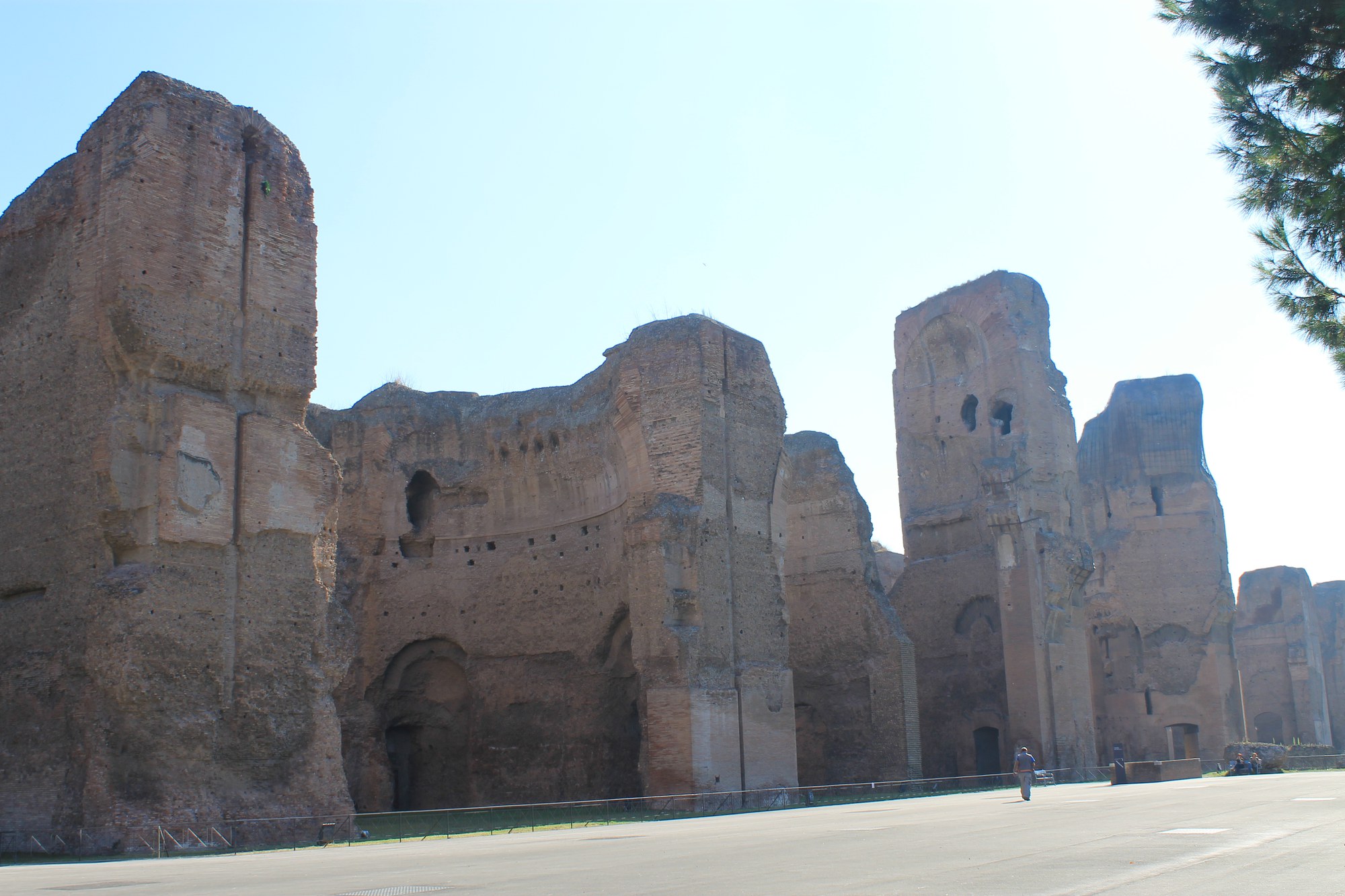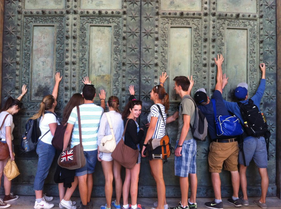 Am Donnerstag führte uns ein kurzer Spaziergang zu einer Kirche, die nur 500 Meter entfernt von unserem Hotel stand. San Giovanni in Laterano gehört neben Santa Maria Maggiore (am anderen Ende unserer Hotelstrasse, der Via Merulana), dem Petersdom und San Paolo fuori le Mura zu den vier Patriarchalkirchen. Sie sind direkt dem Papst unterstellt und gehören damit auch territorial zum Gebiet des Vatikan. Die Lateranskirche ist zudem offizielle Bischofskirche in Rom. Ihr Name geht auf den römischen General Sextius Lateranus aus dem 2. Jh. n. Chr. zurück, der der Besitzer des Grundstücks war. Bekannt ist der Name heute auch durch die Lateran-Verträge von 1929, die das politische Verhältnis zwischen Rom und der Vatikanstadt neu regelten. Für unser Antike-Programm war neben der Taufkirche aus dem 4. Jahrhundert zweifellos bemerkenswert, dass die Bronzetüren des Hauptportals jene der Curia des Forum Romanum sind. Nachdem Andreas Külling in seinem Referat erwähnte, dass an dieser Porte bereits die Hände Cäsars und Ciceros das bronzene Metal berührten, liessen es sich die Schülerinnen und Schüler nicht nehmen auch Ihre eigenen "Handabdrücke" zu hinterlassen. Zu Fuss ging es weiter zu den Thermen von Caracalla, im alten Rom eher Freizeitzentrum denn Bad. Marijella und Sophie stellten uns inmitten der beeindruckend hohen Überreste dieser Thermen die Einrichtung vor. Sie beschrieben den allgemeinen Badebetrieb, die vielfältigen Nutzungsmöglichkeiten und die architektonisch ausgeklügelt konstruierten Systeme, die es erst ermöglichten, all die Bedürfnisse auf der 33'000 Quadratmeter grossen Fläche zu erfüllen. Einzigartig dabei die eigens errichtete Wasserversorgung mittels Aquädukt und das unterirdische Umluftsystem, das Hunderte von Sklaven in Gang hielten. Die Thermen boten gleichzeitig Platz für 1600 Besucher, was einer Maximalkapazität von 8000 Badenden pro Tag entspricht. Zurück bei der Lateranskirche gelangten wir mit dem Bus zu den ausserhalb Roms gelegenen Katakomben von San Callisto, wo wir unter Schatten spenden Bäumen Mittagspause machten. In der anschliessenden Führung durch die Katakomben erfuhren wir Interessantes zu den Begräbnis-Ritualen der frühen Christen und dem auf 5 Ebenen angelegten, 370'000 Gräber beinhaltenden und 20 km umfassenden Gräber- und Gangsystem. Wieder an der frischen Luft ging es zur eine halbe Fussmarsch-Stunde entfernten Via Appia. Nach einem Besuch des dort gelegenen Grabmals der Caecilia Metella referierten Anton und Florian zur 540 km langen Verbindung Roms mit Brindisi. Anschaulich führten sie uns dabei in Konstruktion und Betrieb dieser für Militär und Handel so wichtigen Strasse ein. Nach einer weiteren halben Stunde Wanderung auf der Via Appia kehrten wir nach einer schweisstreibenden Busfahrt ins noch wärmere Rom zurück, wo es in den verdienten, zur freien Verfügung stehenden Abend ging.