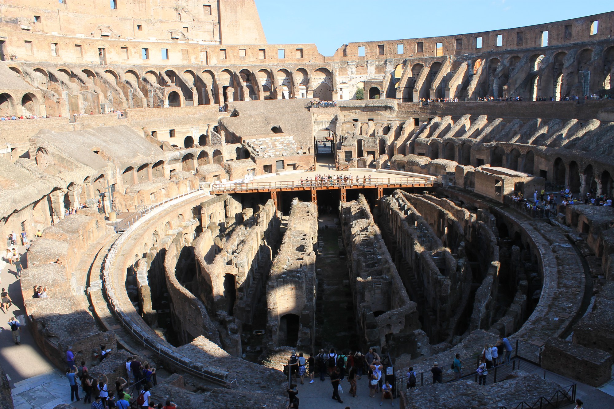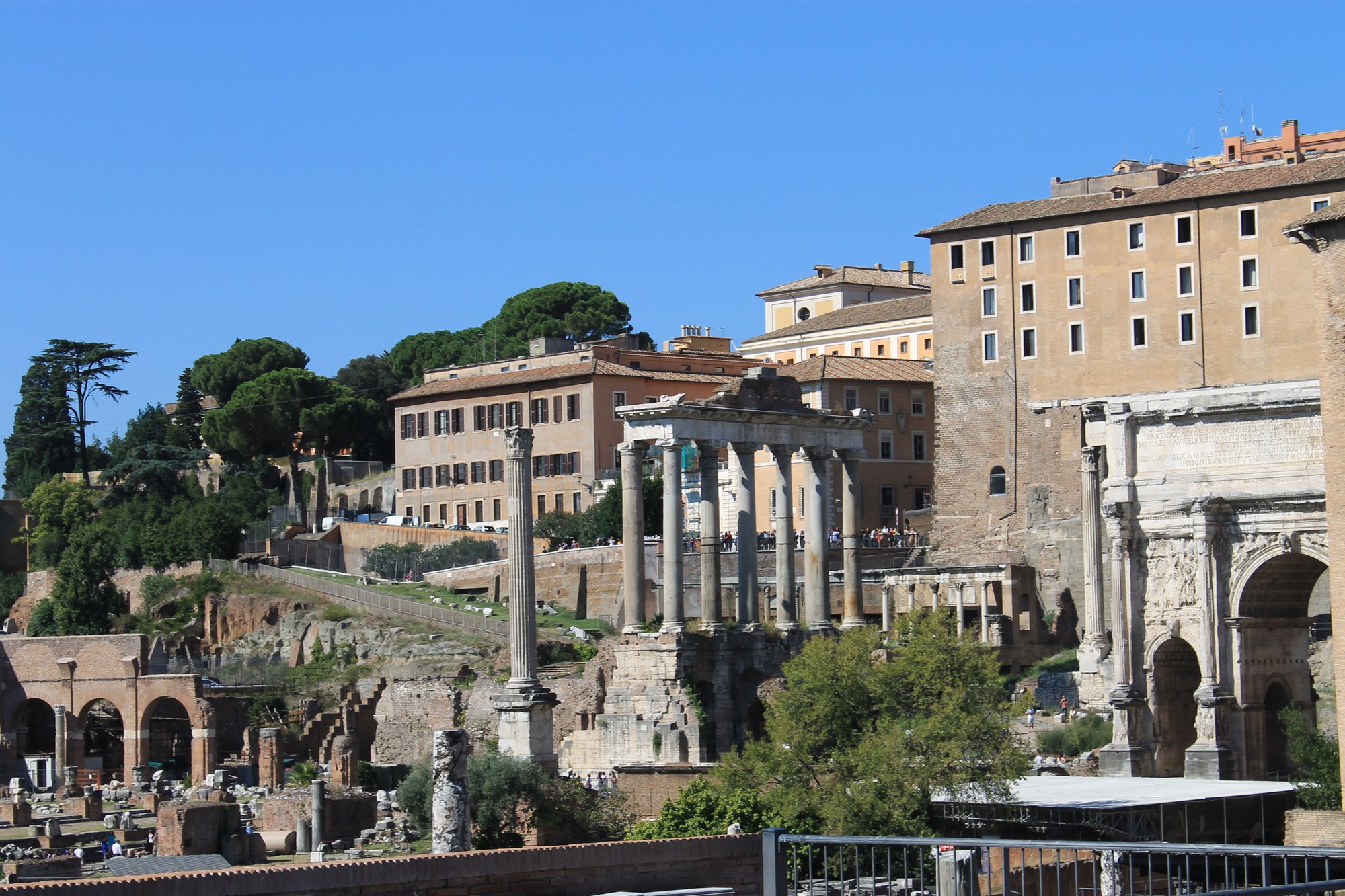 Nach dem einfachen und guten Frühstück ging es jeweils zwischen 8 und 8.30 Uhr morgens los. Gleich am ersten Tag, dem Montag, standen fünf Referate auf dem Programm. Nach einem Spaziergang vorbei am beeindruckenden Kolosseum hinauf zum Capitol erklärten uns Felix und Samuel, dass in frühester Zeit hier die ersten Gebäude (die Arx und die beiden wichtigsten Tempel, der des Jupiter Optimus Maximus Capitolinus und der Juno Moneta) errichtet wurden. Die beiden erläuterten die Gesamtanlage, die im Laufe der Jahrhunderte ständig umgebaut und -funktioniert wurde, bevor sie auf die Reiterstatue des Marc Aurel eingingen, welche erhalten blieb, da man sie lange für jene des Kaisers Konstantin hielt. Abgerundet wurde dieses erste Referat mit einer Besichtigung der Kirche Santa Maria in Aracoeli, nachdem man die 124 Stufen zum Eingang erklommen hatte. Entschädigt wurde man mit einer wunderbaren Aussicht, vorbei an der Stadtwohnung von Sophia Loren bis hin zum Vatikan. Nach kurzem Spaziergang und Wartezeit gelangten wir zum Eingang des Forum Romanum, wo uns Adrian und Jonas während ihres Referats zu den einzelnen Bauten führten und dabei die jeweilige Geschichte dieser erklärten. Dabei gingen sie in grosser Hitze unter anderem auf den Tempel der Vesta, das Haus der Vestalinnen, die Curia Iulia und den Titusbogen ein. Anschliessend war Mittagspause auf dem Palatin. Ausgehend von der Ursprungssage zur Entstehung Roms gingen Fabienne und Fiona dort in ihren Ausführungen besonders auf die riesigen Bauten ein (Stadion, Wohn-Paläste der Angehörigen der Kaiserfamilie (u.a. Haus der Livia mit den komfortablen Einrichtungen, das mythische Haus des Romulus, die Domus Flavia und die Domus Augustana)). Mittels kurzem Spaziergang gelangten wir zu einer kleinen Anhöhe oberhalb des Circus Maximus, in dessen Bau mit den spektakulären Ausmassen uns das Referat von Lea und Stephanie einführte. Bildlich erläuterten sie uns, wie es zu früheren Zeiten an dieser Stätte zugegangen war und erklärten uns Begriffe wie Ludi und Pompa Circensis sowie den Ablauf der Wagenrennen. Erwähnt wurde auch der höchste Obelisk in Rom, der eine der Wendemarken im Circus Maximus bildete und den wir im Verlauf der Woche noch bei der Lateranskirche bestaunen konnten. Schluss des geführten Tages-Programms bildete der Besuch des Kolosseums. Julie und Lucie erklärten uns anschaulich die Architektur dieses heutigen Wahrzeichens von Rom und die zugehörige Baugeschichte. Nicht zu kurz kam auch die Schilderung der damaligen Nutzung mit den verschiedensten Wettkämpfen. Vieles erinnert dabei an heutige Sportstätten, auch wenn sich die Wahrnehmung von "moralischen" und "umoralischen" Spielen, zum Glück aus heutiger Sicht, verändert hat. Beeindruckend wie durch die ausgeklügelte Konstruktion die Arena in sehr kurzer Zeit gefüllt oder geleert werden konnte.