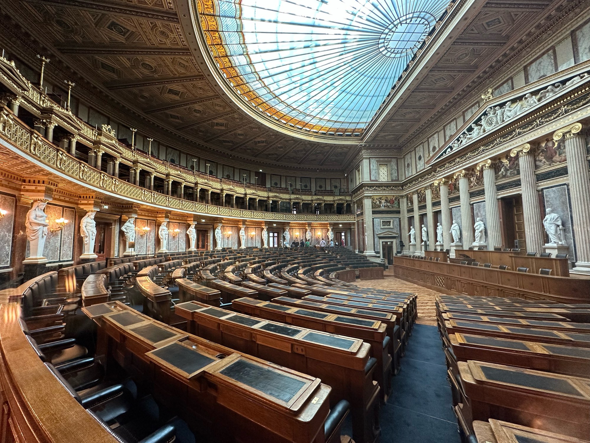 Unsere Führungsperson leitete uns dann einmal durch das Gebäude, durch eine wunderschöne Säulenhalle in die alten Gänge, durch einen weiteren grossen Eingangsbereich und schliesslich bis in den obersten Stock. Von ganz oben konnten wir dann durch Glasscheiben auf den neuen Ratssaal herabblicken, in welchem tatsächlich gerade eine internationale Sitzung stattfand. Einer der Personen hat uns sogar unauffällig zugewinkt.