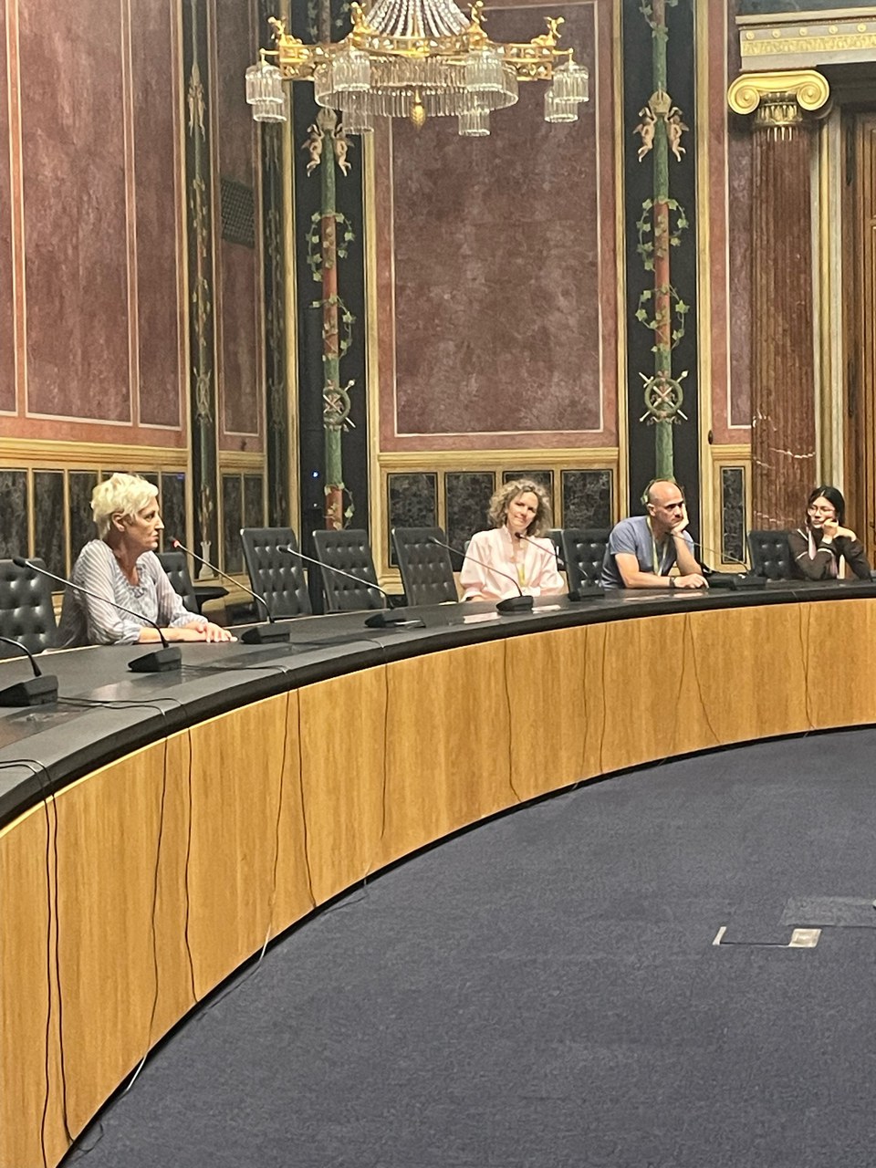 Am Ende der Führung gesellte sich eine Politikerin Österreichs zu uns und geleitete uns dann zu einem Sitzungszimmer, welche sie extra für uns reserviert hatte. Sibylle Haman ist eine grüne Nationalratsabgeordnete und Bildungssprecherin. Sie hat sich für uns sehr viel Zeit genommen und uns alles erklärt und beantwortet, was wir wissen wollten. Da sie Bildungssprecherin ist, haben wir gleich die Chance genutzt und sie auf unseren geplanten Ausflug am Mittwoch zur Reformpädagogischen Schule befragt.