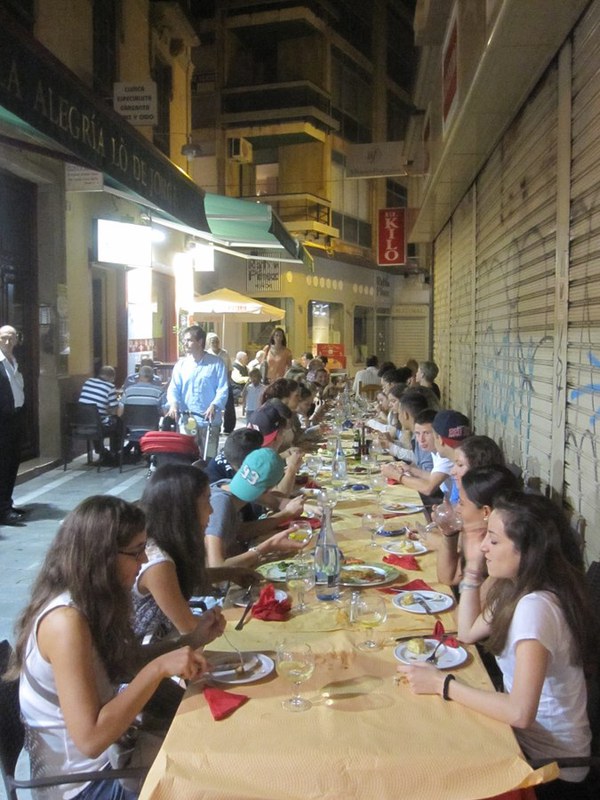 Mit noch immer schmerzenden Beinen trafen wir uns vor dem Abendessen dann wieder und hörten den interessanten, jedoch von Zeit zu Zeit im Geläute der Glocken untergehenden (wir waren im Freien, auf einem sehr belebten Platz) Vortrag von Salome Kaufmann über Federico García Lorca y la generación del 27. Sie erzählte uns viele interessante Details zu Leben und Werk des Schriftstellers aus der Provinz Granada, der zu Beginn des Spanischen Bürgerkriegs Opfer der nacionales wurde. Danach assen wir gemeinsam unter freiem Himmel, bei nicht mehr ganz so warmen Temperaturen, in einer kleinen Gasse zu Abend. Das Essen war nicht schlecht, da wir aber mit 27 Personen sehr nahe an die maximale Belastung des Restaurantes mit nur einer (genervten) Bedienung kamen, dauerte es sehr lange, bis wir alle gegessen und bezahlt hatten. Da wir aber mittlerweile schon mit dem “horario español” vertraut waren, machte uns das nichts weiter aus und wir genossen das Zusammensein in unserer tollen Gruppe.