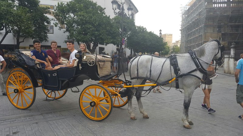 Das heutige Frühstück bestand aus Churros und Tostadas con tomate mit Orangensaft und/oder Kaffee oder Colacao. Vor der Stierkampfarena von Ronda hielten Eva und Tea eine Präsentation über die „Tauromaquia“. Die Stierkampfarena , die älteste Spaniens, beeindruckte uns sehr, ebenso wie der atemberaubende Ausblick auf den Puente Nuevo. Nachdem wir uns in panaderias und supermercados eingedeckt hatten, fuhren wir mit dem Bus nach Sevilla. Auf dem Fussweg zum Hotel streiften wir durch das jüdische Viertel und kamen dabei auch an der schmalsten Strasse Sevillas vorbei. Es war sehr heiss. Somit wurde die Siesta-Zeit von manchen für ein kurzes Nickerchen im Zimmer genutzt. Danach trafen wir uns alle auf der Terrasse, von der aus man auf die Kathedrale sah, und hörten uns Evas Vortag über den Schriftsteller Frederico García Lorca an. Frau Hernández und Frau Jansky überraschten und dann mit einer Kutschenfahrt durch das Zentrum von Sevilla. Wir wurden an vielen einzigartigen Gebäuden vorbeikutschiert. Nach dem Abendessen trafen wir uns pünktlich um 23 Uhr vor dem Hotel, um für den nächsten Tag wieder fit zu sein.