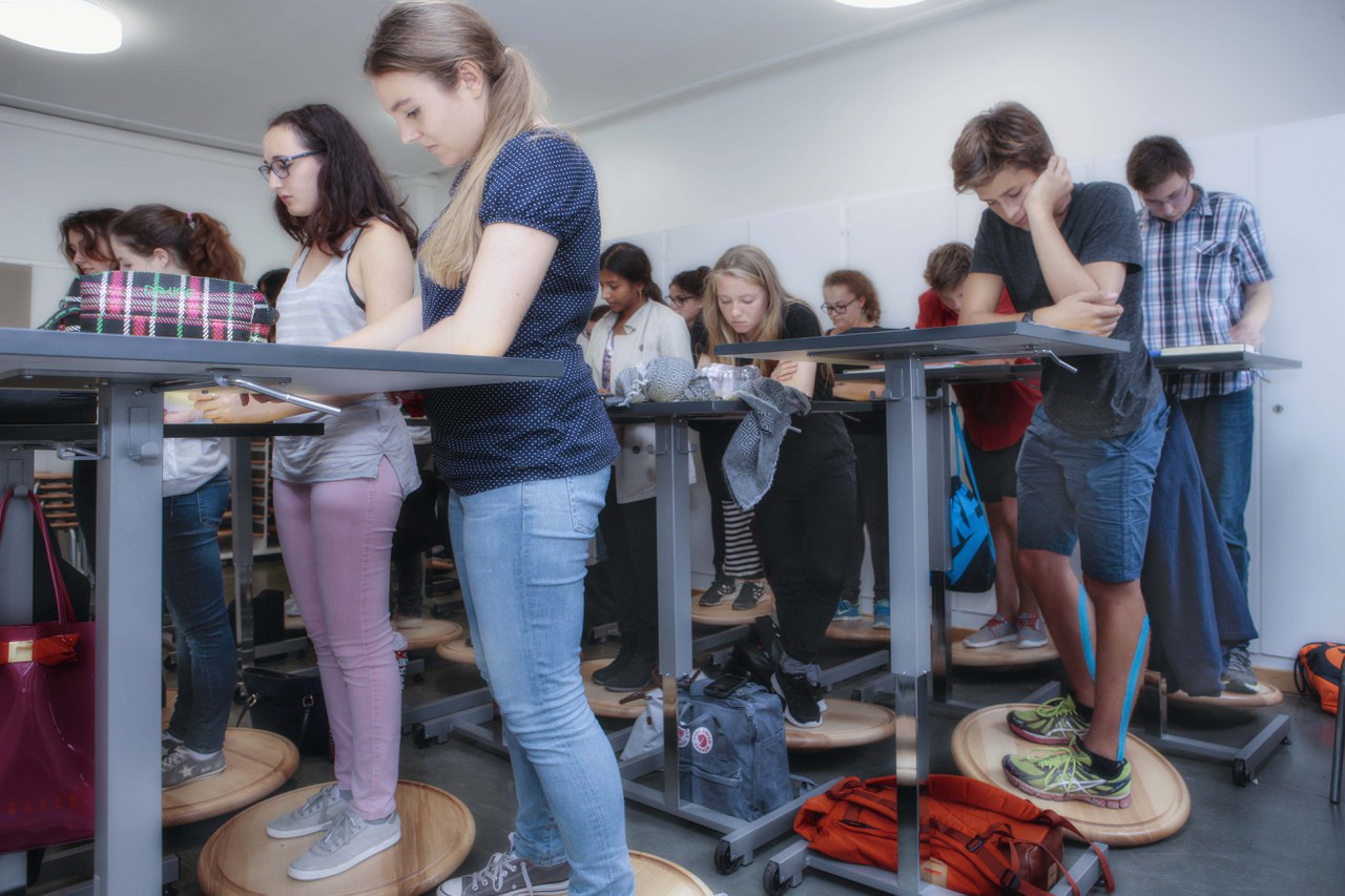 Bewegtes Gymnasium (Stehpulte und Stehkreisel für dosierte muskuläre Bewegung beim Lernen)