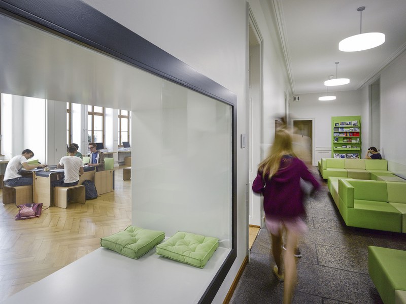 Lernzentrum, Aufenthaltsraum und Schulgänge: Eine Fachgruppe, bestehend aus Schülerinnen und Schülern, Lehrpersonen, Innenarchitekten und der Schulleitung, entwickelte für das Gymnasium am Münsterplatz neue Bereiche, welche für modernen Unterricht und bequemen Sitzkomfort sorgen.