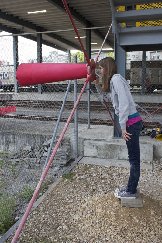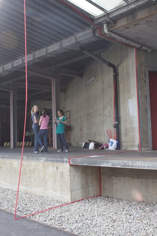 “Das rote, runde Loch erschien uns erstmals interessant und ansehnlich. Wir empfanden es als sehr speziell, dass man beim Konstruieren des Gebäudes solche auffällige Teile als Stützen verwendet hatte. Die schmalen, roten Stäbe, die in der Mitte zusammentreffen und durch den ebenfalls roten Ring verbunden sind, fanden wir spannend. Diesen Ort lokalisierten wir neben einer steil abfallenden Mulde, versteckt hinter einer Treppe und empfanden ihn als besonders und genau passend für unsere Gestaltungsarbeit. ...“
