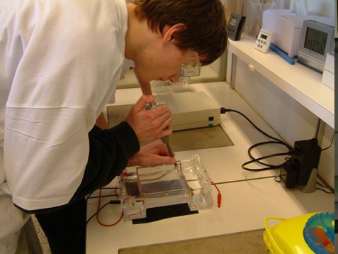 Luckily, being located in Basel (historically the world Pharma-capital) Gymnasium am Münsterplatz has numerous opportunities for collaboration & student placements on our doorstep. When studying Genetics & Biotechnology at school we spend a whole day performing biotech experiments at the Novartis Schullabor, just the other side of The Rhine. Our students experience working with genetically modified E.coli; advanced techniques to capture & purify DNA; identification of DNA origin by restriction analysis; and then separation & visualization of DNA fragments by gel electrophoresis (“DNA fingerprinting”). In an alternative practical, students extract their own genomic DNA, amplify by PCR (Polymerase Chain Reaction) and process it, performing SNP (single nucleotide polymorphisms)-Genotyping on a taste receptor.