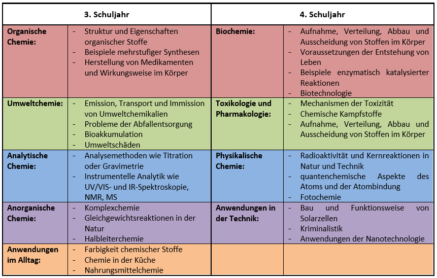 Das Ergänzungsfach Chemie bietet eine Vertiefung vieler Inhalte des Grundlagenfachs. Damit werden die Themen des Grundlagenfachs für interessierte Lernende umfänglicher und tiefgreifender verständlich und ihre gesellschaftliche Bedeutung kann in einem fächerübergreifenden Zusammenhang verdeutlicht werden. Jedoch kommen auch viele neue Sachverhalte hinzu. Zahlreiche Beispiele hierfür sind im Lehrplan (siehe unten) aufgeführt.
