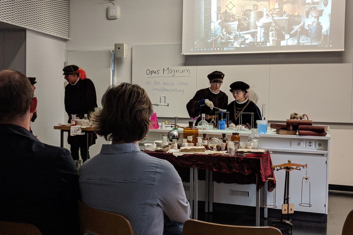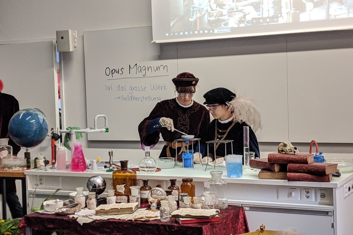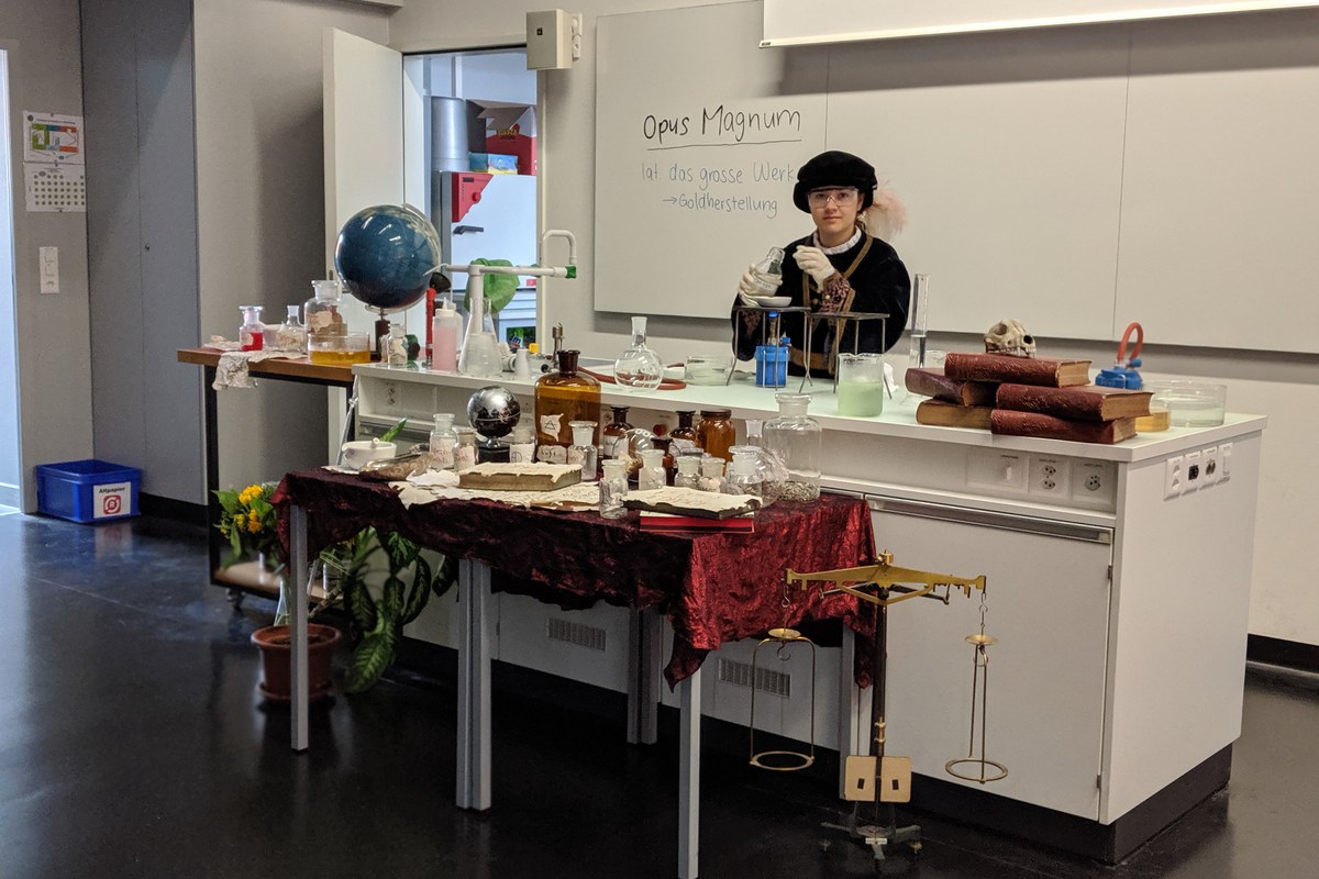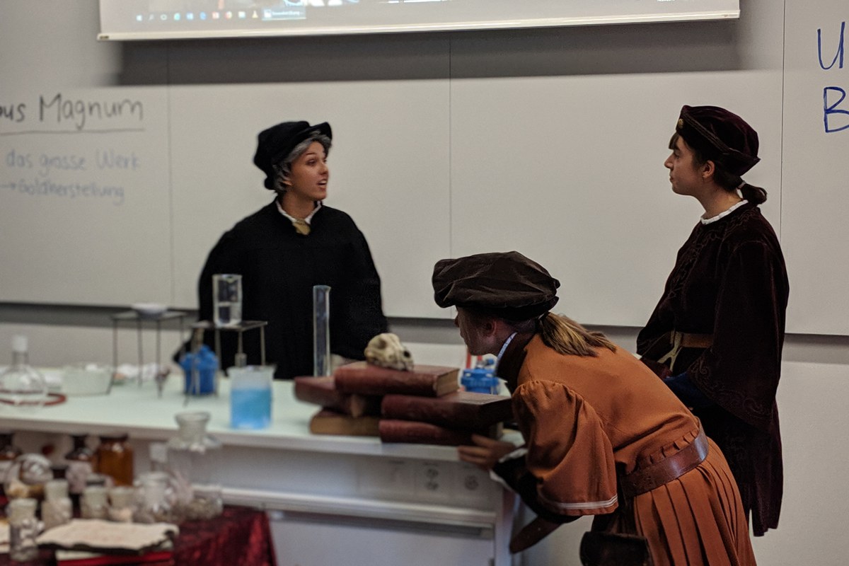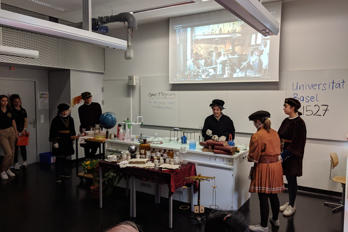 Zum Europäischen Tag des Denkmals "1000 Jahre Gymnasium am Münsterplatz" wurden während einer Projektwoche im Juni 2019 verschiedene Themengebiete szenisch aufgearbeitet. Die Klasse 1B widmete sich dem Thema "Alchemie und Paracelsus". Zur Inspiration diente eine aufschlussreiche, geführte Exkursion ins Pharmaziemuseum der Universität Basel mit Schwerpunkt auf Theophrastus Bombast von Hohenheim, besser bekannt als Paracelsus. Daraufhin erarbeitete die Klasse eine Theaterszene, welche Paracelsus im Diskurs mit seinen Studenten im Jahr 1527 an der Basler Universität darstellt. Während Paracelsus die damals gültige "Krankheitslehre von den Körpersäften" kritisiert und in Frage stellt und somit die Alchemie nutzt, um neue Arzneimittel zu entwickeln, wollen seine Studenten davon nichts wissen, sondern streben lediglich danach, das Opus Magnum zu vollenden und somit Gold herzustellen. Natürlich durfte die entsprechende (AL-)CHEMIE bei diesem spannenden Theaterstück nicht fehlen! Über merkwürdige qualmende Lösungen, welche ihre Farbe wechselten, Silber- und Goldherstellung (?!?) sowie eine Hand, die in Flammen aufging, war alles dabei...