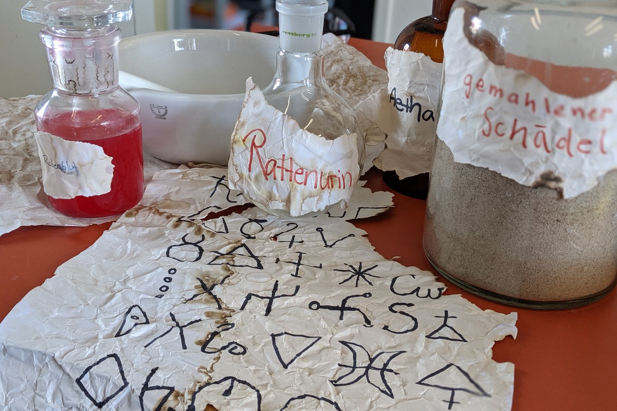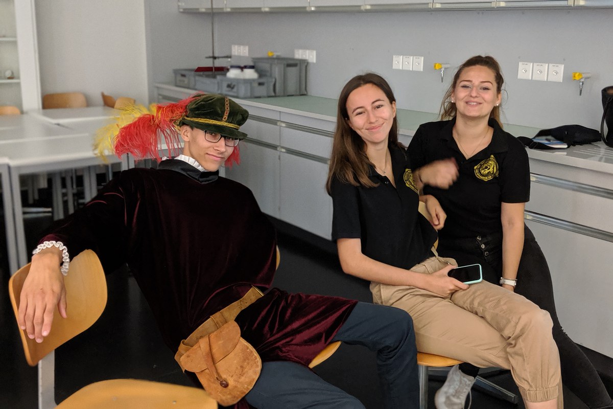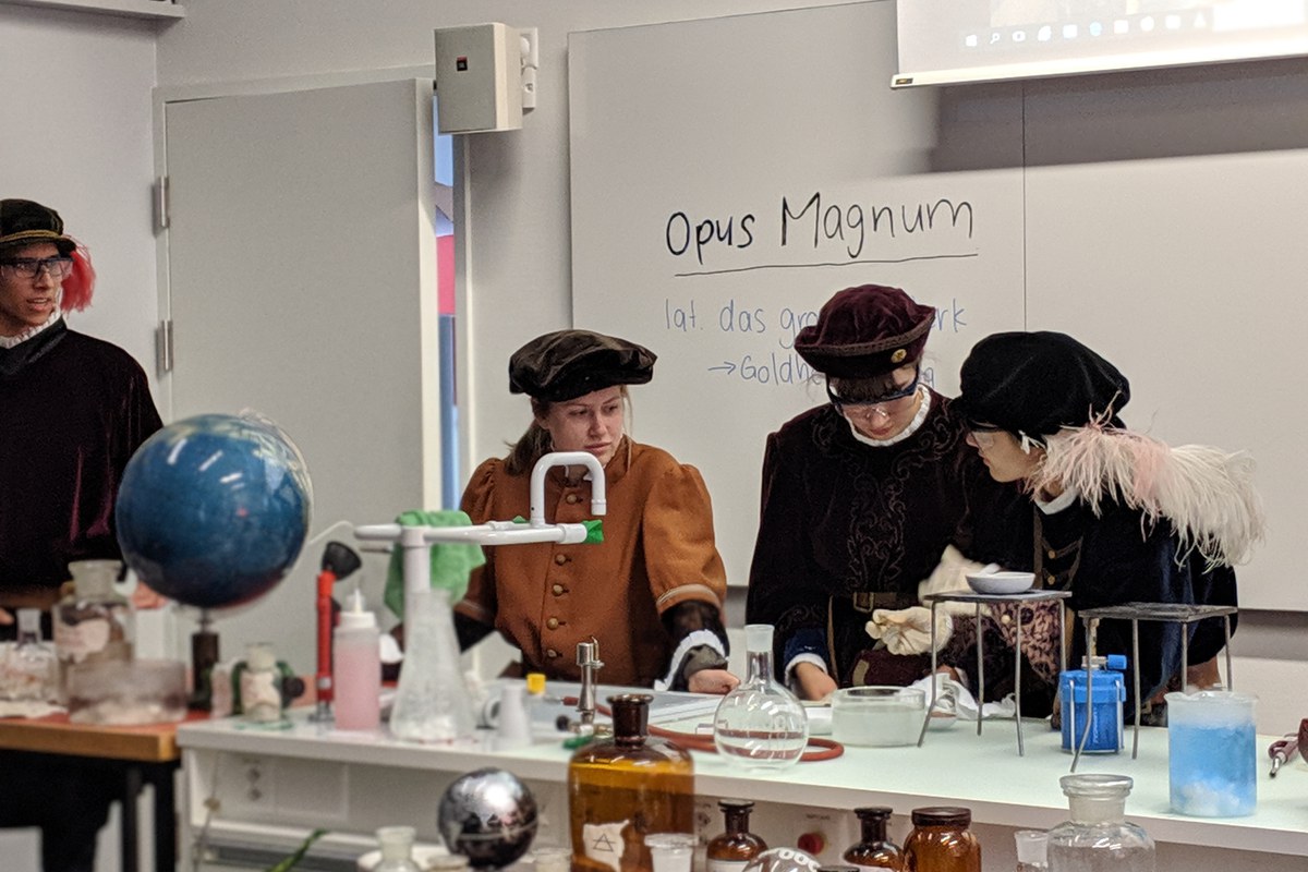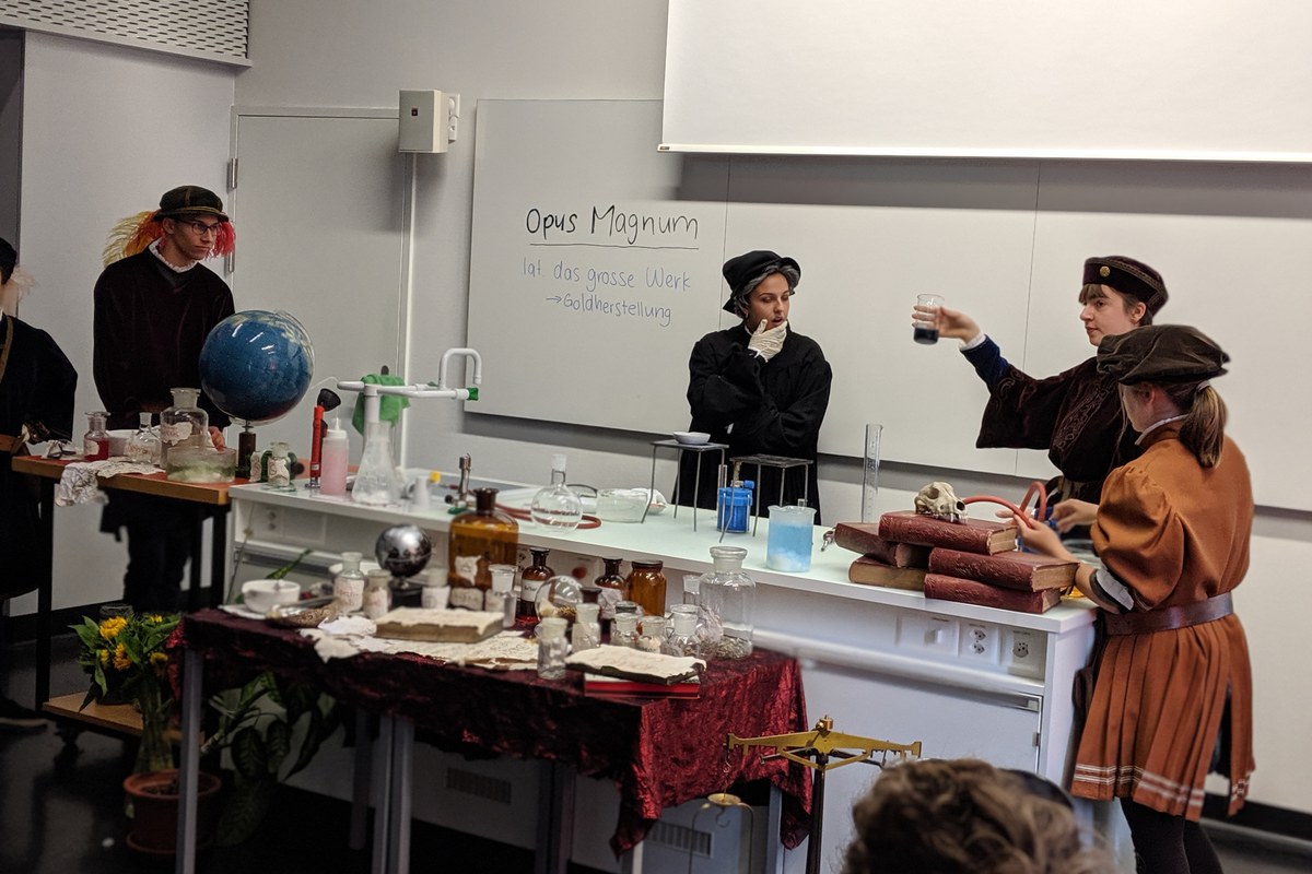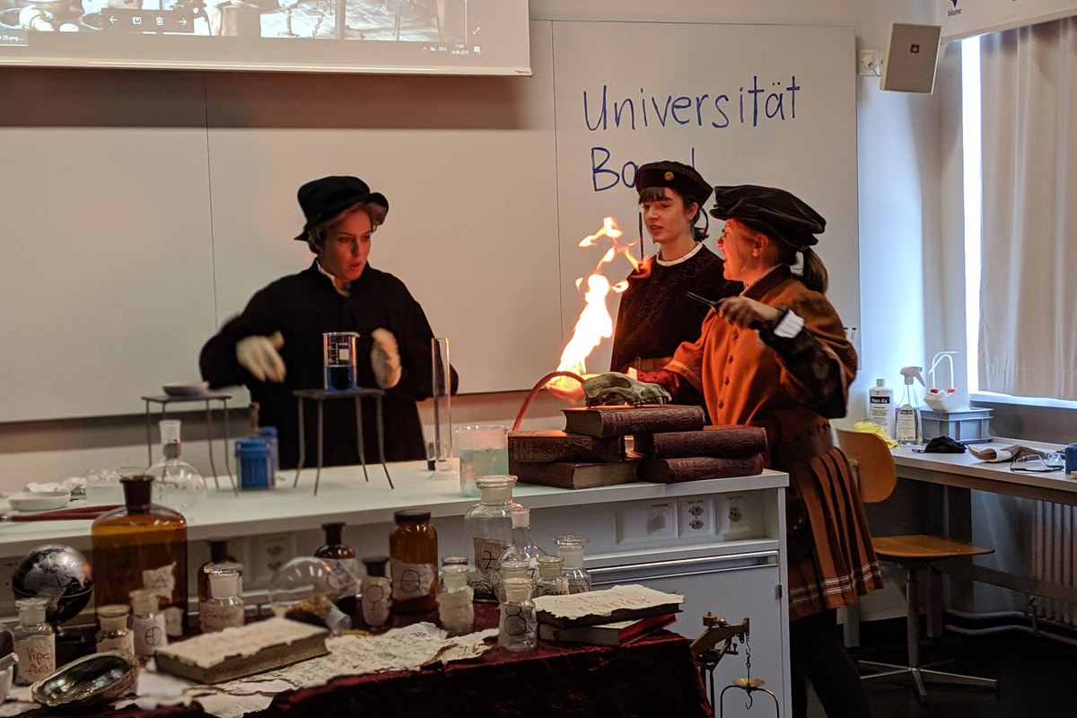 Zum Europäischen Tag des Denkmals "1000 Jahre Gymnasium am Münsterplatz" wurden während einer Projektwoche im Juni 2019 verschiedene Themengebiete szenisch aufgearbeitet. Die Klasse 1B widmete sich dem Thema "Alchemie und Paracelsus". Zur Inspiration diente eine aufschlussreiche, geführte Exkursion ins Pharmaziemuseum der Universität Basel mit Schwerpunkt auf Theophrastus Bombast von Hohenheim, besser bekannt als Paracelsus. Daraufhin erarbeitete die Klasse eine Theaterszene, welche Paracelsus im Diskurs mit seinen Studenten im Jahr 1527 an der Basler Universität darstellt. Während Paracelsus die damals gültige "Krankheitslehre von den Körpersäften" kritisiert und in Frage stellt und somit die Alchemie nutzt, um neue Arzneimittel zu entwickeln, wollen seine Studenten davon nichts wissen, sondern streben lediglich danach, das Opus Magnum zu vollenden und somit Gold herzustellen. Natürlich durfte die entsprechende (AL-)CHEMIE bei diesem spannenden Theaterstück nicht fehlen! Über merkwürdige qualmende Lösungen, welche ihre Farbe wechselten, Silber- und Goldherstellung (?!?) sowie eine Hand, die in Flammen aufging, war alles dabei...