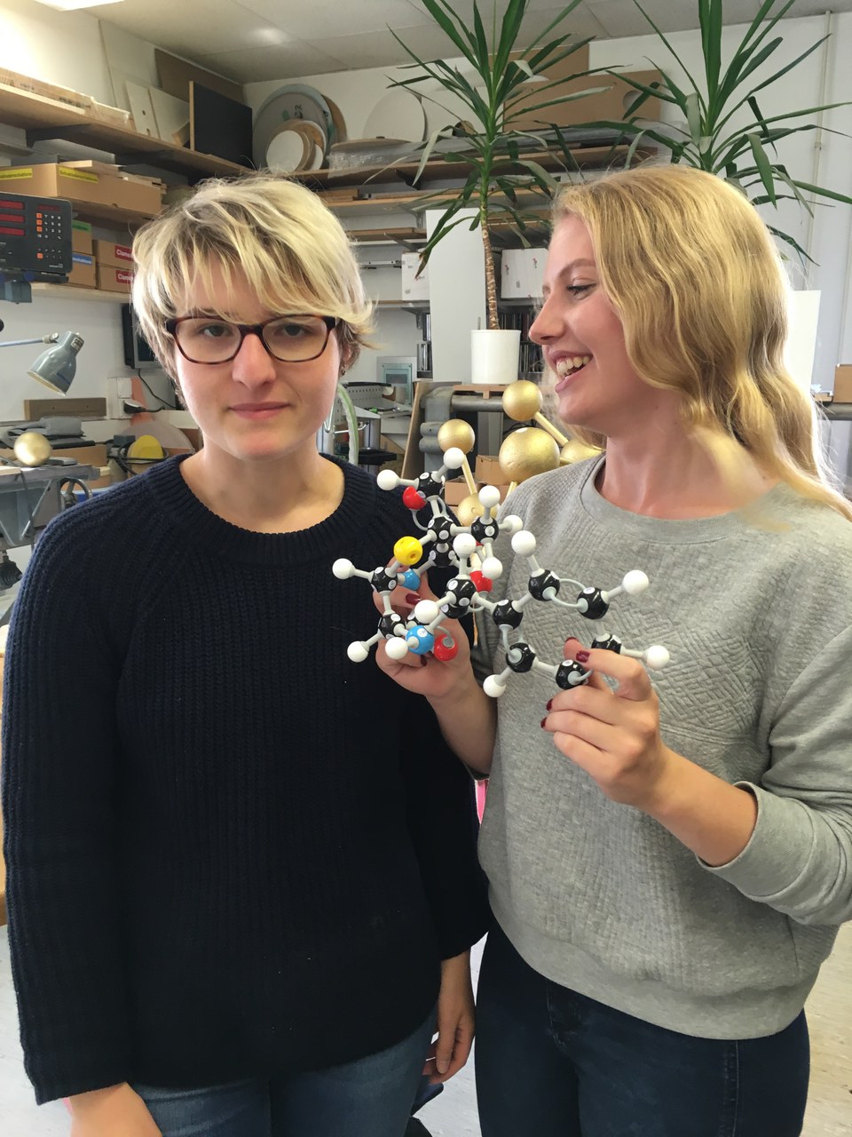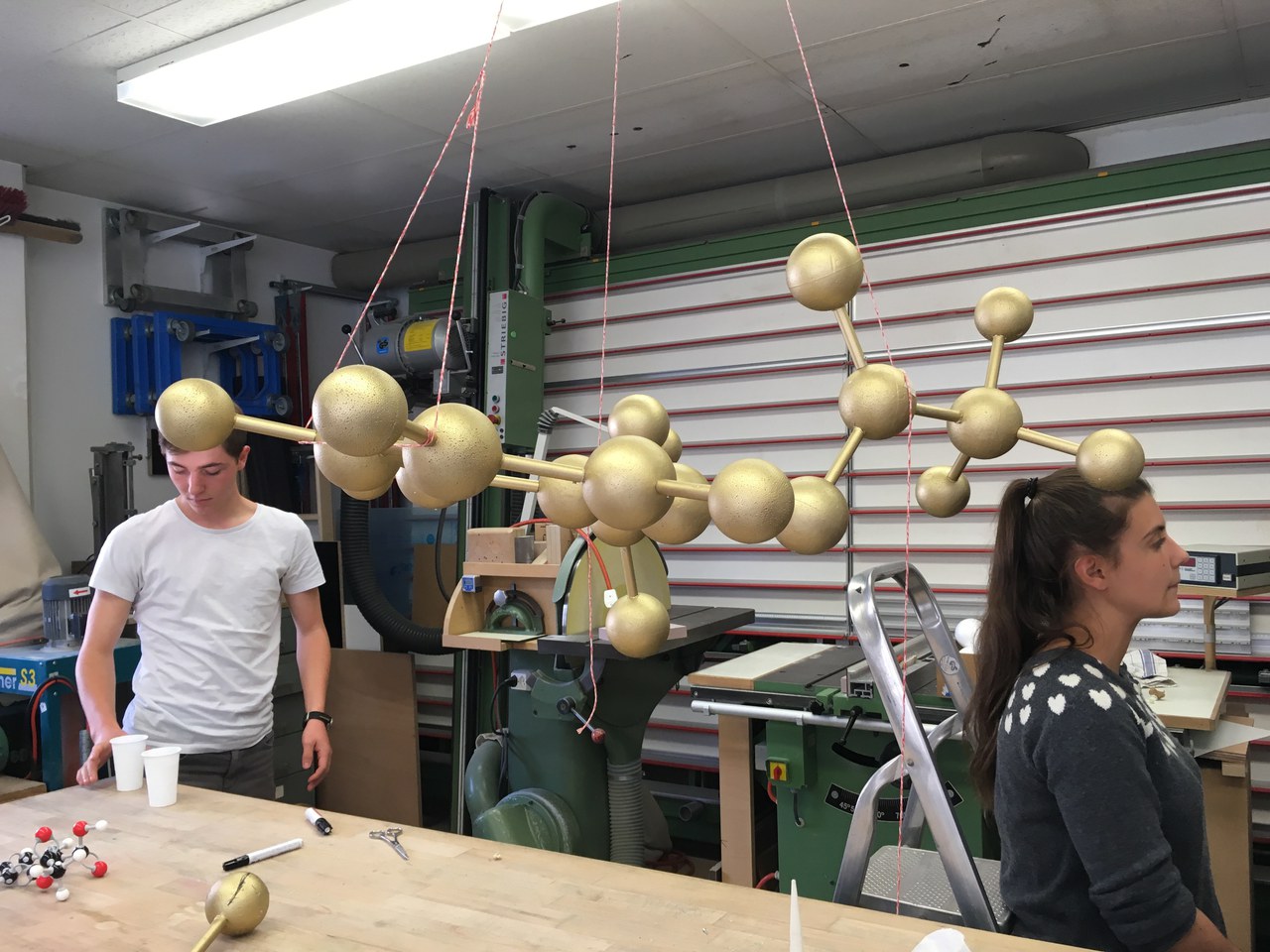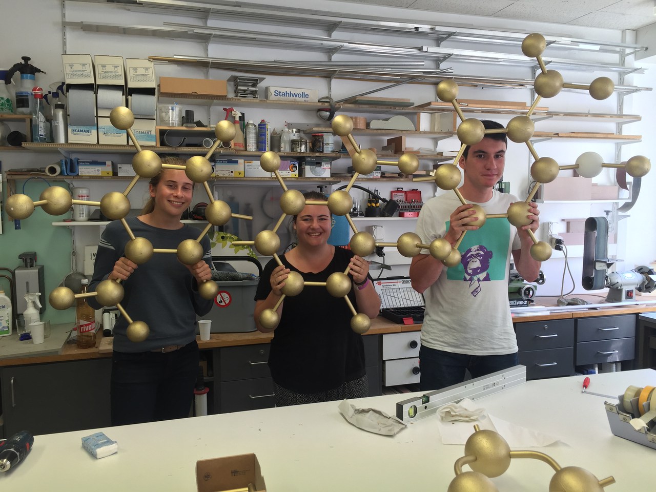 Die räumliche Struktur der Moleküle wurde mit einem Programm berechnet und am Computer dreidimensional visualisiert. Anhand der digitalen Modelle bauten die Schülerinnen und Schüler die Moleküle in kleinem Massstab mit einem Molekül-Baukasten und beschrieben ihre Geometrie. Diese Modelle wiederum dienten dem Modellbauer als Grundlage für den Bau der vergoldeten Ausstellungsmodelle. Anschliessend bauten die EF Chemie-TeilnehmerInnen die Bausteine in der Werkstatt zusammen und optimierten diese nach Aspekten der Chemie, der Statik und der Ästhetik.