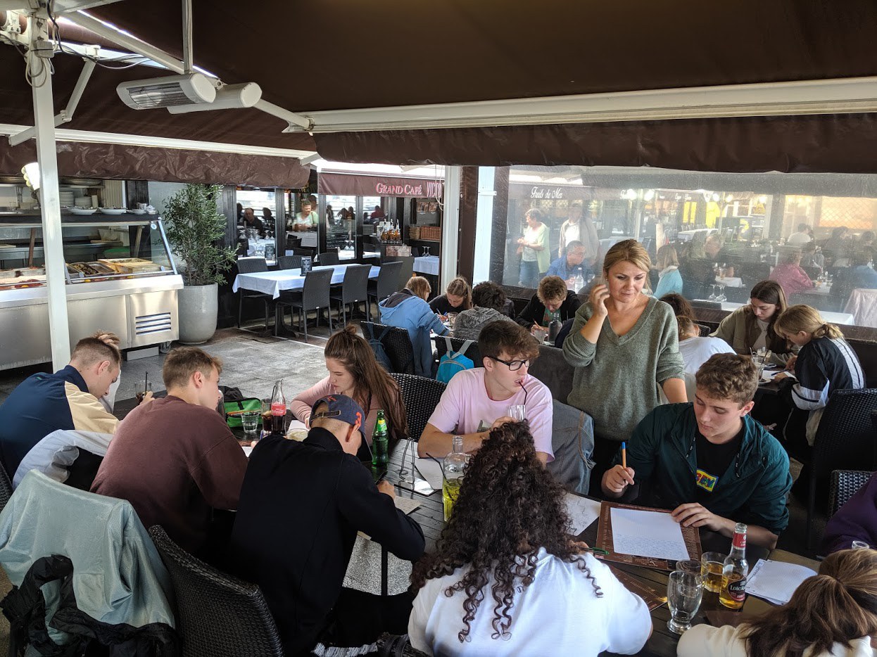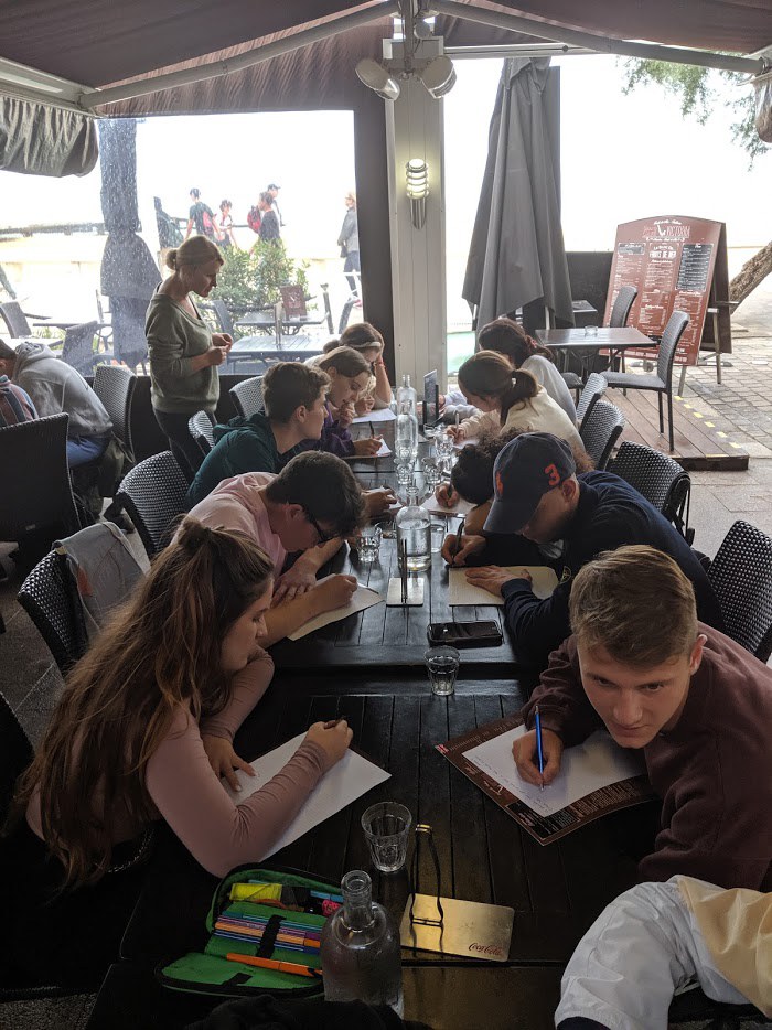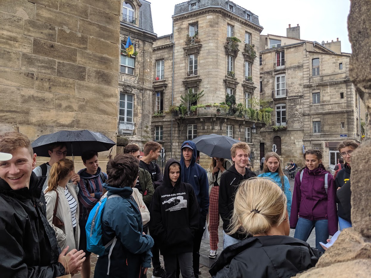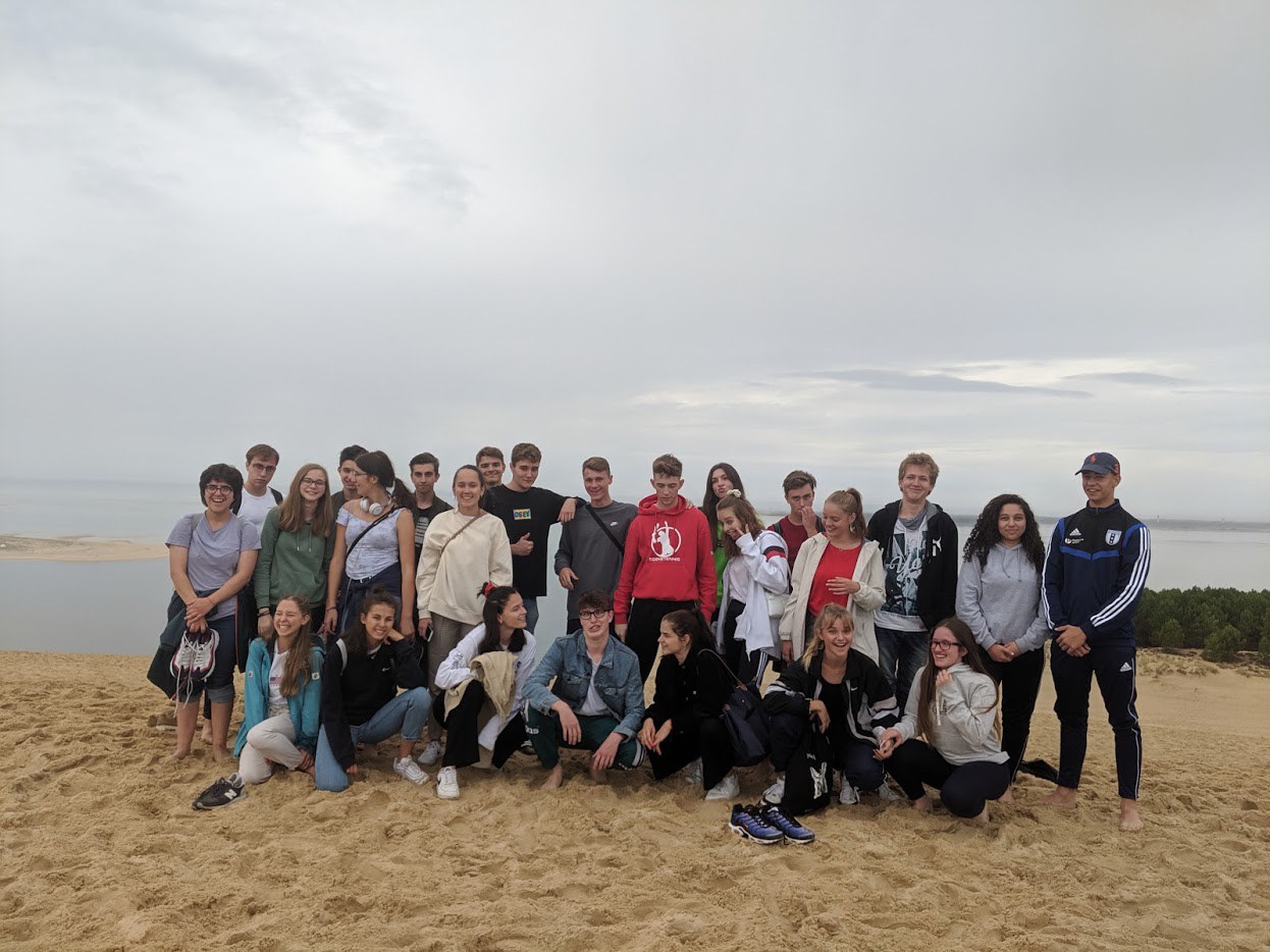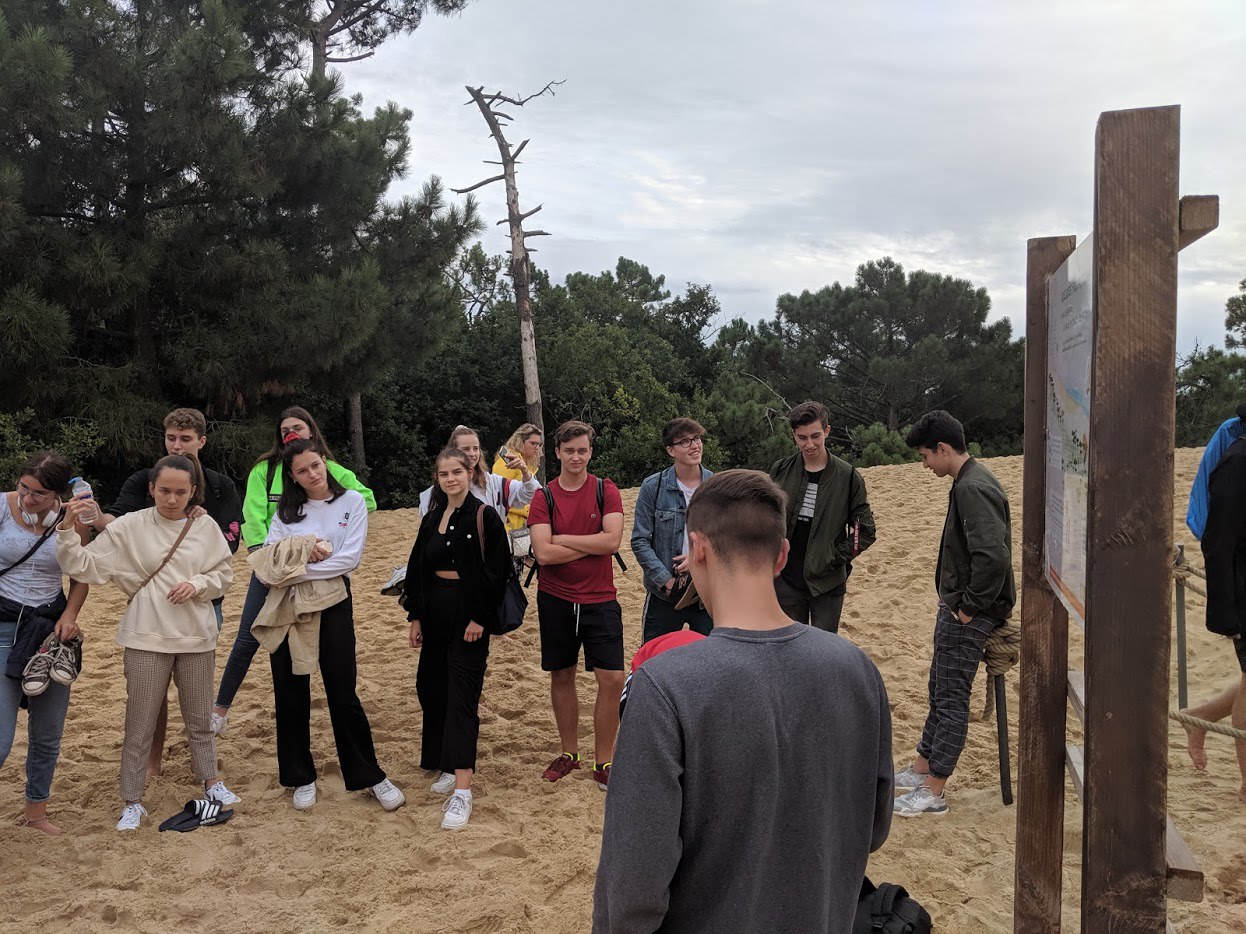 Am Montag, 23. September 2019 trafen wir uns zu sehr früher Morgenstunde – bereits um 5 Uhr – mit unseren beiden Begleitlehrpersonen Frau Hegnauer und Frau Ismaili am Euro-Airport. Bereits um 9 Uhr landeten wir in Bordeaux und reisten dann mit dem Zug nach Arcachon weiter, einem sehr schönen Städtchen am Atlantik. Unser erstes Ausflugsziel war ‚La Dune du Pilat‘, die grösste Düne Europas. Trotz Regen war die Aussicht auf den Atlantik eindrücklich und wir genossen unser Picknick in diesem einmaligen Ambiente.