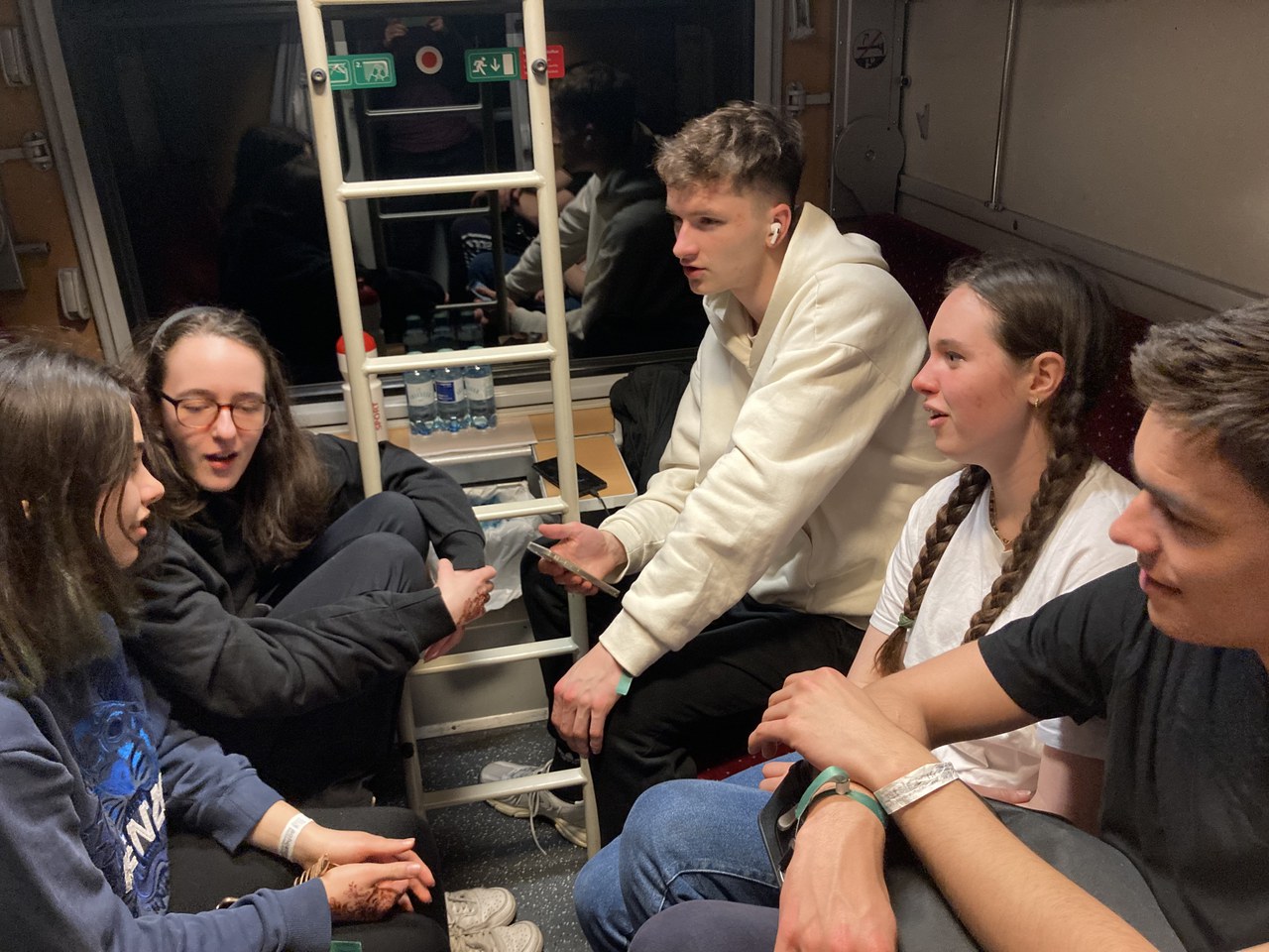 The trip started at 18:45 in Basel, when 5 delegates and one teacher made their way to Zürich HB. Upon arrival and after having stocked up on snacks, we headed to the night train that would take us to Graz. We boarded the train that would leave at 20:45 and settled into the cramped, albeit somewhat cosy, small compartment. Once everything had been put away, we had dinner and talked about our expectations and hopes for Graz.