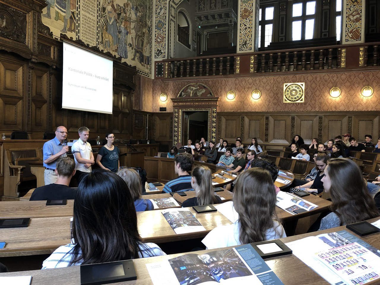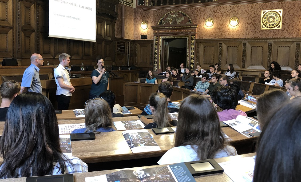 Die politische Bildung wird in einem eigens dafür geschaffenen Zeitgefäss im ersten Gymnasialjahr unterrichtet und im Rahmen einer Projektwoche behandelt. Damit verbunden sind ein Besuch im Grossen Rat Basel und die Diskussion mit Exekutiv- und Grossrats-Mitgliedern. Ausserdem soll ein auswärtiger Referent die vielfältigen globalen Vernetzungen der Schweiz aufzeigen und mit den Klassen diskutieren. Eine zusätzliche Vertiefung stellt eine schriftliche Gruppenarbeit dar, die sich einem politischen Thema widmet.