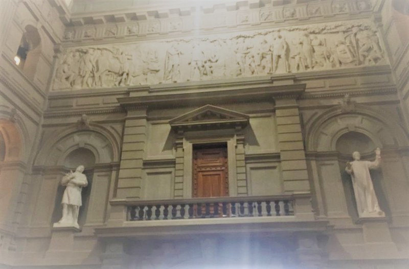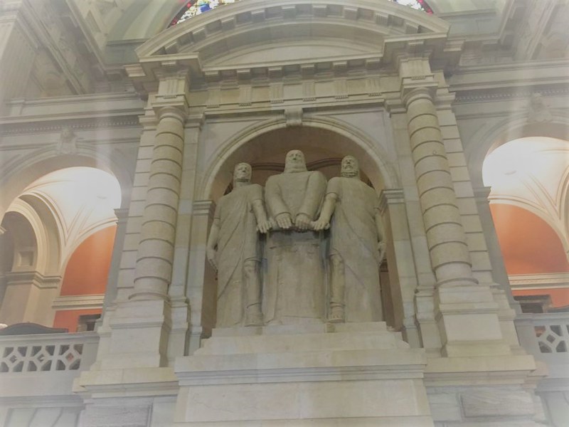 On the north side of the hall, at the top of the main staircase stands a large 24-ton statue of the “drei Eidgenossen”, representatives of the first three cantons, Uri, Schwyz and Unterwalden who, back in 1291 are said to have founded the original Swiss Confederation. The staircase is flanked by four bronze knights, each representing one of the four official languages spoken in Switzerland: German, French, Italian and Romansh. A balcony with a fake door should remind the Councillors that the people are sovereign.