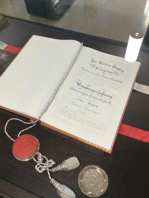 We were led into the hall of the Council of States (Ständerat) where unfortunately the debate had just ended. It was, however, still a fascinating experience to see the old paintings representing a Landsgemeinde, as well as the large electric chandelier installed in 1902, one of the first of its kind in Switzerland.