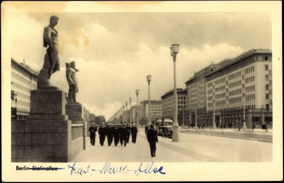 Mit hängender Zunge kamen wir schliesslich am letzten Punkt der Reise an, der ehemaligen Stalin-Allee, wo die DDR-Regierung unter ästhetischer Anleitung von Moskau eine Reihe gigantischer Prunkbauten hinsetzte, die nur mit Mühe noch als klassizistisch zu erkennen sind, sich letztlich aber auch hier aus dem üblichen Repertoire der Formensprache bedienten.