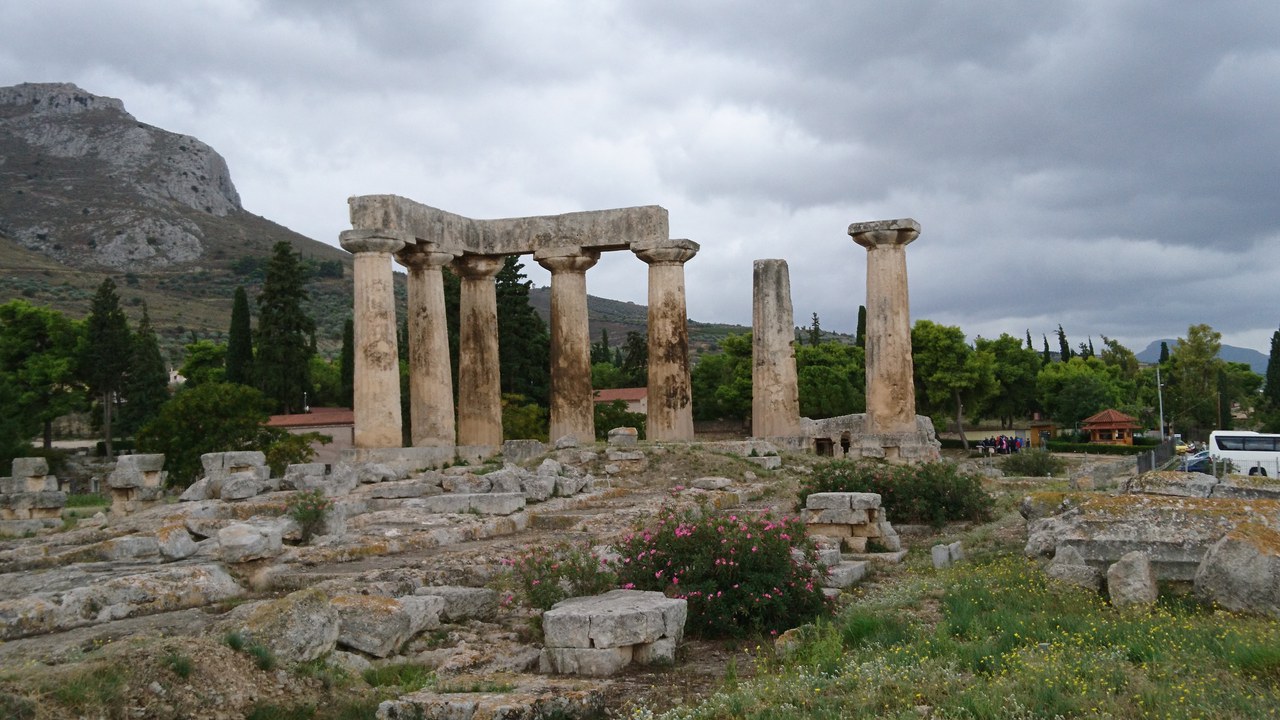 Unsere letzte Fahrt mit dem Bus führt Richtung Norden nach Korinth, wo George eine übersichtliche Führung über das archäologische Gelände gibt. Er erläutert dabei auch die verschiedenen zeitlichen Bauphasen. Am längsten bleiben wir aber vor den sieben übrig gebliebenen dorischen Säulen des Apollon-Tempels stehen. Ihre Wirkung ist faszinierend, sie stehen in der Landschaft und im Gelände, als ob sie natürlicherweise da hineingehörten. Wohl haben die Korinther darin, wie meist, aber hier deutlich, nicht nur eine Frömmigkeitsdemonstration gesehen, sondern auch ihre bedeutende Macht am Eingang zur Peloponnes hervorheben wollen. Die kurze Wanderung zum Aphrodite-Tempel auf Akro-Korinth machen nicht mehr alle mit. Das Wetter beginnt garstig zu werden. Aeolus lässt uns seine Kraft sehr deutlich spüren. Die Aussicht von der Bergspitze über den Korinthischen und Saronischen Golf ist umwerfend – und bei den starken, unkontrollierten Windstössen ist es doppelt schwierig, sich auf den Beinen zu halten.