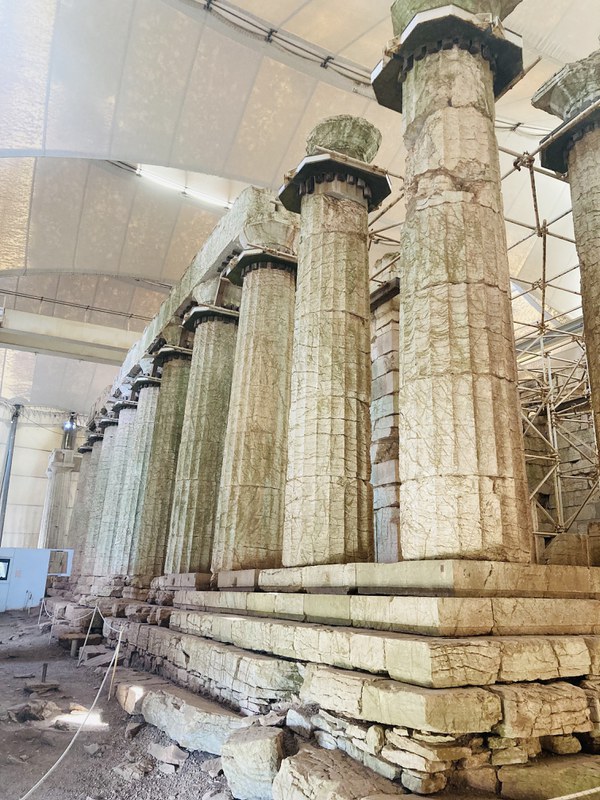 Am vierten Tag unserer Studienreise verliessen wir Olympia frühmorgens und machten uns auf den Weg zu unserer nächsten Zwischenstation, Nafplion. Unterwegs hielten wir nach kurvenreicher Fahrt, welche vielen von uns nicht so gut bekam, in Bassai und besichtigten den berühmten Apollon-Tempel. Dieser war, zum Schutz vor der Witterung, in ein ziemlich gewöhnungsbedürftiges Zelt eingepackt. Drinnen aber zeigte sich der Tempel sehr gut erhalten. Ein dorischer Ringsäulentempel (6 x 15 Säulen), der im Innern der Cella besondere Mauernzungen aufwies, die mit einer halbrunden ionischen Säule endeten. Und zu unser aller Überraschung hörten wir, dass im hintersten Teil der Cella eine einzelne korinthische Säule gestanden hat. Architektonisch insgesamt ein echtes Unikum, aber absolut sehenswert.